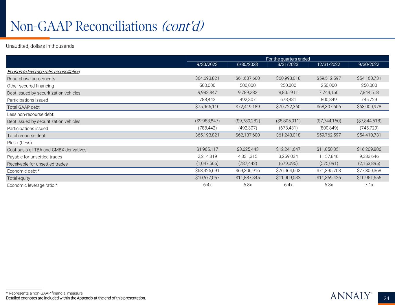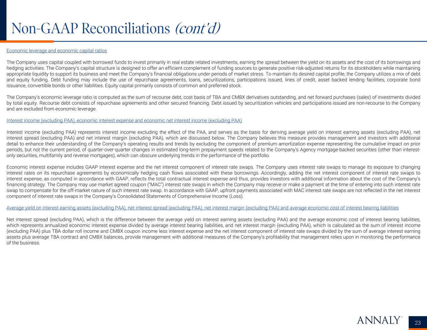 Non-GAAP Reconciliations (cont'd) 23 Economic leverage and economic capital ratios The Company uses capital coupled with borrowed funds to invest primarily in real estate related investments, earning the spread between the yield on its assets and the cost of its borrowings and hedging activities. The Company’s capital structure is designed to offer an efficient complement of funding sources to generate positive risk-adjusted returns for its stockholders while maintaining appropriate liquidity to support its business and meet the Company’s financial obligations under periods of market stress. To maintain its desired capital profile, the Company utilizes a mix of debt and equity funding. Debt funding may include the use of repurchase agreements, loans, securitizations, participations issued, lines of credit, asset backed lending facilities, corporate bond issuance, convertible bonds or other liabilities. Equity capital primarily consists of common and preferred stock. The Company’s economic leverage ratio is computed as the sum of recourse debt, cost basis of TBA and CMBX derivatives outstanding, and net forward purchases (sales) of investments divided by total equity. Recourse debt consists of repurchase agreements and other secured financing. Debt issued by securitization vehicles and participations issued are non-recourse to the Company and are excluded from economic leverage. Interest income (excluding PAA), economic interest expense and economic net interest income (excluding PAA) Interest income (excluding PAA) represents interest income excluding the effect of the PAA, and serves as the basis for deriving average yield on interest earning assets (excluding PAA), net interest spread (excluding PAA) and net interest margin (excluding PAA), which are discussed below. The Company believes this measure provides management and investors with additional detail to enhance their understanding of the Company’s operating results and trends by excluding the component of premium amortization expense representing the cumulative impact on prior periods, but not the current period, of quarter-over-quarter changes in estimated long-term prepayment speeds related to the Company’s Agency mortgage-backed securities (other than interest- only securities, multifamily and reverse mortgages), which can obscure underlying trends in the performance of the portfolio. Economic interest expense includes GAAP interest expense and the net interest component of interest rate swaps. The Company uses interest rate swaps to manage its exposure to changing interest rates on its repurchase agreements by economically hedging cash flows associated with these borrowings. Accordingly, adding the net interest component of interest rate swaps to interest expense, as computed in accordance with GAAP, reflects the total contractual interest expense and thus, provides investors with additional information about the cost of the Company's financing strategy. The Company may use market agreed coupon (“MAC”) interest rate swaps in which the Company may receive or make a payment at the time of entering into such interest rate swap to compensate for the off-market nature of such interest rate swap. In accordance with GAAP, upfront payments associated with MAC interest rate swaps are not reflected in the net interest component of interest rate swaps in the Company's Consolidated Statements of Comprehensive Income (Loss). Average yield on interest earning assets (excluding PAA), net interest spread (excluding PAA), net interest margin (excluding PAA) and average economic cost of interest bearing liabilities Net interest spread (excluding PAA), which is the difference between the average yield on interest earning assets (excluding PAA) and the average economic cost of interest bearing liabilities, which represents annualized economic interest expense divided by average interest bearing liabilities, and net interest margin (excluding PAA), which is calculated as the sum of interest income (excluding PAA) plus TBA dollar roll income and CMBX coupon income less interest expense and the net interest component of interest rate swaps divided by the sum of average interest earning assets plus average TBA contract and CMBX balances, provide management with additional measures of the Company’s profitability that management relies upon in monitoring the performance of the business.