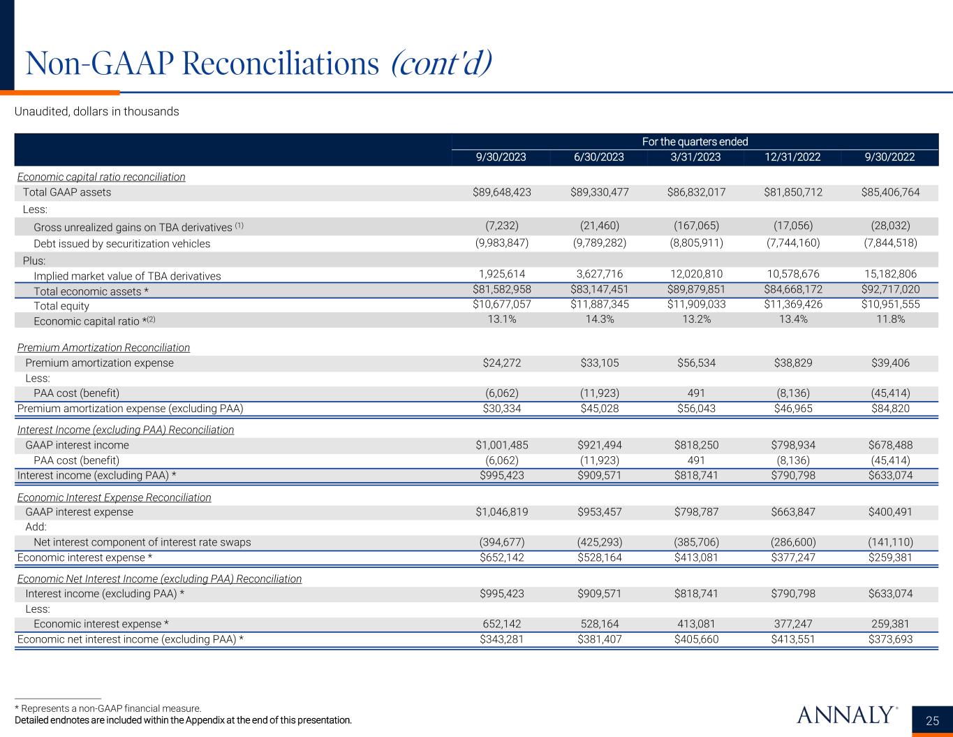 Non-GAAP Reconciliations (cont'd) 24 Unaudited, dollars in thousands For the quarters ended 9/30/2023 6/30/2023 3/31/2023 12/31/2022 9/30/2022 Economic leverage ratio reconciliation Repurchase agreements $64,693,821 $61,637,600 $60,993,018 $59,512,597 $54,160,731 Other secured financing 500,000 500,000 250,000 250,000 250,000 Debt issued by securitization vehicles 9,983,847 9,789,282 8,805,911 7,744,160 7,844,518 Participations issued 788,442 492,307 673,431 800,849 745,729 Total GAAP debt $75,966,110 $72,419,189 $70,722,360 $68,307,606 $63,000,978 Less non-recourse debt: Debt issued by securitization vehicles ($9,983,847) ($9,789,282) ($8,805,911) ($7,744,160) ($7,844,518) Participations issued (788,442) (492,307) (673,431) (800,849) (745,729) Total recourse debt $65,193,821 $62,137,600 $61,243,018 $59,762,597 $54,410,731 Plus / (Less): Cost basis of TBA and CMBX derivatives $1,965,117 $3,625,443 $12,241,647 $11,050,351 $16,209,886 Payable for unsettled trades 2,214,319 4,331,315 3,259,034 1,157,846 9,333,646 Receivable for unsettled trades (1,047,566) (787,442) (679,096) (575,091) (2,153,895) Economic debt * $68,325,691 $69,306,916 $76,064,603 $71,395,703 $77,800,368 Total equity $10,677,057 $11,887,345 $11,909,033 $11,369,426 $10,951,555 Economic leverage ratio * 6.4x 5.8x 6.4x 6.3x 7.1x * Represents a non-GAAP financial measure. Detailed endnotes are included within the Appendix at the end of this presentation.