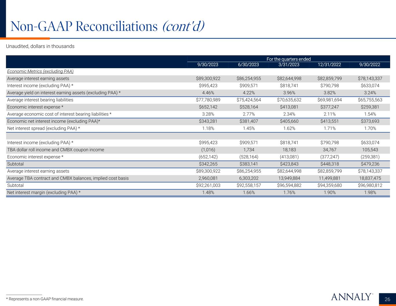 Non-GAAP Reconciliations (cont'd) 25 Unaudited, dollars in thousands * Represents a non-GAAP financial measure. Detailed endnotes are included within the Appendix at the end of this presentation. For the quarters ended 9/30/2023 6/30/2023 3/31/2023 12/31/2022 9/30/2022 Economic capital ratio reconciliation Total GAAP assets $89,648,423 $89,330,477 $86,832,017 $81,850,712 $85,406,764 Less: Gross unrealized gains on TBA derivatives (1) (7,232) (21,460) (167,065) (17,056) (28,032) Debt issued by securitization vehicles (9,983,847) (9,789,282) (8,805,911) (7,744,160) (7,844,518) Plus: Implied market value of TBA derivatives 1,925,614 3,627,716 12,020,810 10,578,676 15,182,806 Total economic assets * $81,582,958 $83,147,451 $89,879,851 $84,668,172 $92,717,020 Total equity $10,677,057 $11,887,345 $11,909,033 $11,369,426 $10,951,555 Economic capital ratio *(2) 13.1% 14.3% 13.2% 13.4% 11.8% Premium Amortization Reconciliation Premium amortization expense $24,272 $33,105 $56,534 $38,829 $39,406 Less: PAA cost (benefit) (6,062) (11,923) 491 (8,136) (45,414) Premium amortization expense (excluding PAA) $30,334 $45,028 $56,043 $46,965 $84,820 Interest Income (excluding PAA) Reconciliation GAAP interest income $1,001,485 $921,494 $818,250 $798,934 $678,488 PAA cost (benefit) (6,062) (11,923) 491 (8,136) (45,414) Interest income (excluding PAA) * $995,423 $909,571 $818,741 $790,798 $633,074 Economic Interest Expense Reconciliation GAAP interest expense $1,046,819 $953,457 $798,787 $663,847 $400,491 Add: Net interest component of interest rate swaps (394,677) (425,293) (385,706) (286,600) (141,110) Economic interest expense * $652,142 $528,164 $413,081 $377,247 $259,381 Economic Net Interest Income (excluding PAA) Reconciliation Interest income (excluding PAA) * $995,423 $909,571 $818,741 $790,798 $633,074 Less: Economic interest expense * 652,142 528,164 413,081 377,247 259,381 Economic net interest income (excluding PAA) * $343,281 $381,407 $405,660 $413,551 $373,693