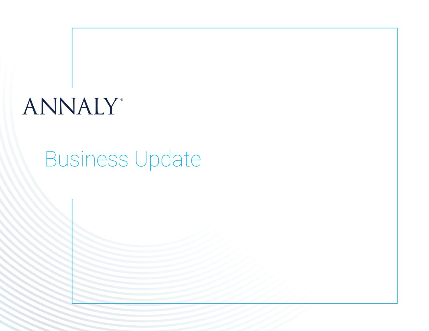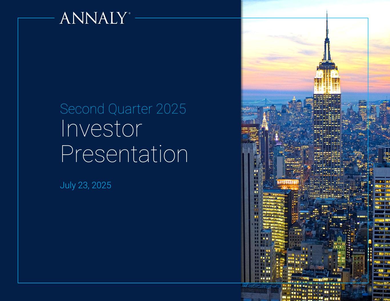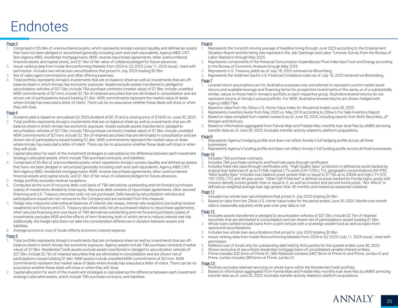 Endnotes 26 Page 3 1. Comprised of $5.9bn of unencumbered assets, which represents Annaly’s excess liquidity and defined as assets that have not been pledged or securitized (generally including cash and cash equivalents, Agency MBS, CRT, Non-Agency MBS, residential mortgage loans, MSR, reverse repurchase agreements, other unencumbered financial assets and capital stock), and $1.5bn of fair value of collateral pledged for future advances. 2. Issuer ranking data from Inside Nonconforming Markets from 2024 to Q2 2025 (July 11, 2025 issue). Used with permission. Includes two whole loan securitizations that priced in July 2025 totaling $0.9bn. 3. Net of sales agent commissions and other offering expenses. 4. Total portfolio represents Annaly’s investments that are on-balance sheet as well as investments that are off- balance sheet in which Annaly has economic exposure. Assets exclude assets transferred or pledged to securitization vehicles of $27.0bn, include TBA purchase contracts (market value) of $7.8bn, include unsettled MSR commitments of $21mm, include $2.7bn of retained securities that are eliminated in consolidation and are shown net of participations issued totaling $1.6bn. MSR commitments represent the market value of deals where Annaly has executed a letter of intent. There can be no assurance whether these deals will close or when they will close. Page 4 1. Dividend yield is based on annualized Q2 2025 dividend of $0.70 and a closing price of $18.82 on June 30, 2025. 2. Total portfolio represents Annaly’s investments that are on-balance sheet as well as investments that are off- balance sheet in which Annaly has economic exposure. Assets exclude assets transferred or pledged to securitization vehicles of $27.0bn, include TBA purchase contracts (market value) of $7.8bn, include unsettled MSR commitments of $21mm, include $2.7bn of retained securities that are eliminated in consolidation and are shown net of participations issued totaling $1.6bn. MSR commitments represent the market value of deals where Annaly has executed a letter of intent. There can be no assurance whether these deals will close or when they will close. 3. Capital allocation for each of the investment strategies is calculated as the difference between each investment strategy’s allocated assets, which include TBA purchase contracts, and liabilities. 4. Comprised of $5.9bn of unencumbered assets, which represents Annaly’s excess liquidity and defined as assets that have not been pledged or securitized (generally including cash and cash equivalents, Agency MBS, CRT, Non-Agency MBS, residential mortgage loans, MSR, reverse repurchase agreements, other unencumbered financial assets and capital stock), and $1.5bn of fair value of collateral pledged for future advances. 5. Hedge portfolio excludes receiver swaptions. 6. Computed as the sum of recourse debt, cost basis of TBA derivatives outstanding and net forward purchases (sales) of investments divided by total equity. Recourse debt consists of repurchase agreements, other secured financing and U.S. Treasury securities sold, not yet purchased. Debt issued by securitization vehicles and participations issued are non-recourse to the Company and are excluded from this measure. 7. Hedge ratio measures total notional balances of interest rate swaps, interest rate swaptions (excluding receiver swaptions) and futures and U.S. Treasury securities sold, not yet purchased relative to repurchase agreements, other secured financing and cost basis of TBA derivatives outstanding and net forward purchases (sales) of investments; excludes MSR and the effects of term financing, both of which serve to reduce interest rate risk. Additionally, the hedge ratio does not take into consideration differences in duration between assets and liabilities. 8. Average economic cost of funds reflects economic interest expense. Page 5 1. Total portfolio represents Annaly’s investments that are on-balance sheet as well as investments that are off- balance sheet in which Annaly has economic exposure. Agency assets include TBA purchase contracts (market value) of $7.8bn. Residential Credit assets exclude assets transferred or pledged to securitization vehicles of $27.0bn, include $2.7bn of retained securities that are eliminated in consolidation and are shown net of participations issued totaling $1.6bn. MSR assets include unsettled MSR commitments of $21mm. MSR commitments represent the market value of deals where Annaly has executed a letter of intent. There can be no assurance whether these deals will close or when they will close. 2. Capital allocation for each of the investment strategies is calculated as the difference between each investment strategy’s allocated assets, which include TBA purchase contracts, and liabilities. Page 6 1. Represents the 3-month moving average of headline hiring through June 2025 according to the Employment Situation Report and the hiring rate reported in the Job Openings and Labor Turnover Survey from the Bureau of Labor Statistics through May 2025. 2. Represents components of the Personal Consumption Expenditures Price Index less Food and Energy according to the Bureau of Economic Analysis through May 2025. 3. Represents U.S. Treasury yields as of July 18, 2025 retrieved via Bloomberg. 4. Represents the Goldman Sachs U.S. Financial Conditions Index as of July 18, 2025 retrieved via Bloomberg. Page 7 1. Levered return assumptions are for illustrative purposes only and attempt to represent current market asset returns and available leverage and financing terms for prospective investments of the same, or of a substantially similar, nature to those held in Annaly’s portfolio in each respective group. Illustrative levered returns do not represent returns of Annaly’s actual portfolio. For MSR, illustrative levered returns are shown hedged with Agency MBS/TBA. 2. Based on data from the Zillow U.S. Home Value Index for the period ended June 30, 2025. 3. Re