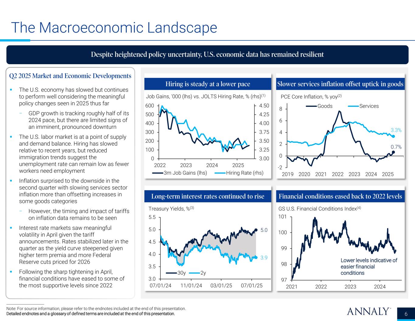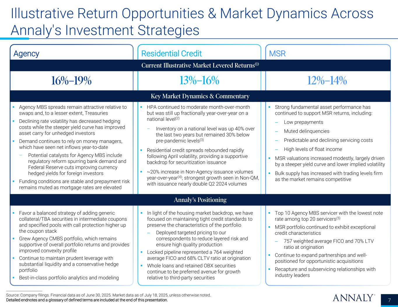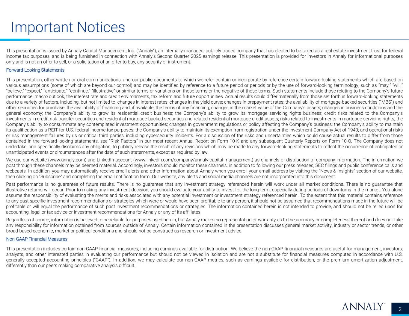 Important Notices 2 This presentation is issued by Annaly Capital Management, Inc. ("Annaly"), an internally-managed, publicly traded company that has elected to be taxed as a real estate investment trust for federal income tax purposes, and is being furnished in connection with Annaly’s Second Quarter 2025 earnings release. This presentation is provided for investors in Annaly for informational purposes only and is not an offer to sell, or a solicitation of an offer to buy, any security or instrument. Forward-Looking Statements This presentation, other written or oral communications, and our public documents to which we refer contain or incorporate by reference certain forward-looking statements which are based on various assumptions (some of which are beyond our control) and may be identified by reference to a future period or periods or by the use of forward-looking terminology, such as “may,” “will,” “believe,” “expect,” “anticipate,” “continue,” “illustrative” or similar terms or variations on those terms or the negative of those terms. Such statements include those relating to the Company’s future performance, macro outlook, the interest rate and credit environments, tax reform and future opportunities. Actual results could differ materially from those set forth in forward-looking statements due to a variety of factors, including, but not limited to, changes in interest rates; changes in the yield curve; changes in prepayment rates; the availability of mortgage-backed securities (“MBS”) and other securities for purchase; the availability of financing and, if available, the terms of any financing; changes in the market value of the Company’s assets; changes in business conditions and the general economy; the Company’s ability to grow its residential credit business; the Company's ability to grow its mortgage servicing rights business; credit risks related to the Company’s investments in credit risk transfer securities and residential mortgage-backed securities and related residential mortgage credit assets; risks related to investments in mortgage servicing rights; the Company’s ability to consummate any contemplated investment opportunities; changes in government regulations or policy affecting the Company’s business; the Company’s ability to maintain its qualification as a REIT for U.S. federal income tax purposes; the Company’s ability to maintain its exemption from registration under the Investment Company Act of 1940; and operational risks or risk management failures by us or critical third parties, including cybersecurity incidents. For a discussion of the risks and uncertainties which could cause actual results to differ from those contained in the forward-looking statements, see “Risk Factors” in our most recent Annual Report on Form 10-K and any subsequent Quarterly Reports on Form 10-Q. The Company does not undertake, and specifically disclaims any obligation, to publicly release the result of any revisions which may be made to any forward-looking statements to reflect the occurrence of anticipated or unanticipated events or circumstances after the date of such statements, except as required by law. We use our website (www.annaly.com) and LinkedIn account (www.linkedin.com/company/annaly-capital-management) as channels of distribution of company information. The information we post through these channels may be deemed material. Accordingly, investors should monitor these channels, in addition to following our press releases, SEC filings and public conference calls and webcasts. In addition, you may automatically receive email alerts and other information about Annaly when you enroll your email address by visiting the "News & Insights" section of our website, then clicking on "Subscribe" and completing the email notification form. Our website, any alerts and social media channels are not incorporated into this document. Past performance is no guarantee of future results. There is no guarantee that any investment strategy referenced herein will work under all market conditions. There is no guarantee that illustrative returns will occur. Prior to making any investment decision, you should evaluate your ability to invest for the long-term, especially during periods of downturns in the market. You alone assume the responsibility of evaluating the merits and risks associated with any potential investment or investment strategy referenced herein. To the extent that this material contains reference to any past specific investment recommendations or strategies which were or would have been profitable to any person, it should not be assumed that recommendations made in the future will be profitable or will equal the performance of such past investment recommendations or strategies. The information contained herein is not intended to provide, and should not be relied upon for accounting, legal or tax advice or investment recommendations for Annaly or any of its affiliates. Regardless of source, information is believed to be reliable for purposes used herein, but Annaly makes no representation or warranty as to the accuracy or completeness thereof and does not take any responsibility for information obtained from sources outside of Annaly. Certain information contained in the presentation discusses general market activity, industry or sector trends, or other broad-based economic, market or political conditions and should not be construed as research or investment advice. Non-GAAP Financial Measures This presentation includes certain non-GAAP financial measures, including earnings available for distribution. We believe the non-GAAP financial measures are useful for management, investors, analysts, and other interested parties in evaluating our performance but should not be viewed in isolation and are not a substitute for financial measures computed in accordance with U.S. generally accepted accounting principles (“GAAP”). In add