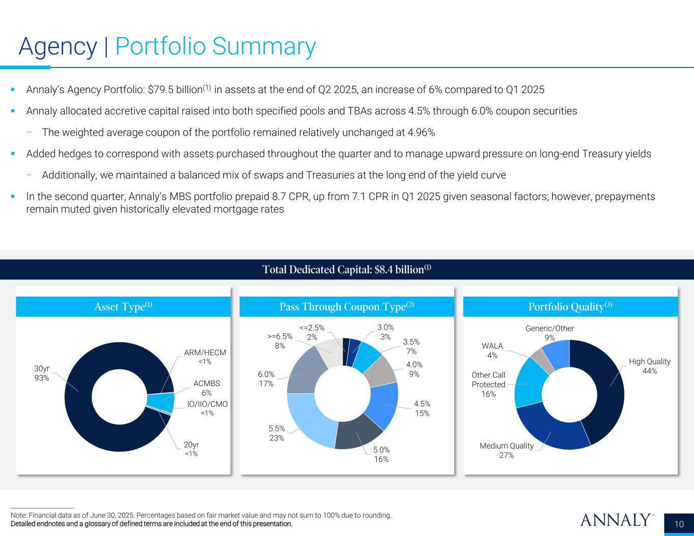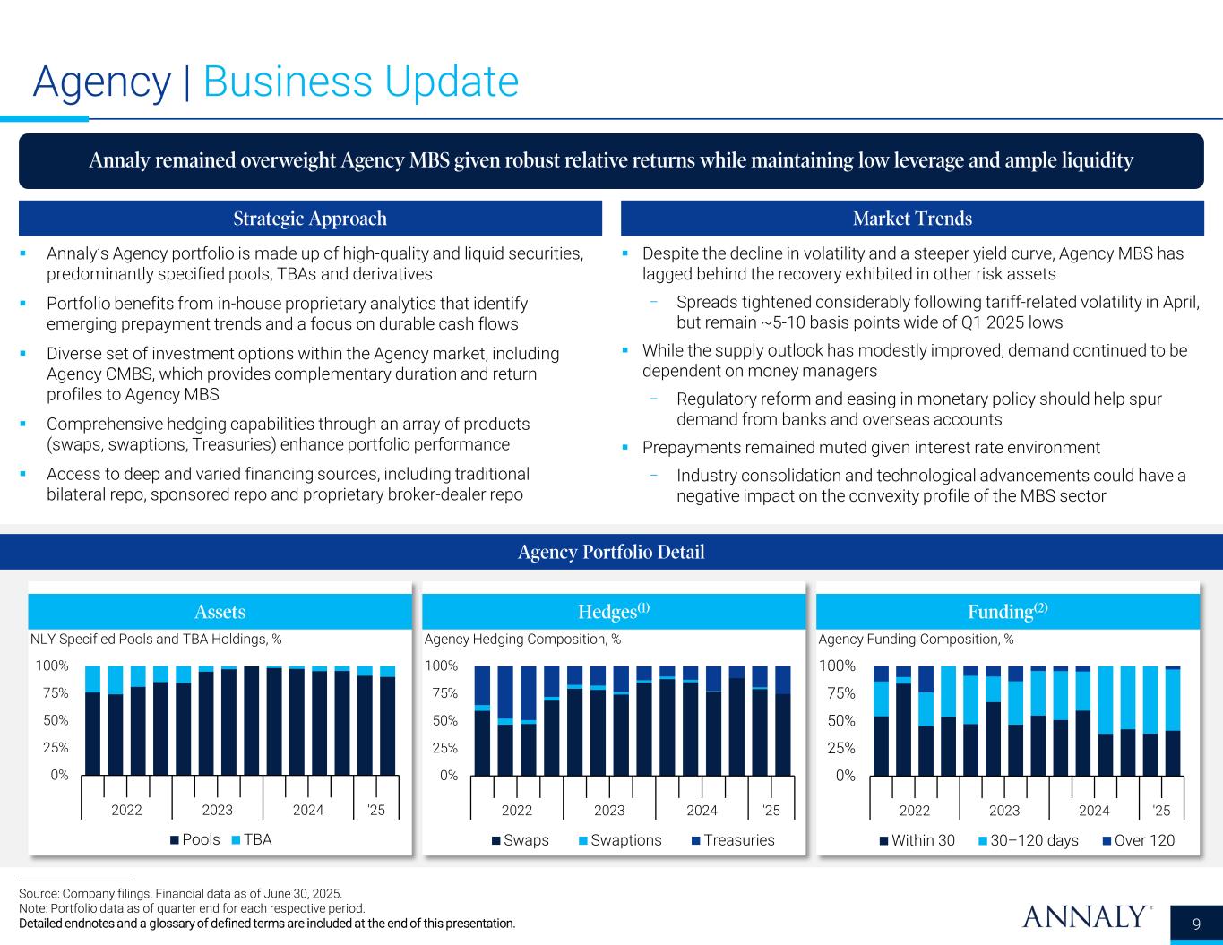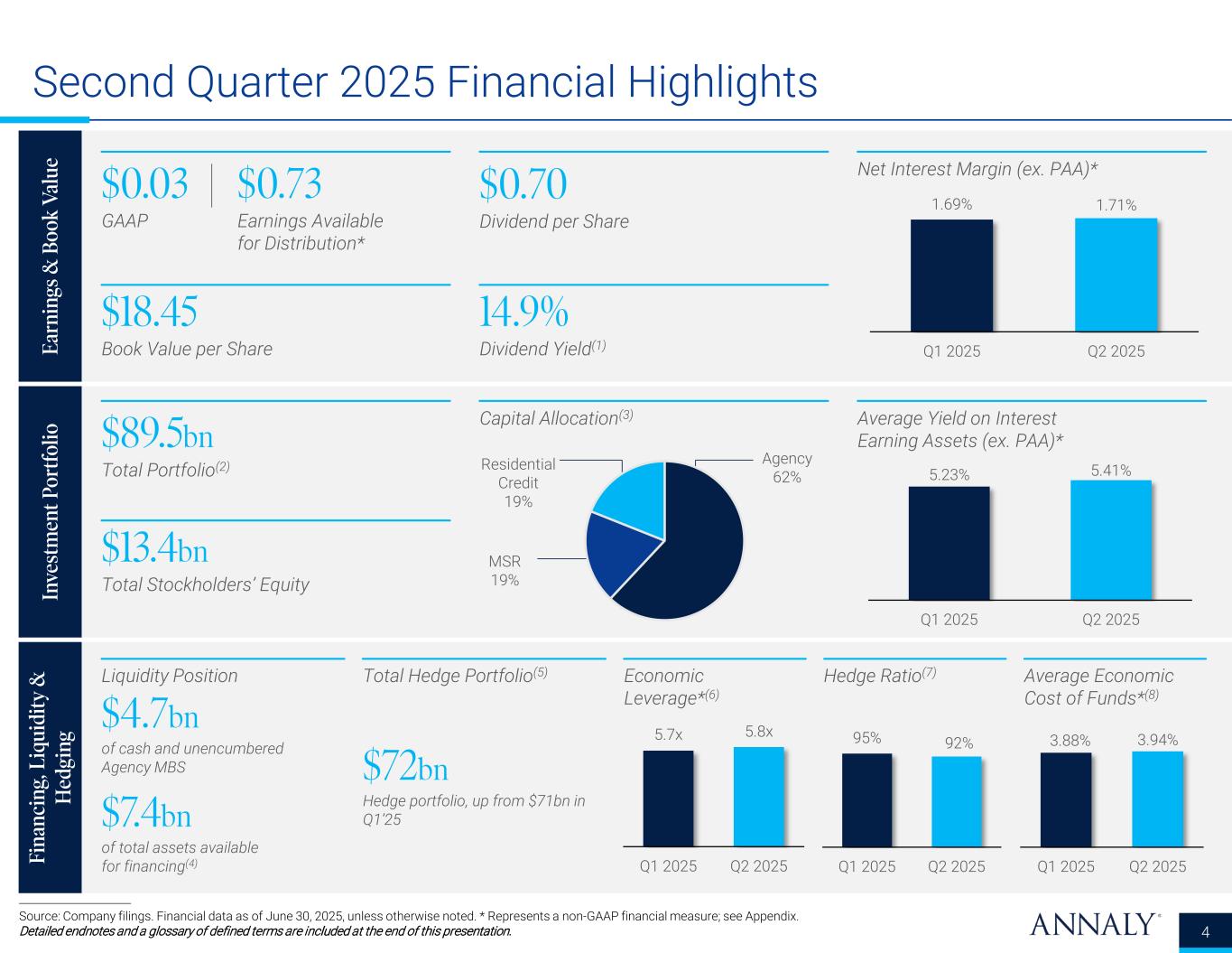 Recent Achievements and Performance Highlights Source: Company filings. Financial data as of June 30, 2025, unless otherwise noted. * Represents a non-GAAP financial measure; see Appendix. Detailed endnotes and a glossary of defined terms are included at the end of this presentation. Financial Performance Annaly generated Q2 earnings in excess of the dividend and delivered a strong economic return for the first half of the year  Earnings available for distribution* of $0.73 per average common share for the quarter  Book value per common share of $18.45  Declared quarterly common stock cash dividend to $0.70 per share  Economic return of 0.7% for the second quarter and 3.7% for the first half of 2025 Financing, Capital & Liquidity Annaly maintained its low leverage and ample liquidity during the quarter and continued its robust pace of securitization issuance  Economic leverage* of 5.8x, up from 5.7x in the first quarter  $7.4 billion of total assets available for financing(1), including cash and unencumbered Agency MBS of $4.7 billion  Annaly Residential Credit Group remains the largest non-bank issuer and the second largest issuer overall of Prime Jumbo and Expanded Credit MBS, pricing 15 residential whole loan securitizations totaling $7.6 billion in proceeds in 2025 year-to-date(2)  During the quarter, Annaly’s Residential Credit and MSR businesses increased financing capacity by $500 million through new and expanded credit facilities; total warehouse capacity across both Annaly’s Residential Credit and MSR businesses of $6.2 billion, including $2.6 billion of committed capacity  Average GAAP cost of interest-bearing liabilities of 4.76%, down 1 basis point quarter-over-quarter, and average economic cost of interest-bearing liabilities* of 3.94%, up 6 basis points quarter-over-quarter  Raised $761 million of accretive common equity through the Company’s at-the-market sales program during the quarter(3) Portfolio Performance Annaly continued to allocate incremental capital to Agency MBS during the quarter given opportunity for returns  Total portfolio of $89.5 billion(4), including $79.5 billion in highly liquid Agency MBS strategy, which represents 89% of total assets and 62% of dedicated capital  During the quarter, Annaly’s Agency portfolio increased by 6% with portfolio activity focused on allocating accretive capital raised into both specified pools and TBA securities across 4.5% through 6.0% coupons  Annaly’s Residential Credit portfolio was relatively unchanged at $6.6 billion(4) driven by record quarterly securitization issuance; correspondent channel activity remained strong with lock volume and total funded volume in line with the prior quarter at $5.3 billion and $3.7 billion, respectively – Proactively tightened credit standards given deceleration in the housing market  Annaly’s MSR portfolio was unchanged at $3.3 billion(4) in market value, representing 19% of dedicated capital at the end of the quarter 3