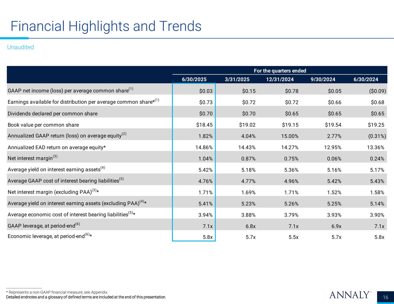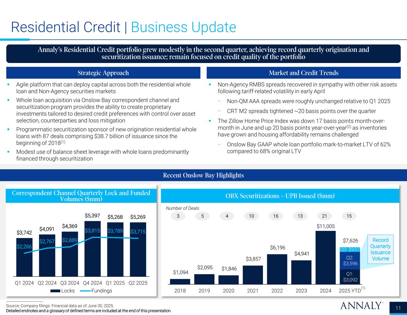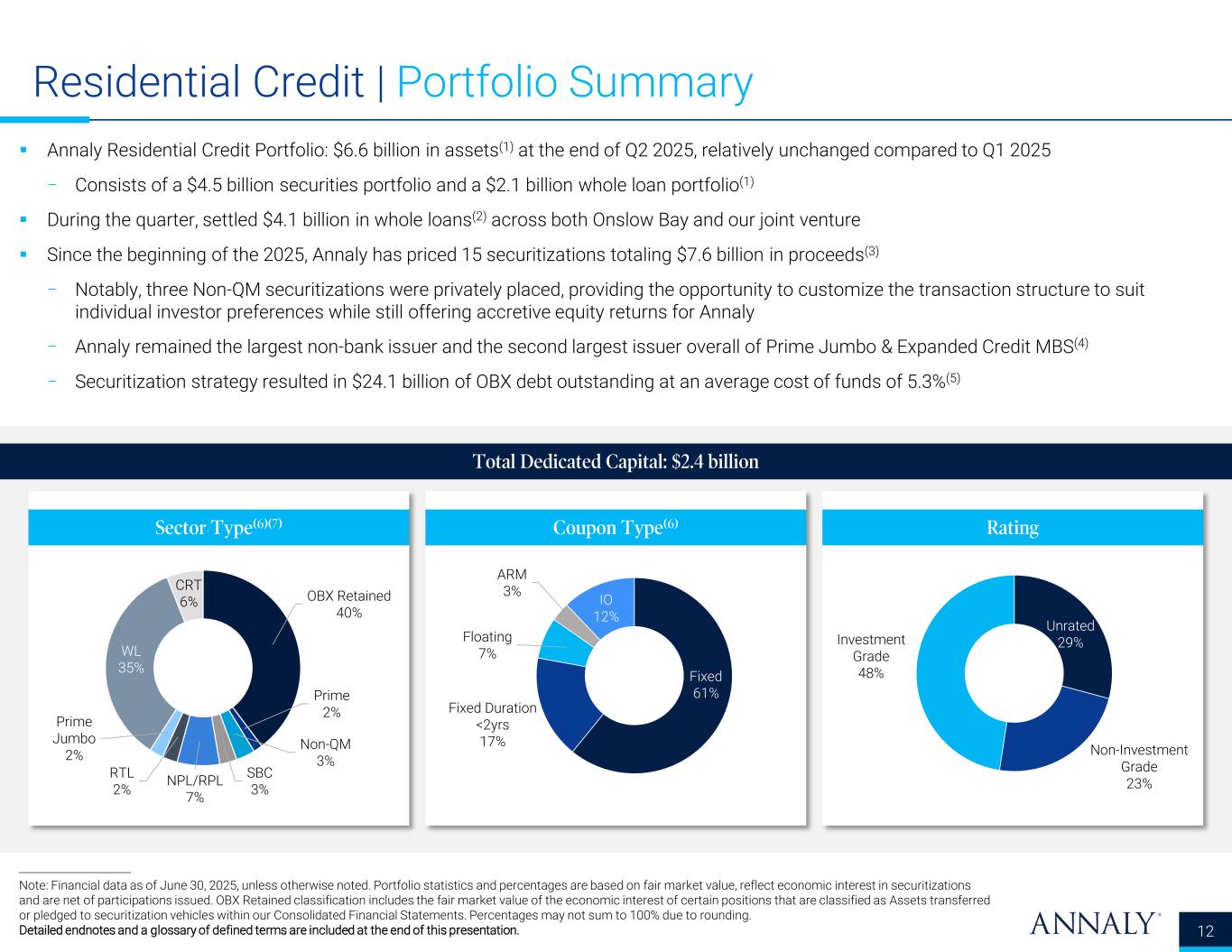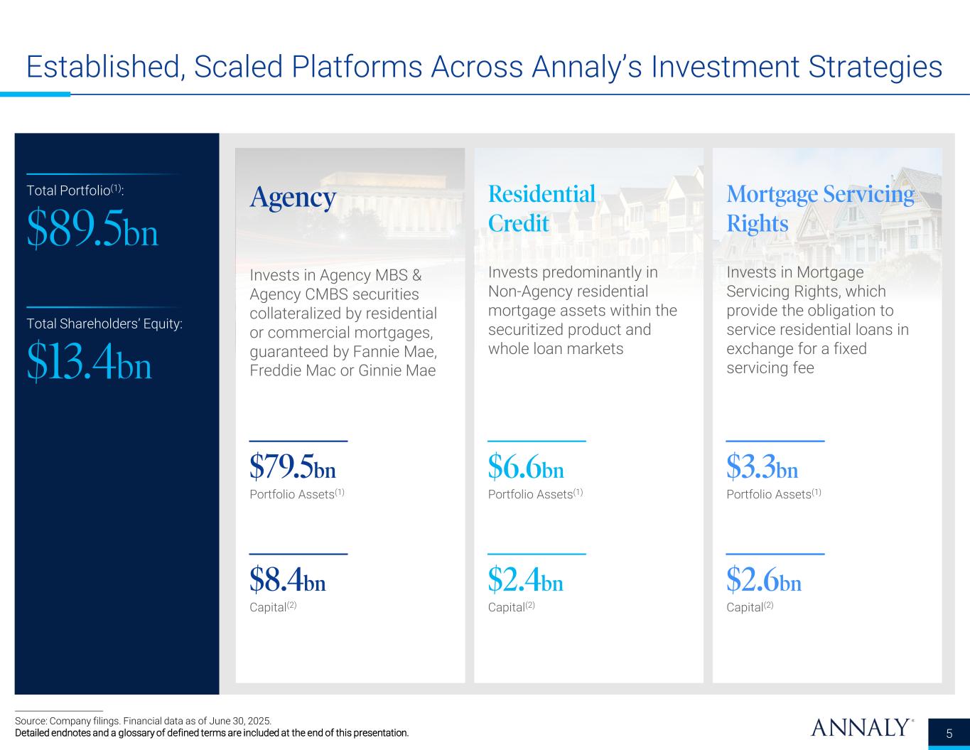 Recent Achievements and Performance Highlights Source: Company filings. Financial data as of June 30, 2025, unless otherwise noted. * Represents a non-GAAP financial measure; see Appendix. Detailed endnotes and a glossary of defined terms are included at the end of this presentation. Financial Performance Annaly generated Q2 earnings in excess of the dividend and delivered a strong economic return for the first half of the year  Earnings available for distribution* of $0.73 per average common share for the quarter  Book value per common share of $18.45  Declared quarterly common stock cash dividend to $0.70 per share  Economic return of 0.7% for the second quarter and 3.7% for the first half of 2025 Financing, Capital & Liquidity Annaly maintained its low leverage and ample liquidity during the quarter and continued its robust pace of securitization issuance  Economic leverage* of 5.8x, up from 5.7x in the first quarter  $7.4 billion of total assets available for financing(1), including cash and unencumbered Agency MBS of $4.7 billion  Annaly Residential Credit Group remains the largest non-bank issuer and the second largest issuer overall of Prime Jumbo and Expanded Credit MBS, pricing 15 residential whole loan securitizations totaling $7.6 billion in proceeds in 2025 year-to-date(2)  During the quarter, Annaly’s Residential Credit and MSR businesses increased financing capacity by $500 million through new and expanded credit facilities; total warehouse capacity across both Annaly’s Residential Credit and MSR businesses of $6.2 billion, including $2.6 billion of committed capacity  Average GAAP cost of interest-bearing liabilities of 4.76%, down 1 basis point quarter-over-quarter, and average economic cost of interest-bearing liabilities* of 3.94%, up 6 basis points quarter-over-quarter  Raised $761 million of accretive common equity through the Company’s at-the-market sales program during the quarter(3) Portfolio Performance Annaly continued to allocate incremental capital to Agency MBS during the quarter given opportunity for returns  Total portfolio of $89.5 billion(4), including $79.5 billion in highly liquid Agency MBS strategy, which represents 89% of total assets and 62% of dedicated capital  During the quarter, Annaly’s Agency portfolio increased by 6% with portfolio activity focused on allocating accretive capital raised into both specified pools and TBA securities across 4.5% through 6.0% coupons  Annaly’s Residential Credit portfolio was relatively unchanged at $6.6 billion(4) driven by record quarterly securitization issuance; correspondent channel activity remained strong with lock volume and total funded volume in line with the prior quarter at $5.3 billion and $3.7 billion, respectively – Proactively tightened credit standards given deceleration in the housing market  Annaly’s MSR portfolio was unchanged at $3.3 billion(4) in market value, representing 19% of dedicated capital at the end of the quarter 3