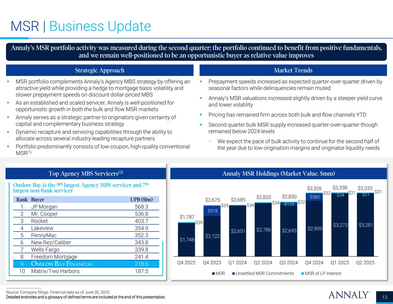 Residential Credit | Portfolio Summary  Annaly Residential Credit Portfolio: $6.6 billion in assets(1) at the end of Q2 2025, relatively unchanged compared to Q1 2025 − Consists of a $4.5 billion securities portfolio and a $2.1 billion whole loan portfolio(1)  During the quarter, settled $4.1 billion in whole loans(2) across both Onslow Bay and our joint venture  Since the beginning of the 2025, Annaly has priced 15 securitizations totaling $7.6 billion in proceeds(3) − Notably, three Non-QM securitizations were privately placed, providing the opportunity to customize the transaction structure to suit individual investor preferences while still offering accretive equity returns for Annaly − Annaly remained the largest non-bank issuer and the second largest issuer overall of Prime Jumbo & Expanded Credit MBS(4) − Securitization strategy resulted in $24.1 billion of OBX debt outstanding at an average cost of funds of 5.3%(5) 12 Note: Financial data as of June 30, 2025, unless otherwise noted. Portfolio statistics and percentages are based on fair market value, reflect economic interest in securitizations and are net of participations issued. OBX Retained classification includes the fair market value of the economic interest of certain positions that are classified as Assets transferred or pledged to securitization vehicles within our Consolidated Financial Statements. Percentages may not sum to 100% due to rounding. Detailed endnotes and a glossary of defined terms are included at the end of this presentation. Total Dedicated Capital: $2.4 billion Sector Type(6)(7) Coupon Type(6) Rating OBX Retained 40% Prime 2% Non-QM 3% SBC 3%NPL/RPL 7% RTL 2% Prime Jumbo 2% WL 35% CRT 6% Fixed 61% Fixed Duration <2yrs 17% Floating 7% ARM 3% IO 12% Unrated 29% Non-Investment Grade 23% Investment Grade 48%