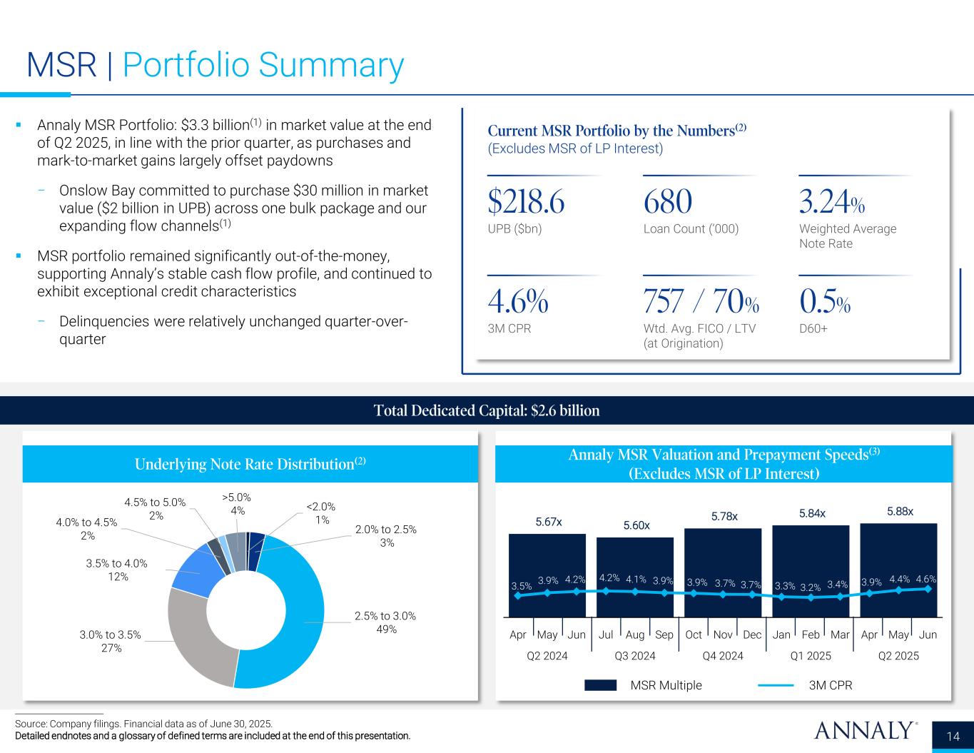 MSR | Business Update 13 Source: Company filings. Financial data as of June 30, 2025. Detailed endnotes and a glossary of defined terms are included at the end of this presentation. Annaly’s MSR portfolio activity was measured during the second quarter; the portfolio continued to benefit from positive fundamentals, and we remain well-positioned to be an opportunistic buyer as relative value improves  MSR portfolio complements Annaly’s Agency MBS strategy by offering an attractive yield while providing a hedge to mortgage basis volatility and slower prepayment speeds on discount dollar-priced MBS  As an established and scaled servicer, Annaly is well-positioned for opportunistic growth in both the bulk and flow MSR markets  Annaly serves as a strategic partner to originators given certainty of capital and complementary business strategy  Dynamic recapture and servicing capabilities through the ability to allocate across several industry-leading recapture partners  Portfolio predominantly consists of low coupon, high-quality conventional MSR(1) Strategic Approach  Prepayment speeds increased as expected quarter-over-quarter driven by seasonal factors while delinquencies remain muted  Annaly’s MSR valuations increased slightly driven by a steeper yield curve and lower volatility  Pricing has remained firm across both bulk and flow channels YTD  Second quarter bulk MSR supply increased quarter-over-quarter though remained below 2024 levels − We expect the pace of bulk activity to continue for the second half of the year due to low origination margins and originator liquidity needs Market Trends Annaly MSR Holdings (Market Value, $mm)Top Agency MBS Servicers(2) Rank Buyer UPB ($bn) 1 JP Morgan 568.3 2 Mr. Cooper 536.8 3 Rocket 403.7 4 Lakeview 354.9 5 PennyMac 352.3 6 New Rez/Caliber 343.8 7 Wells Fargo 339.8 8 Freedom Mortgage 241.4 9 218.6 10 Matrix/Two Harbors 187.5 Onslow Bay is the 9th largest Agency MBS servicer and 7th largest non-bank servicer $1,748 $2,122 $2,651 $2,786 $2,693 $2,909 $3,273 $3,281 $518 $125 $385 $34 $21 $39 $35 $34 $34 $32 $32 $31 $31 $1,787 $2,675 $2,685 $2,820 $2,850 $3,326 $3,338 $3,333 Q4 2022 Q4 2023 Q1 2024 Q2 2024 Q3 2024 Q4 2024 Q1 2025 Q2 2025 MSR Unsettled MSR Commitments MSR of LP Interest