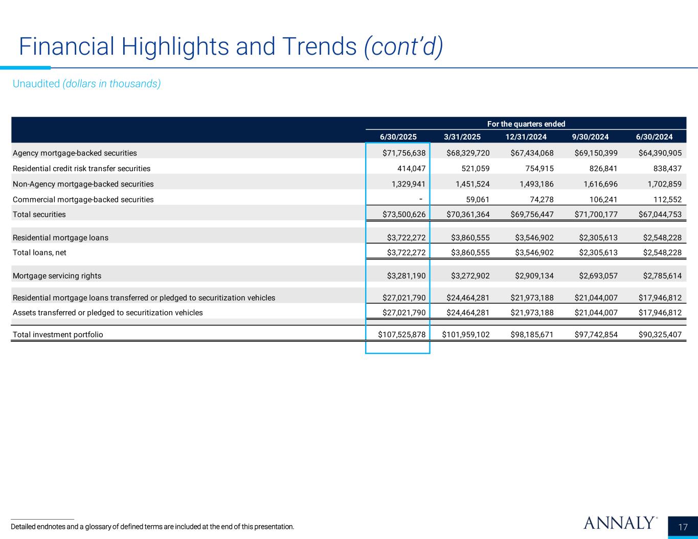 Financial Highlights and Trends 16 * Represents a non-GAAP financial measure; see Appendix. Detailed endnotes and a glossary of defined terms are included at the end of this presentation. Unaudited For the quarters ended 6/30/2025 3/31/2025 12/31/2024 9/30/2024 6/30/2024 GAAP net income (loss) per average common share(1) $0.03 $0.15 $0.78 $0.05 ($0.09) Earnings available for distribution per average common share*(1) $0.73 $0.72 $0.72 $0.66 $0.68 Dividends declared per common share $0.70 $0.70 $0.65 $0.65 $0.65 Book value per common share $18.45 $19.02 $19.15 $19.54 $19.25 Annualized GAAP return (loss) on average equity(2) 1.82% 4.04% 15.00% 2.77% (0.31%) Annualized EAD return on average equity* 14.86% 14.43% 14.27% 12.95% 13.36% Net interest margin(3) 1.04% 0.87% 0.75% 0.06% 0.24% Average yield on interest earning assets(4) 5.42% 5.18% 5.36% 5.16% 5.17% Average GAAP cost of interest bearing liabilities(5) 4.76% 4.77% 4.96% 5.42% 5.43% Net interest margin (excluding PAA)(3)* 1.71% 1.69% 1.71% 1.52% 1.58% Average yield on interest earning assets (excluding PAA)(4)* 5.41% 5.23% 5.26% 5.25% 5.14% Average economic cost of interest bearing liabilities(5)* 3.94% 3.88% 3.79% 3.93% 3.90% GAAP leverage, at period-end(6) 7.1x 6.8x 7.1x 6.9x 7.1x Economic leverage, at period-end(6)* 5.8x 5.7x 5.5x 5.7x 5.8x