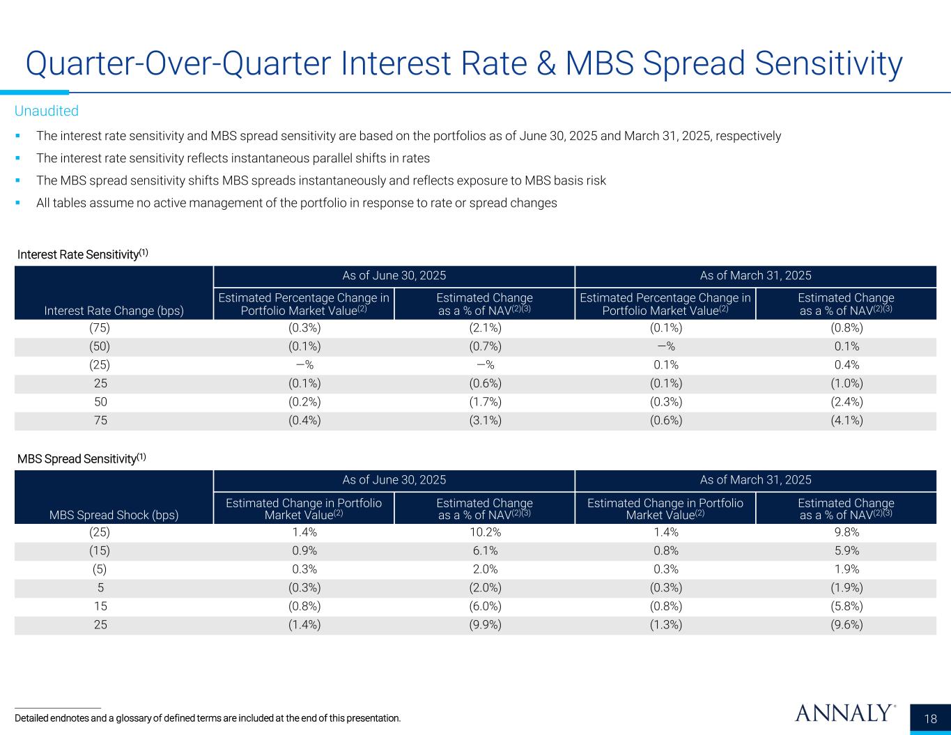 Quarter-Over-Quarter Interest Rate & MBS Spread Sensitivity  The interest rate sensitivity and MBS spread sensitivity are based on the portfolios as of June 30, 2025 and March 31, 2025, respectively  The interest rate sensitivity reflects instantaneous parallel shifts in rates  The MBS spread sensitivity shifts MBS spreads instantaneously and reflects exposure to MBS basis risk  All tables assume no active management of the portfolio in response to rate or spread changes 18 Unaudited Interest Rate Sensitivity(1) Interest Rate Change (bps) As of June 30, 2025 As of March 31, 2025 Estimated Percentage Change in Portfolio Market Value(2) Estimated Change as a % of NAV(2)(3) Estimated Percentage Change in Portfolio Market Value(2) Estimated Change as a % of NAV(2)(3) (75) (0.3%) (2.1%) (0.1%) (0.8%) (50) (0.1%) (0.7%) —% 0.1% (25) —% —% 0.1% 0.4% 25 (0.1%) (0.6%) (0.1%) (1.0%) 50 (0.2%) (1.7%) (0.3%) (2.4%) 75 (0.4%) (3.1%) (0.6%) (4.1%) MBS Spread Sensitivity(1) MBS Spread Shock (bps) As of June 30, 2025 As of March 31, 2025 Estimated Change in Portfolio Market Value(2) Estimated Change as a % of NAV(2)(3) Estimated Change in Portfolio Market Value(2) Estimated Change as a % of NAV(2)(3) (25) 1.4% 10.2% 1.4% 9.8% (15) 0.9% 6.1% 0.8% 5.9% (5) 0.3% 2.0% 0.3% 1.9% 5 (0.3%) (2.0%) (0.3%) (1.9%) 15 (0.8%) (6.0%) (0.8%) (5.8%) 25 (1.4%) (9.9%) (1.3%) (9.6%) Detailed endnotes and a glossary of defined terms are included at the end of this presentation.