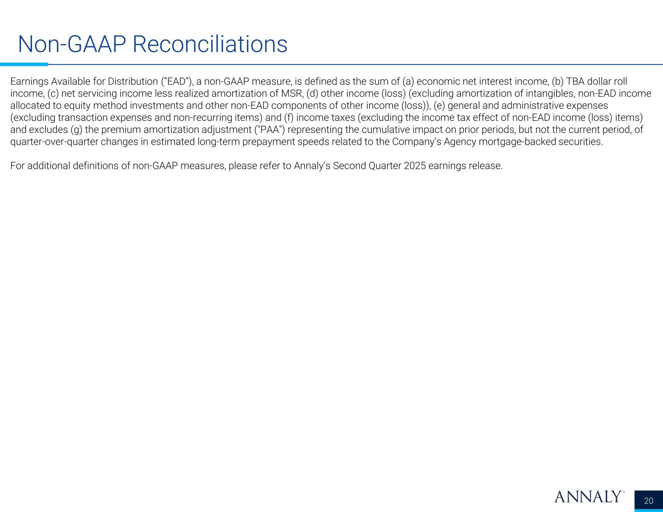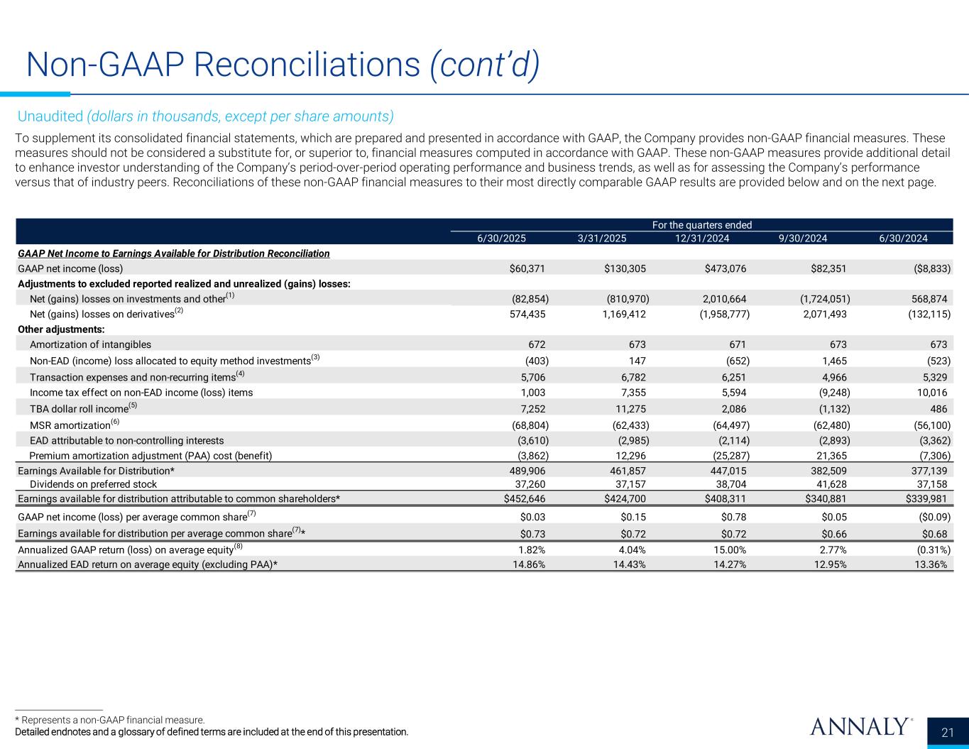 Non-GAAP Reconciliations 20 Earnings Available for Distribution (“EAD”), a non-GAAP measure, is defined as the sum of (a) economic net interest income, (b) TBA dollar roll income, (c) net servicing income less realized amortization of MSR, (d) other income (loss) (excluding amortization of intangibles, non-EAD income allocated to equity method investments and other non-EAD components of other income (loss)), (e) general and administrative expenses (excluding transaction expenses and non-recurring items) and (f) income taxes (excluding the income tax effect of non-EAD income (loss) items) and excludes (g) the premium amortization adjustment ("PAA") representing the cumulative impact on prior periods, but not the current period, of quarter-over-quarter changes in estimated long-term prepayment speeds related to the Company’s Agency mortgage-backed securities. For additional definitions of non-GAAP measures, please refer to Annaly’s Second Quarter 2025 earnings release.