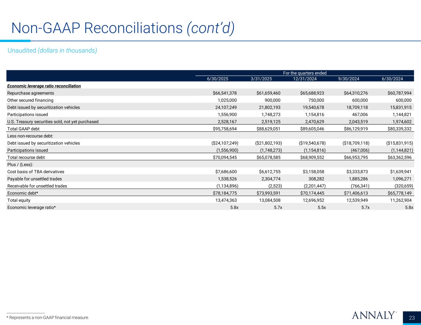 Non-GAAP Reconciliations (cont’d) 23 Unaudited (dollars in thousands) * Represents a non-GAAP financial measure. For the quarters ended 6/30/2025 3/31/2025 12/31/2024 9/30/2024 6/30/2024 Economic leverage ratio reconciliation Repurchase agreements $66,541,378 $61,659,460 $65,688,923 $64,310,276 $60,787,994 Other secured financing 1,025,000 900,000 750,000 600,000 600,000 Debt issued by securitization vehicles 24,107,249 21,802,193 19,540,678 18,709,118 15,831,915 Participations issued 1,556,900 1,748,273 1,154,816 467,006 1,144,821 U.S. Treasury securities sold, not yet purchased 2,528,167 2,519,125 2,470,629 2,043,519 1,974,602 Total GAAP debt $95,758,694 $88,629,051 $89,605,046 $86,129,919 $80,339,332 Less non-recourse debt: Debt issued by securitization vehicles ($24,107,249) ($21,802,193) ($19,540,678) ($18,709,118) ($15,831,915) Participations issued (1,556,900) (1,748,273) (1,154,816) (467,006) (1,144,821) Total recourse debt $70,094,545 $65,078,585 $68,909,552 $66,953,795 $63,362,596 Plus / (Less): Cost basis of TBA derivatives $7,686,600 $6,612,755 $3,158,058 $3,333,873 $1,639,941 Payable for unsettled trades 1,538,526 2,304,774 308,282 1,885,286 1,096,271 Receivable for unsettled trades (1,134,896) (2,523) (2,201,447) (766,341) (320,659) Economic debt* $78,184,775 $73,993,591 $70,174,445 $71,406,613 $65,778,149 Total equity 13,474,363 13,084,508 12,696,952 12,539,949 11,262,904 Economic leverage ratio* 5.8x 5.7x 5.5x 5.7x 5.8x