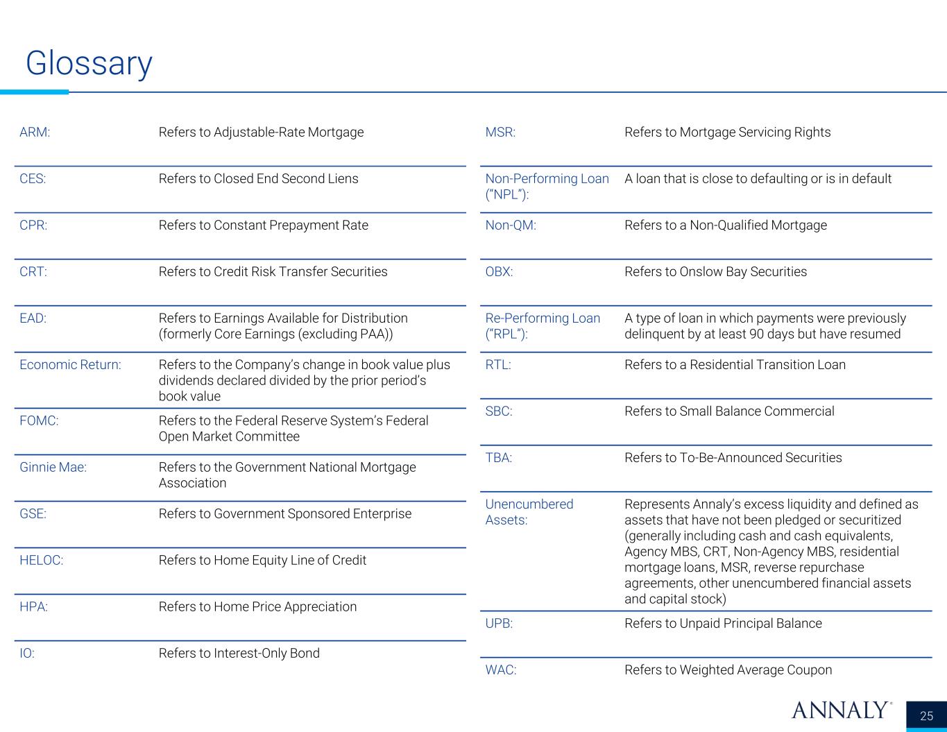 Glossary 25 ARM: Refers to Adjustable-Rate Mortgage CES: Refers to Closed End Second Liens CPR: Refers to Constant Prepayment Rate CRT: Refers to Credit Risk Transfer Securities EAD: Refers to Earnings Available for Distribution (formerly Core Earnings (excluding PAA)) Economic Return: Refers to the Company’s change in book value plus dividends declared divided by the prior period’s book value FOMC: Refers to the Federal Reserve System’s Federal Open Market Committee Ginnie Mae: Refers to the Government National Mortgage Association GSE: Refers to Government Sponsored Enterprise HELOC: Refers to Home Equity Line of Credit HPA: Refers to Home Price Appreciation IO: Refers to Interest-Only Bond MSR: Refers to Mortgage Servicing Rights Non-Performing Loan (“NPL”): A loan that is close to defaulting or is in default Non-QM: Refers to a Non-Qualified Mortgage OBX: Refers to Onslow Bay Securities Re-Performing Loan (“RPL”): A type of loan in which payments were previously delinquent by at least 90 days but have resumed RTL: Refers to a Residential Transition Loan SBC: Refers to Small Balance Commercial TBA: Refers to To-Be-Announced Securities Unencumbered Assets: Represents Annaly’s excess liquidity and defined as assets that have not been pledged or securitized (generally including cash and cash equivalents, Agency MBS, CRT, Non-Agency MBS, residential mortgage loans, MSR, reverse repurchase agreements, other unencumbered financial assets and capital stock) UPB: Refers to Unpaid Principal Balance WAC: Refers to Weighted Average Coupon