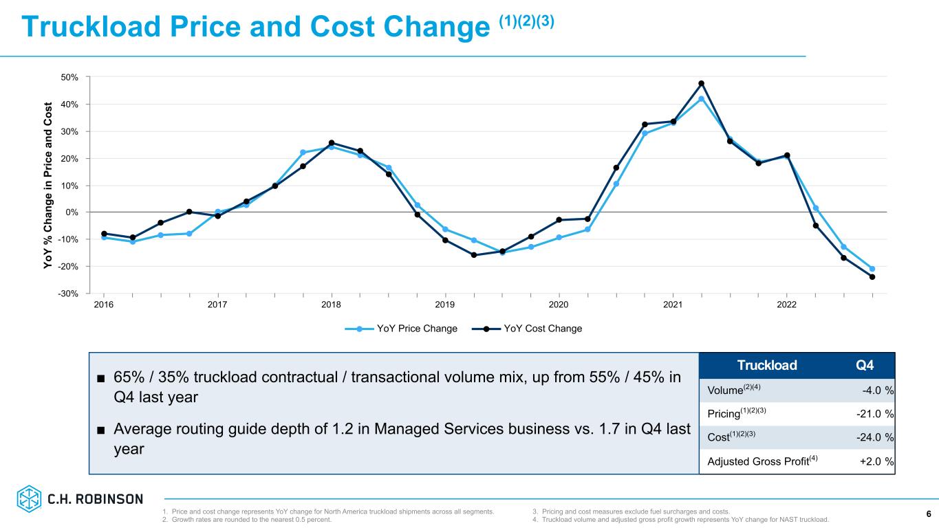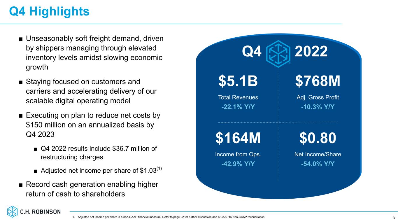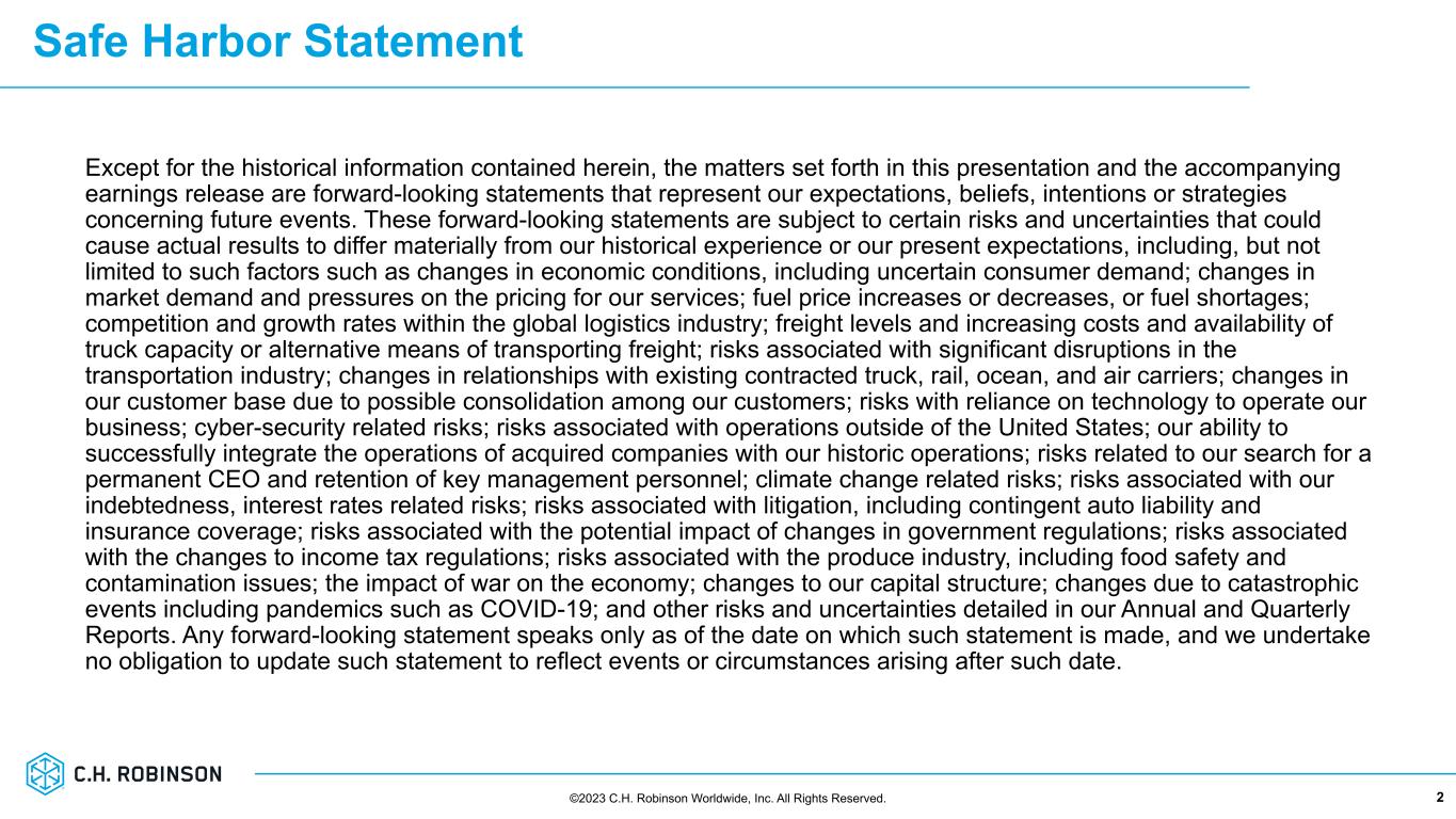 Safe Harbor Statement Except for the historical information contained herein, the matters set forth in this presentation and the accompanying earnings release are forward-looking statements that represent our expectations, beliefs, intentions or strategies concerning future events. These forward-looking statements are subject to certain risks and uncertainties that could cause actual results to differ materially from our historical experience or our present expectations, including, but not limited to such factors such as changes in economic conditions, including uncertain consumer demand; changes in market demand and pressures on the pricing for our services; fuel price increases or decreases, or fuel shortages; competition and growth rates within the global logistics industry; freight levels and increasing costs and availability of truck capacity or alternative means of transporting freight; risks associated with significant disruptions in the transportation industry; changes in relationships with existing contracted truck, rail, ocean, and air carriers; changes in our customer base due to possible consolidation among our customers; risks with reliance on technology to operate our business; cyber-security related risks; risks associated with operations outside of the United States; our ability to successfully integrate the operations of acquired companies with our historic operations; risks related to our search for a permanent CEO and retention of key management personnel; climate change related risks; risks associated with our indebtedness, interest rates related risks; risks associated with litigation, including contingent auto liability and insurance coverage; risks associated with the potential impact of changes in government regulations; risks associated with the changes to income tax regulations; risks associated with the produce industry, including food safety and contamination issues; the impact of war on the economy; changes to our capital structure; changes due to catastrophic events including pandemics such as COVID-19; and other risks and uncertainties detailed in our Annual and Quarterly Reports. Any forward-looking statement speaks only as of the date on which such statement is made, and we undertake no obligation to update such statement to reflect events or circumstances arising after such date. 2©2023 C.H. Robinson Worldwide, Inc. All Rights Reserved.