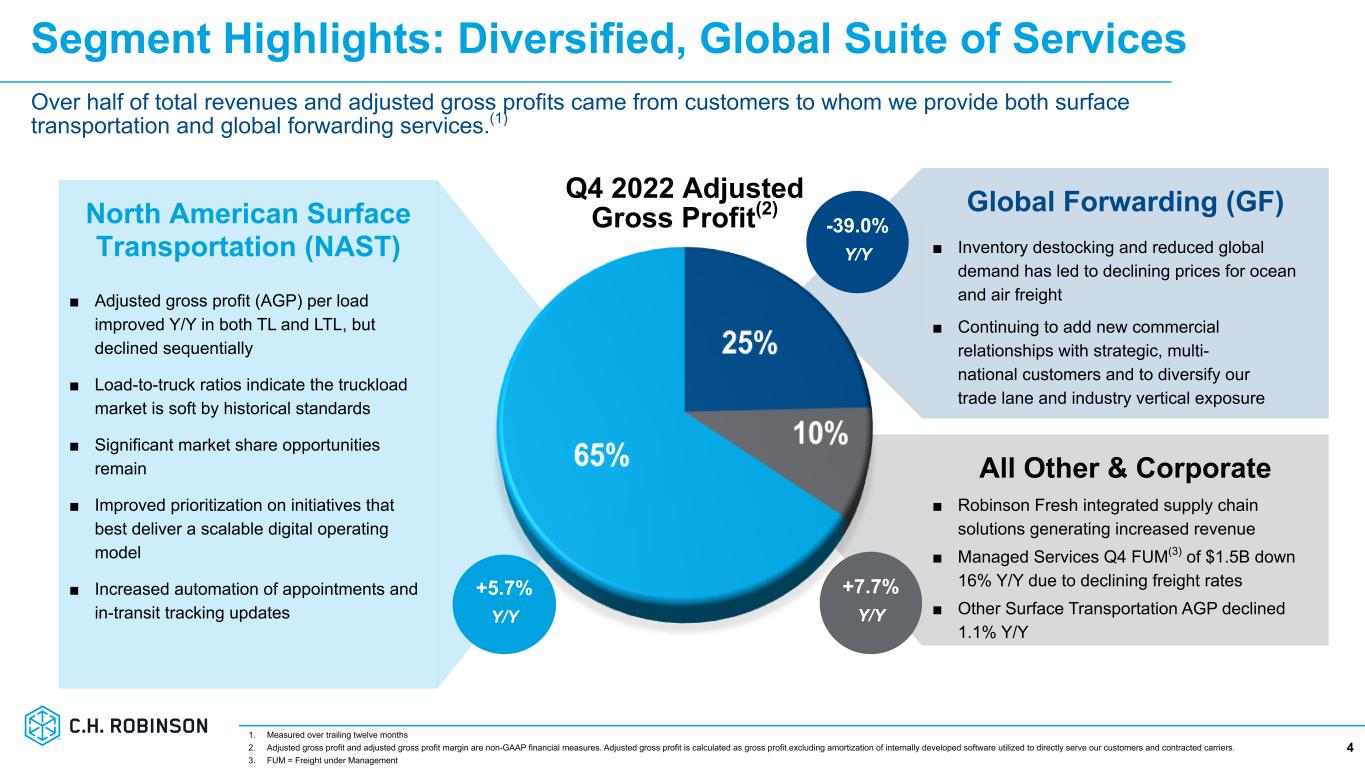 Q4 Highlights 3 ■ Unseasonably soft freight demand, driven by shippers managing through elevated inventory levels amidst slowing economic growth ■ Staying focused on customers and carriers and accelerating delivery of our scalable digital operating model ■ Executing on plan to reduce net costs by $150 million on an annualized basis by Q4 2023 ■ Q4 2022 results include $36.7 million of restructuring charges ■ Adjusted net income per share of $1.03(1) ■ Record cash generation enabling higher return of cash to shareholders $5.1B Total Revenues -22.1% Y/Y $768M Adj. Gross Profit -10.3% Y/Y $164M Income from Ops. -42.9% Y/Y $0.80 Net Income/Share -54.0% Y/Y Q4 2022 1. Adjusted net income per share is a non-GAAP financial measure. Refer to page 22 for further discussion and a GAAP to Non-GAAP reconciliation.