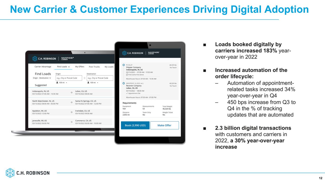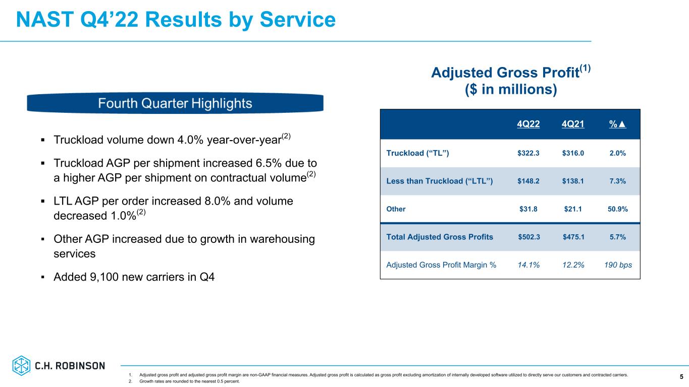 All Other & Corporate ■ Robinson Fresh integrated supply chain solutions generating increased revenue ■ Managed Services Q4 FUM(3) of $1.5B down 16% Y/Y due to declining freight rates ■ Other Surface Transportation AGP declined 1.1% Y/Y Global Forwarding (GF) ■ Inventory destocking and reduced global demand has led to declining prices for ocean and air freight ■ Continuing to add new commercial relationships with strategic, multi- national customers and to diversify our trade lane and industry vertical exposure North American Surface Transportation (NAST) ■ Adjusted gross profit (AGP) per load improved Y/Y in both TL and LTL, but declined sequentially ■ Load-to-truck ratios indicate the truckload market is soft by historical standards ■ Significant market share opportunities remain ■ Improved prioritization on initiatives that best deliver a scalable digital operating model ■ Increased automation of appointments and in-transit tracking updates Segment Highlights: Diversified, Global Suite of Services 4 Q4 2022 Adjusted Gross Profit(2) +5.7% Y/Y +7.7% Y/Y -39.0% Y/Y 1. Measured over trailing twelve months 2. Adjusted gross profit and adjusted gross profit margin are non-GAAP financial measures. Adjusted gross profit is calculated as gross profit excluding amortization of internally developed software utilized to directly serve our customers and contracted carriers. 3. FUM = Freight under Management Over half of total revenues and adjusted gross profits came from customers to whom we provide both surface transportation and global forwarding services.(1)