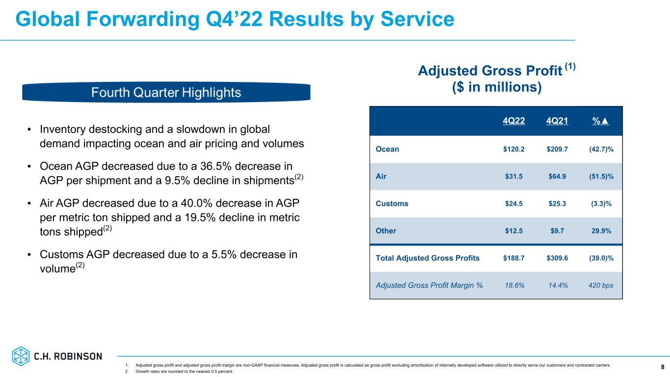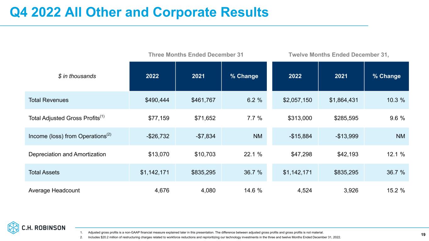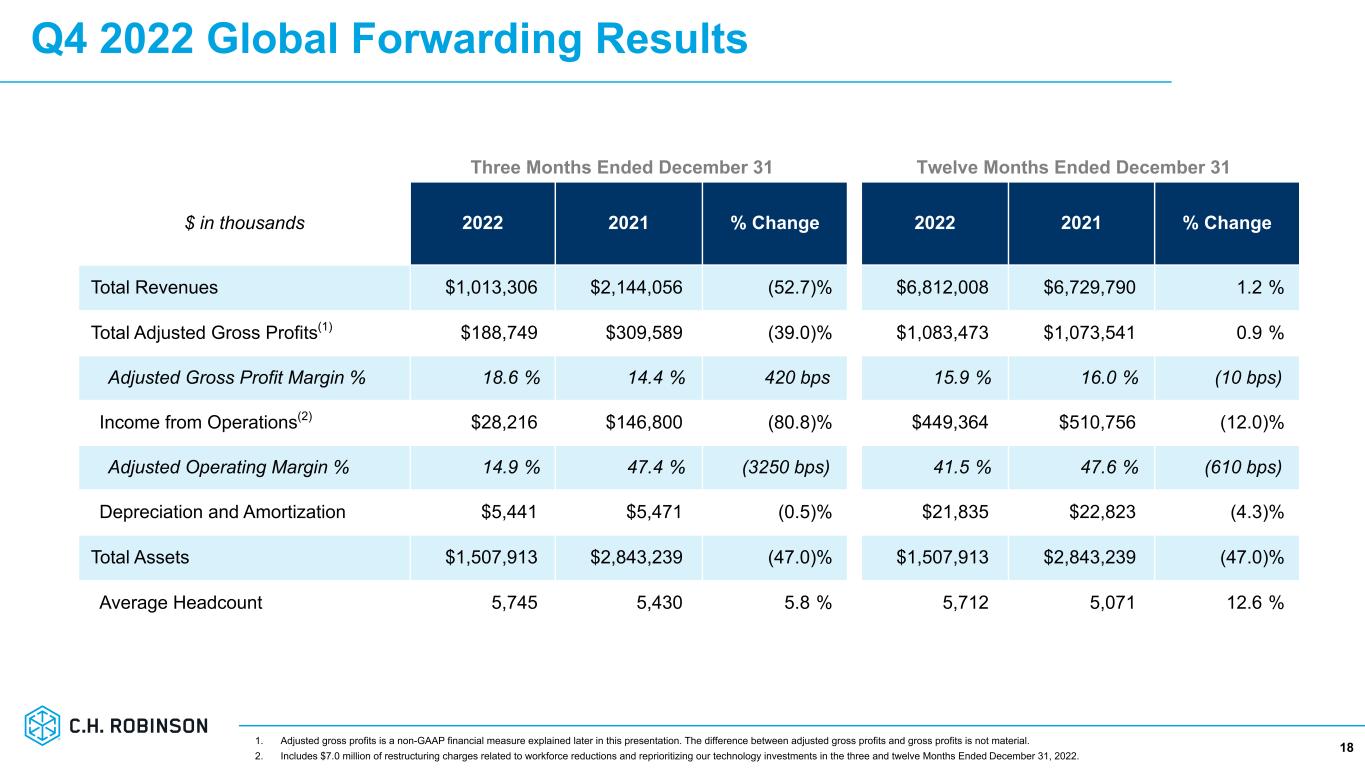 Q4 2022 Global Forwarding Results 181. Adjusted gross profits is a non-GAAP financial measure explained later in this presentation. The difference between adjusted gross profits and gross profits is not material. 2. Includes $7.0 million of restructuring charges related to workforce reductions and reprioritizing our technology investments in the three and twelve Months Ended December 31, 2022. Three Months Ended December 31 Twelve Months Ended December 31 $ in thousands 2022 2021 % Change 2022 2021 % Change Total Revenues $1,013,306 $2,144,056 (52.7) % $6,812,008 $6,729,790 1.2 % Total Adjusted Gross Profits(1) $188,749 $309,589 (39.0) % $1,083,473 $1,073,541 0.9 % Adjusted Gross Profit Margin % 18.6 % 14.4 % 420 bps 15.9 % 16.0 % (10 bps) Income from Operations(2) $28,216 $146,800 (80.8) % $449,364 $510,756 (12.0) % Adjusted Operating Margin % 14.9 % 47.4 % (3250 bps) 41.5 % 47.6 % (610 bps) Depreciation and Amortization $5,441 $5,471 (0.5) % $21,835 $22,823 (4.3) % Total Assets $1,507,913 $2,843,239 (47.0) % $1,507,913 $2,843,239 (47.0) % Average Headcount 5,745 5,430 5.8 % 5,712 5,071 12.6 %