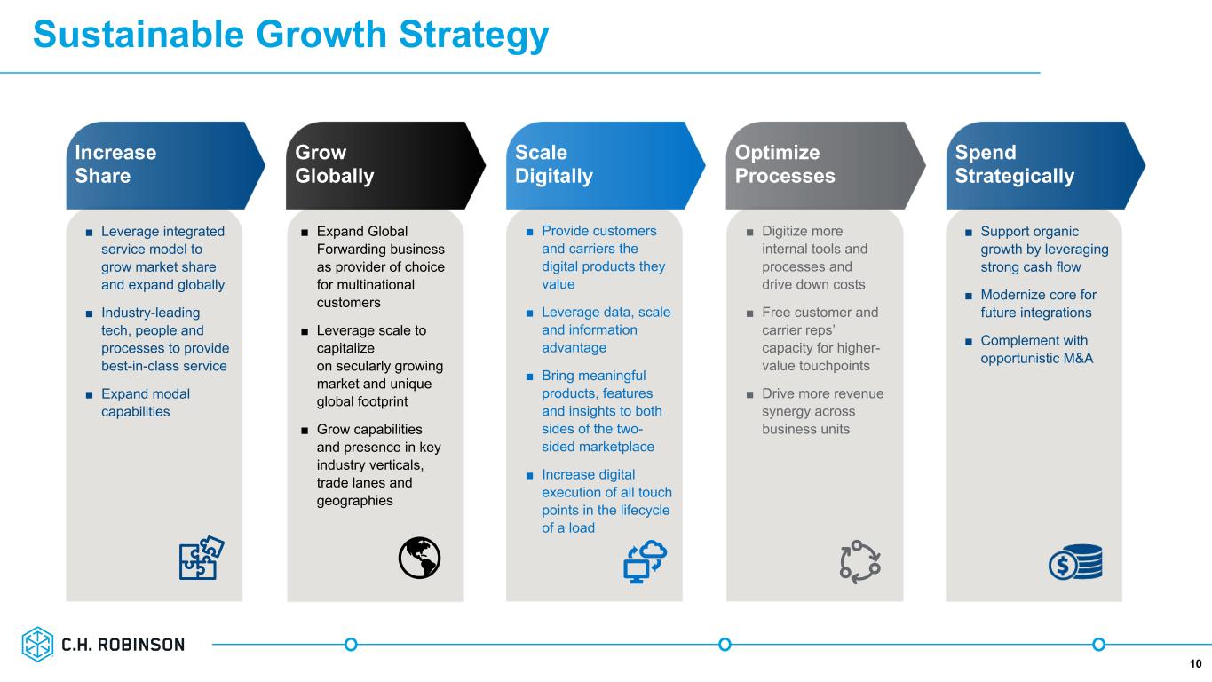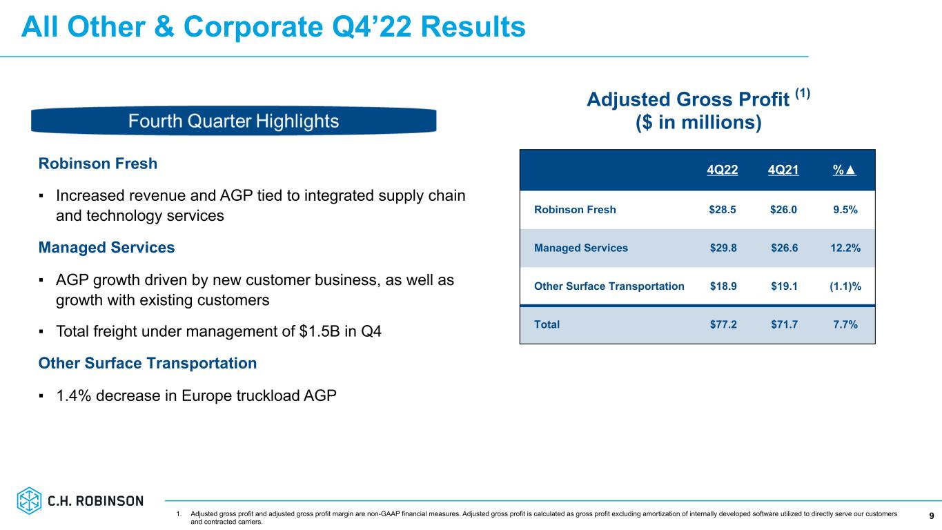 All Other & Corporate Q4’22 Results 9 Robinson Fresh ▪ Increased revenue and AGP tied to integrated supply chain and technology services Managed Services ▪ AGP growth driven by new customer business, as well as growth with existing customers ▪ Total freight under management of $1.5B in Q4 Other Surface Transportation ▪ 1.4% decrease in Europe truckload AGP 4Q22 4Q21 %▲ Robinson Fresh $28.5 $26.0 9.5% Managed Services $29.8 $26.6 12.2% Other Surface Transportation $18.9 $19.1 (1.1)% Total $77.2 $71.7 7.7% Adjusted Gross Profit (1) ($ in millions) 1. Adjusted gross profit and adjusted gross profit margin are non-GAAP financial measures. Adjusted gross profit is calculated as gross profit excluding amortization of internally developed software utilized to directly serve our customers and contracted carriers.