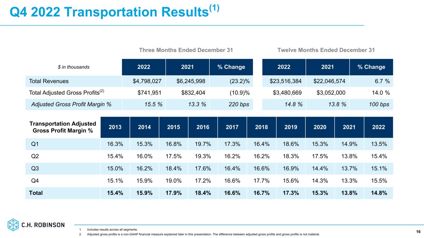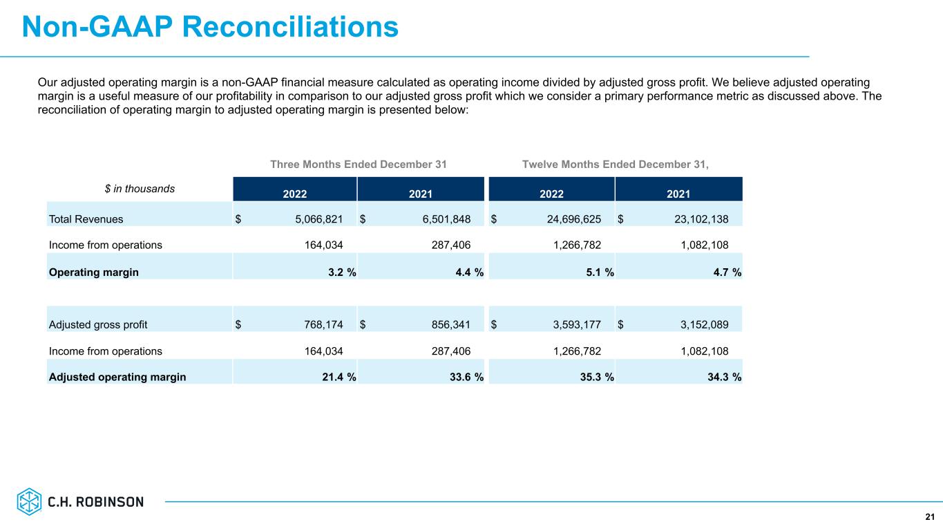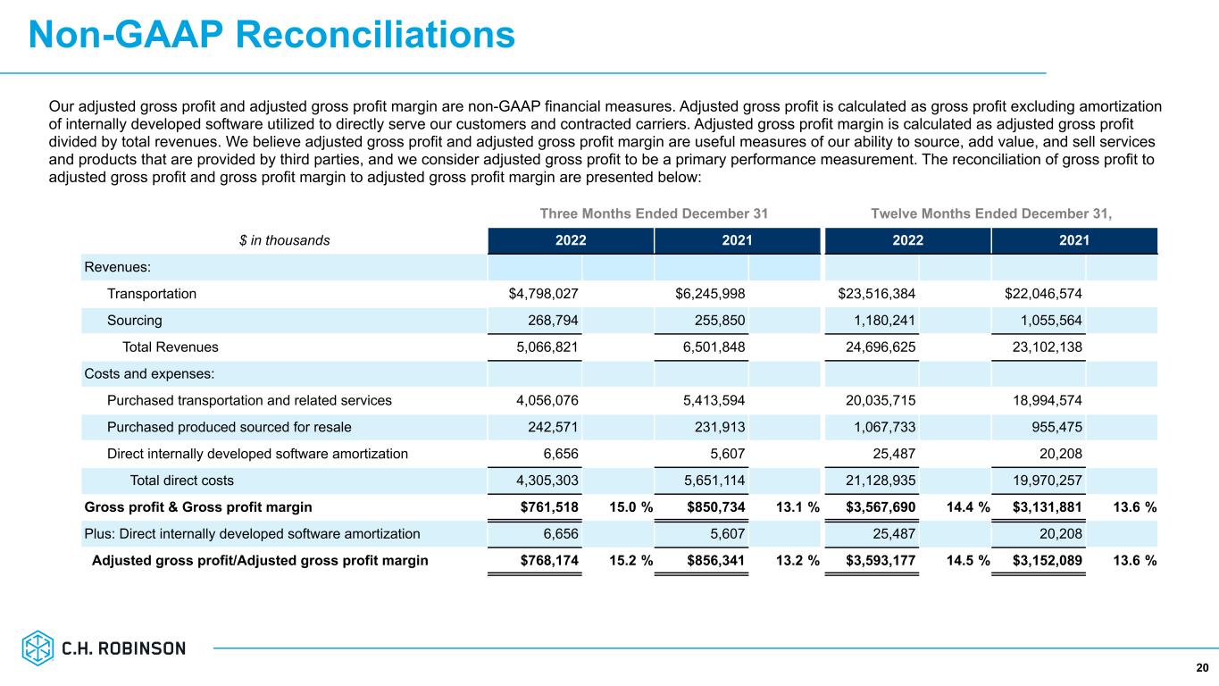 20 Our adjusted gross profit and adjusted gross profit margin are non-GAAP financial measures. Adjusted gross profit is calculated as gross profit excluding amortization of internally developed software utilized to directly serve our customers and contracted carriers. Adjusted gross profit margin is calculated as adjusted gross profit divided by total revenues. We believe adjusted gross profit and adjusted gross profit margin are useful measures of our ability to source, add value, and sell services and products that are provided by third parties, and we consider adjusted gross profit to be a primary performance measurement. The reconciliation of gross profit to adjusted gross profit and gross profit margin to adjusted gross profit margin are presented below: Three Months Ended December 31 Twelve Months Ended December 31, $ in thousands 2022 2021 2022 2021 Revenues: Transportation $4,798,027 $6,245,998 $23,516,384 $22,046,574 Sourcing 268,794 255,850 1,180,241 1,055,564 Total Revenues 5,066,821 6,501,848 24,696,625 23,102,138 Costs and expenses: Purchased transportation and related services 4,056,076 5,413,594 20,035,715 18,994,574 Purchased produced sourced for resale 242,571 231,913 1,067,733 955,475 Direct internally developed software amortization 6,656 5,607 25,487 20,208 Total direct costs 4,305,303 5,651,114 21,128,935 19,970,257 Gross profit & Gross profit margin $761,518 15.0 % $850,734 13.1 % $3,567,690 14.4 % $3,131,881 13.6 % Plus: Direct internally developed software amortization 6,656 5,607 25,487 20,208 Adjusted gross profit/Adjusted gross profit margin $768,174 15.2 % $856,341 13.2 % $3,593,177 14.5 % $3,152,089 13.6 % Non-GAAP Reconciliations
