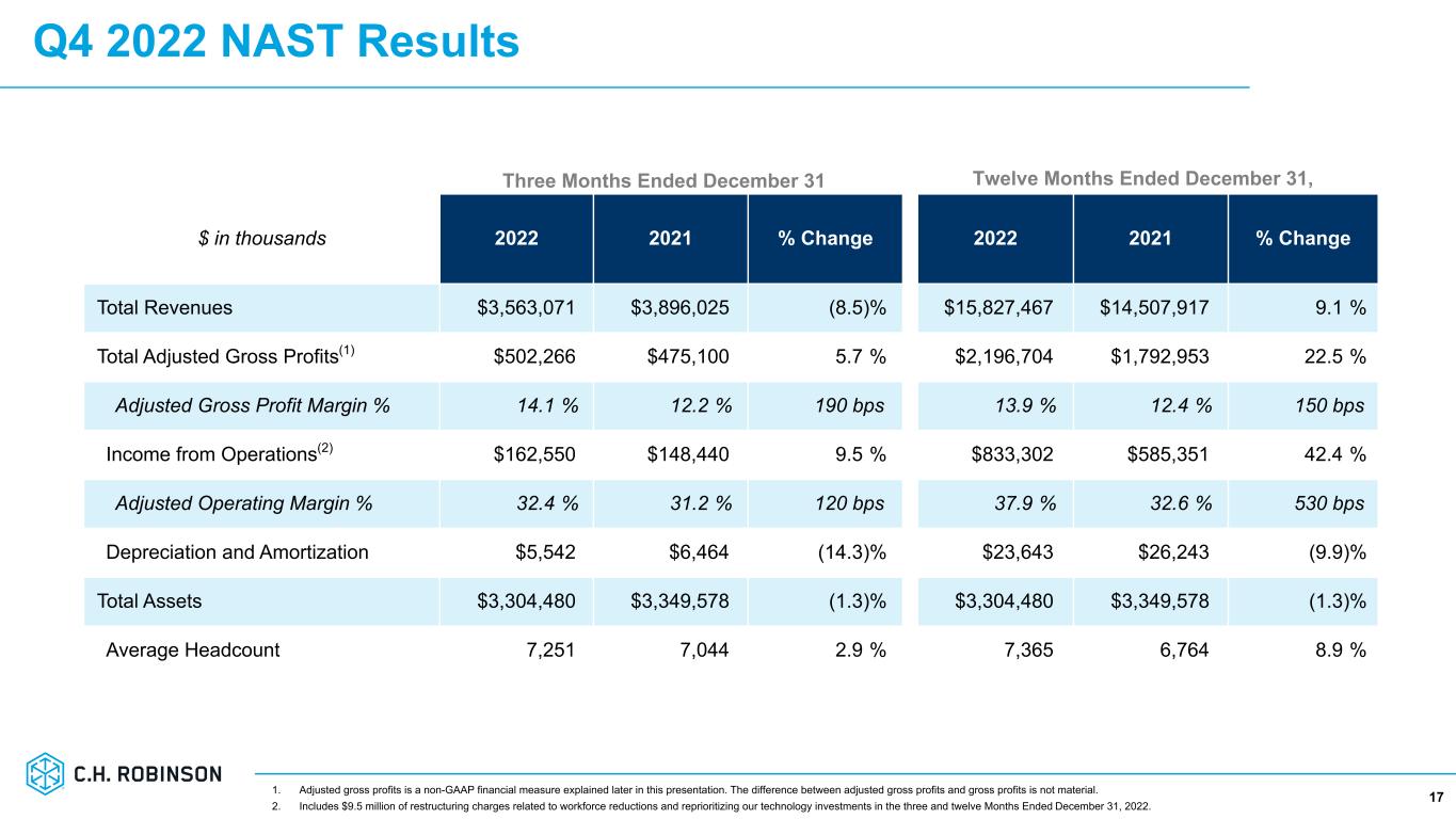 Q4 2022 NAST Results 171. Adjusted gross profits is a non-GAAP financial measure explained later in this presentation. The difference between adjusted gross profits and gross profits is not material. 2. Includes $9.5 million of restructuring charges related to workforce reductions and reprioritizing our technology investments in the three and twelve Months Ended December 31, 2022. Three Months Ended December 31 Twelve Months Ended December 31, $ in thousands 2022 2021 % Change 2022 2021 % Change Total Revenues $3,563,071 $3,896,025 (8.5) % $15,827,467 $14,507,917 9.1 % Total Adjusted Gross Profits(1) $502,266 $475,100 5.7 % $2,196,704 $1,792,953 22.5 % Adjusted Gross Profit Margin % 14.1 % 12.2 % 190 bps 13.9 % 12.4 % 150 bps Income from Operations(2) $162,550 $148,440 9.5 % $833,302 $585,351 42.4 % Adjusted Operating Margin % 32.4 % 31.2 % 120 bps 37.9 % 32.6 % 530 bps Depreciation and Amortization $5,542 $6,464 (14.3) % $23,643 $26,243 (9.9) % Total Assets $3,304,480 $3,349,578 (1.3) % $3,304,480 $3,349,578 (1.3) % Average Headcount 7,251 7,044 2.9 % 7,365 6,764 8.9 %