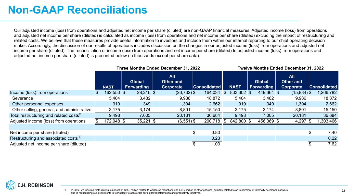 Non-GAAP Reconciliations 22 Our adjusted income (loss) from operations and adjusted net income per share (diluted) are non-GAAP financial measures. Adjusted income (loss) from operations and adjusted net income per share (diluted) is calculated as income (loss) from operations and net income per share (diluted) excluding the impact of restructuring and related costs. We believe that these measures provide useful information to investors and include them within our internal reporting to our chief operating decision maker. Accordingly, the discussion of our results of operations includes discussion on the changes in our adjusted income (loss) from operations and adjusted net income per share (diluted). The reconciliation of income (loss) from operations and net income per share (diluted) to adjusted income (loss) from operations and adjusted net income per share (diluted) is presented below (in thousands except per share data): Three Months Ended December 31, 2022 Twelve Months Ended December 31, 2022 NAST Global Forwarding All Other and Corporate Consolidated NAST Global Forwarding All Other and Corporate Consolidated Income (loss) from operations $ 162,550 $ 28,216 $ (26,732) $ 164,034 $ 833,302 $ 449,364 $ (15,884) $ 1,266,782 Severance 5,404 3,482 9,986 18,872 5,404 3,482 9,986 18,872 Other personnel expenses 919 349 1,394 2,662 919 349 1,394 2,662 Other selling, general, and administrative 3,175 3,174 8,801 15,150 3,175 3,174 8,801 15,150 Total restructuring and related costs(1) 9,498 7,005 20,181 36,684 9,498 7,005 20,181 36,684 Adjusted income (loss) from operations $ 172,048 $ 35,221 $ (6,551) $ 200,718 $ 842,800 $ 456,369 $ 4,297 $ 1,303,466 Net income per share (diluted) $ 0.80 $ 7.40 Restructuring and associated costs(1) 0.23 0.22 Adjusted net income per share (diluted) $ 1.03 $ 7.62 1. In 2022, we incurred restructuring expenses of $21.5 million related to workforce reductions and $15.2 million of other charges, primarily related to an impairment of internally developed software due to reprioritizing our investments in technology to accelerate our digital transformation and productivity initiatives.