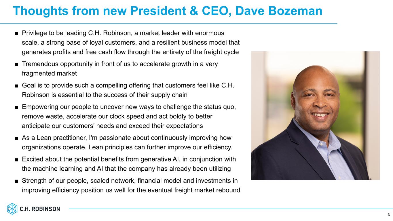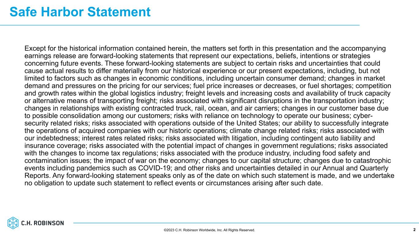 Safe Harbor Statement Except for the historical information contained herein, the matters set forth in this presentation and the accompanying earnings release are forward-looking statements that represent our expectations, beliefs, intentions or strategies concerning future events. These forward-looking statements are subject to certain risks and uncertainties that could cause actual results to differ materially from our historical experience or our present expectations, including, but not limited to factors such as changes in economic conditions, including uncertain consumer demand; changes in market demand and pressures on the pricing for our services; fuel price increases or decreases, or fuel shortages; competition and growth rates within the global logistics industry; freight levels and increasing costs and availability of truck capacity or alternative means of transporting freight; risks associated with significant disruptions in the transportation industry; changes in relationships with existing contracted truck, rail, ocean, and air carriers; changes in our customer base due to possible consolidation among our customers; risks with reliance on technology to operate our business; cyber- security related risks; risks associated with operations outside of the United States; our ability to successfully integrate the operations of acquired companies with our historic operations; climate change related risks; risks associated with our indebtedness; interest rates related risks; risks associated with litigation, including contingent auto liability and insurance coverage; risks associated with the potential impact of changes in government regulations; risks associated with the changes to income tax regulations; risks associated with the produce industry, including food safety and contamination issues; the impact of war on the economy; changes to our capital structure; changes due to catastrophic events including pandemics such as COVID-19; and other risks and uncertainties detailed in our Annual and Quarterly Reports. Any forward-looking statement speaks only as of the date on which such statement is made, and we undertake no obligation to update such statement to reflect events or circumstances arising after such date. 2©2023 C.H. Robinson Worldwide, Inc. All Rights Reserved.