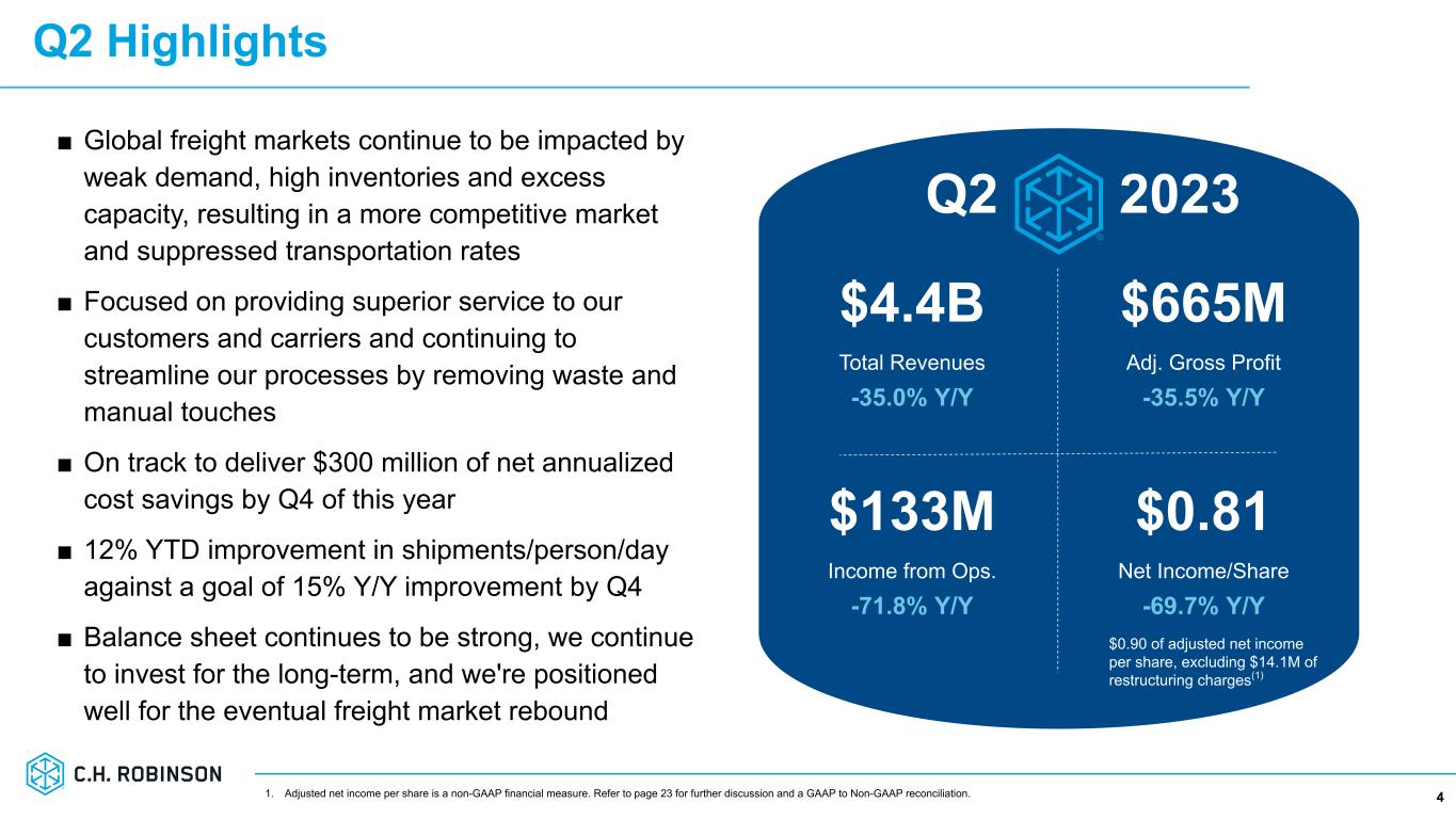 Thoughts from new President & CEO, Dave Bozeman 3 ■ Privilege to be leading C.H. Robinson, a market leader with enormous scale, a strong base of loyal customers, and a resilient business model that generates profits and free cash flow through the entirety of the freight cycle ■ Tremendous opportunity in front of us to accelerate growth in a very fragmented market ■ Goal is to provide such a compelling offering that customers feel like C.H. Robinson is essential to the success of their supply chain ■ Empowering our people to uncover new ways to challenge the status quo, remove waste, accelerate our clock speed and act boldly to better anticipate our customers’ needs and exceed their expectations ■ As a Lean practitioner, I'm passionate about continuously improving how organizations operate. Lean principles can further improve our efficiency. ■ Excited about the potential benefits from generative AI, in conjunction with the machine learning and AI that the company has already been utilizing ■ Strength of our people, scaled network, financial model and investments in improving efficiency position us well for the eventual freight market rebound