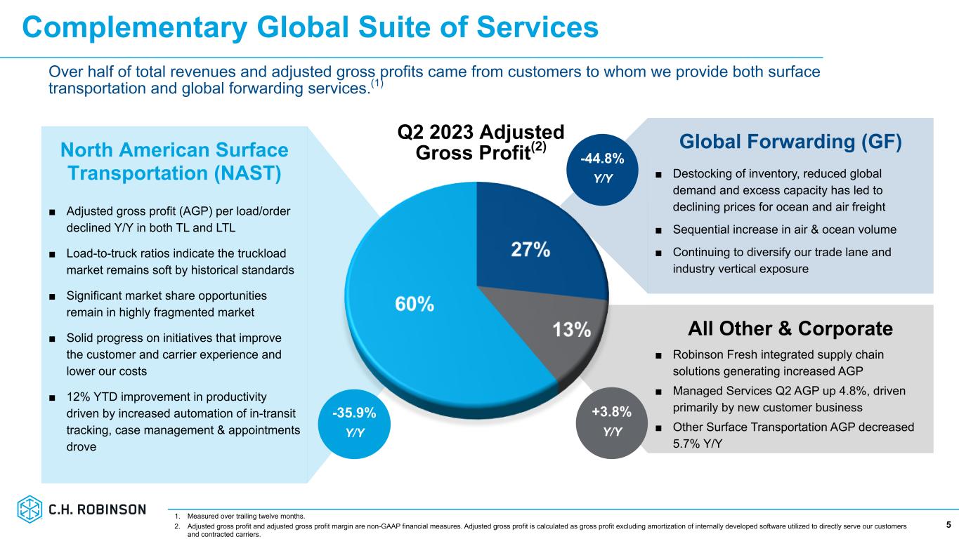 Q2 Highlights 4 ■ Global freight markets continue to be impacted by weak demand, high inventories and excess capacity, resulting in a more competitive market and suppressed transportation rates ■ Focused on providing superior service to our customers and carriers and continuing to streamline our processes by removing waste and manual touches ■ On track to deliver $300 million of net annualized cost savings by Q4 of this year ■ 12% YTD improvement in shipments/person/day against a goal of 15% Y/Y improvement by Q4 ■ Balance sheet continues to be strong, we continue to invest for the long-term, and we're positioned well for the eventual freight market rebound $4.4B Total Revenues -35.0% Y/Y $665M Adj. Gross Profit -35.5% Y/Y $133M Income from Ops. -71.8% Y/Y $0.81 Net Income/Share -69.7% Y/Y Q2 2023 1. Adjusted net income per share is a non-GAAP financial measure. Refer to page 23 for further discussion and a GAAP to Non-GAAP reconciliation. $0.90 of adjusted net income per share, excluding $14.1M of restructuring charges(1)