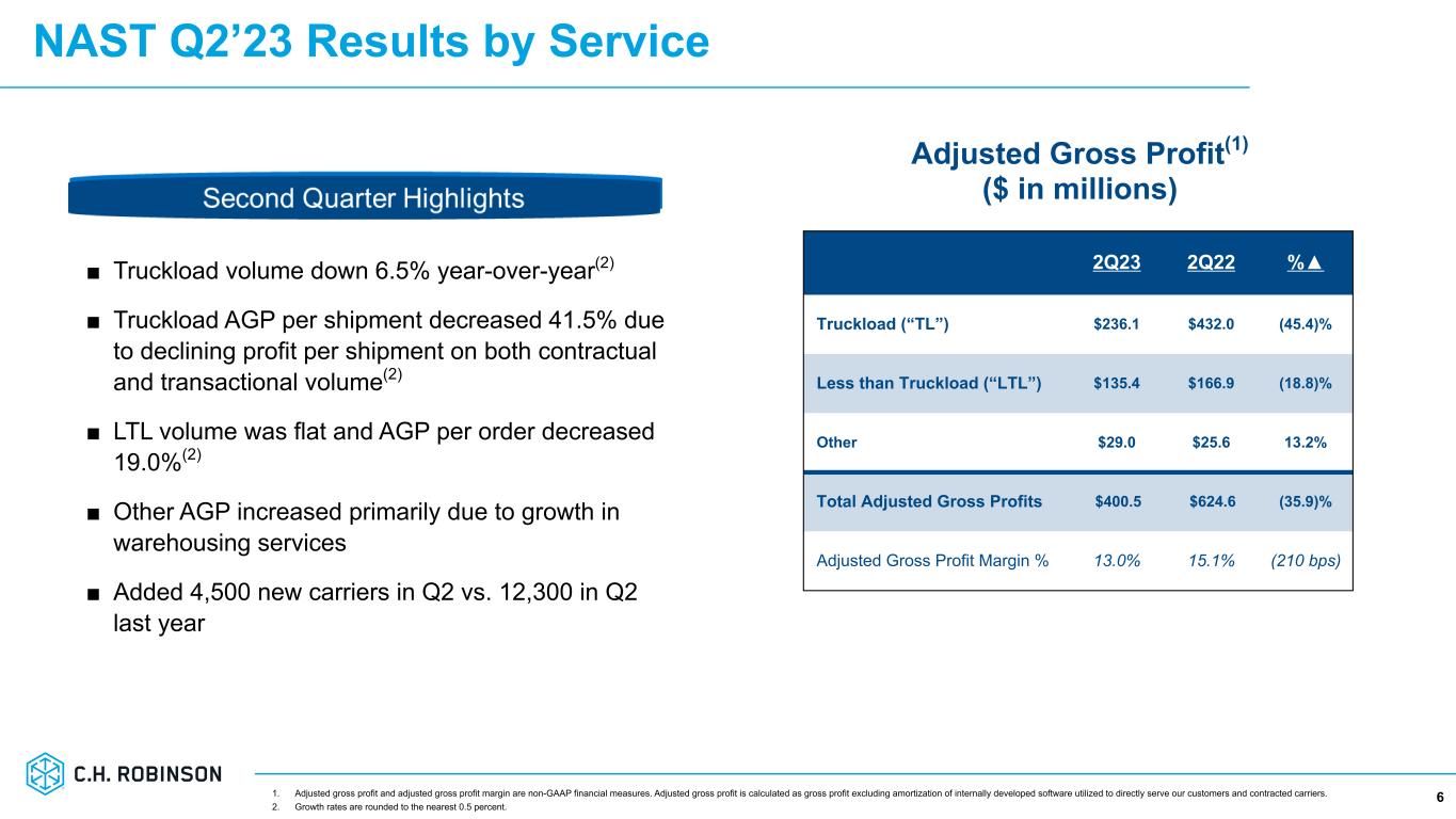 All Other & Corporate ■ Robinson Fresh integrated supply chain solutions generating increased AGP ■ Managed Services Q2 AGP up 4.8%, driven primarily by new customer business ■ Other Surface Transportation AGP decreased 5.7% Y/Y Global Forwarding (GF) ■ Destocking of inventory, reduced global demand and excess capacity has led to declining prices for ocean and air freight ■ Sequential increase in air & ocean volume ■ Continuing to diversify our trade lane and industry vertical exposure North American Surface Transportation (NAST) ■ Adjusted gross profit (AGP) per load/order declined Y/Y in both TL and LTL ■ Load-to-truck ratios indicate the truckload market remains soft by historical standards ■ Significant market share opportunities remain in highly fragmented market ■ Solid progress on initiatives that improve the customer and carrier experience and lower our costs ■ 12% YTD improvement in productivity driven by increased automation of in-transit tracking, case management & appointments drove Complementary Global Suite of Services 5 Q2 2023 Adjusted Gross Profit(2) -35.9% Y/Y +3.8% Y/Y -44.8% Y/Y 1. Measured over trailing twelve months. 2. Adjusted gross profit and adjusted gross profit margin are non-GAAP financial measures. Adjusted gross profit is calculated as gross profit excluding amortization of internally developed software utilized to directly serve our customers and contracted carriers. Over half of total revenues and adjusted gross profits came from customers to whom we provide both surface transportation and global forwarding services.(1)