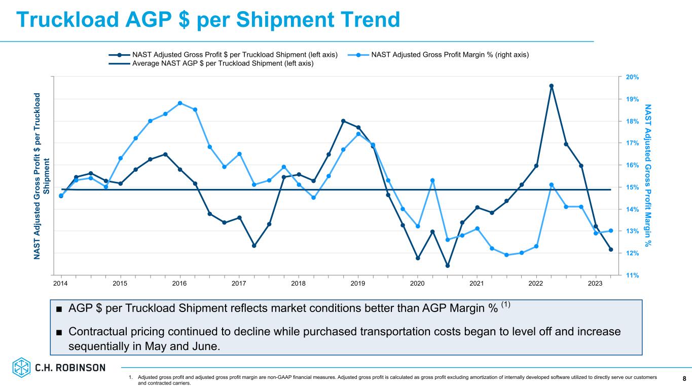 Truckload Price and Cost Change (1)(2)(3) 7 Truckload Q2 Volume(2)(4) -6.5 % Price/Mile(1)(2)(3) -23.0 % Cost/Mile(1)(2)(3) -19.0 % Adjusted Gross Profit(4) -45.4 % 1. Price and cost change represents YoY change for North America truckload shipments across all segments. 2. Growth rates are rounded to the nearest 0.5 percent. ■ 70% / 30% truckload contractual / transactional volume mix in Q2 ■ Average routing guide depth of 1.1 in Managed Services business vs. 1.4 in Q2 last year 3. Pricing and cost measures exclude fuel surcharges and costs. 4. Truckload volume and adjusted gross profit growth represents YoY change for NAST truckload. Yo Y % C ha ng e in P ric e an d C os t p er M ile YoY Price Change YoY Cost Change 2016 2017 2018 2019 2020 2021 2022 2023 -30% -20% -10% 0% 10% 20% 30% 40% 50%