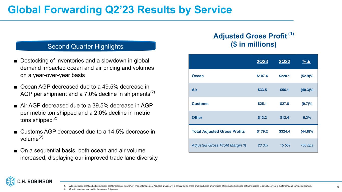 Truckload AGP $ per Shipment Trend 8 ■ AGP $ per Truckload Shipment reflects market conditions better than AGP Margin % (1) ■ Contractual pricing continued to decline while purchased transportation costs began to level off and increase sequentially in May and June. N A ST A dj us te d G ro ss P ro fit $ p er T ru ck lo ad Sh ip m en t N A ST A djusted G ross Profit M argin % NAST Adjusted Gross Profit $ per Truckload Shipment (left axis) NAST Adjusted Gross Profit Margin % (right axis) Average NAST AGP $ per Truckload Shipment (left axis) 2014 2015 2016 2017 2018 2019 2020 2021 2022 2023 11% 12% 13% 14% 15% 16% 17% 18% 19% 20% 1. Adjusted gross profit and adjusted gross profit margin are non-GAAP financial measures. Adjusted gross profit is calculated as gross profit excluding amortization of internally developed software utilized to directly serve our customers and contracted carriers.