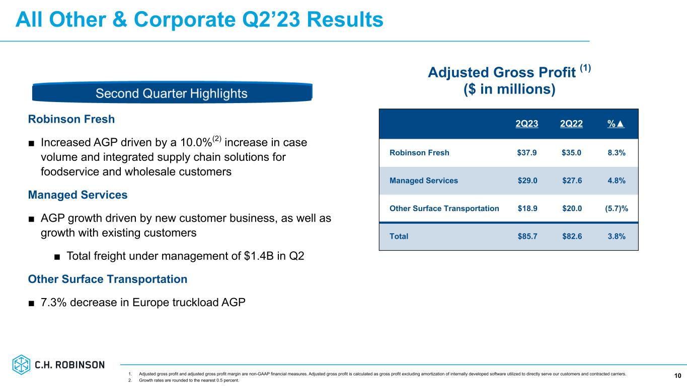 Global Forwarding Q2’23 Results by Service 9 2Q23 2Q22 %▲ Ocean $107.4 $228.1 (52.9)% Air $33.5 $56.1 (40.3)% Customs $25.1 $27.8 (9.7)% Other $13.2 $12.4 6.3% Total Adjusted Gross Profits $179.2 $324.4 (44.8)% Adjusted Gross Profit Margin % 23.0% 15.5% 750 bps Adjusted Gross Profit (1) ($ in millions) ■ Destocking of inventories and a slowdown in global demand impacted ocean and air pricing and volumes on a year-over-year basis ■ Ocean AGP decreased due to a 49.5% decrease in AGP per shipment and a 7.0% decline in shipments(2) ■ Air AGP decreased due to a 39.5% decrease in AGP per metric ton shipped and a 2.0% decline in metric tons shipped(2) ■ Customs AGP decreased due to a 14.5% decrease in volume(2) ■ On a sequential basis, both ocean and air volume increased, displaying our improved trade lane diversity 1. Adjusted gross profit and adjusted gross profit margin are non-GAAP financial measures. Adjusted gross profit is calculated as gross profit excluding amortization of internally developed software utilized to directly serve our customers and contracted carriers. 2. Growth rates are rounded to the nearest 0.5 percent.
