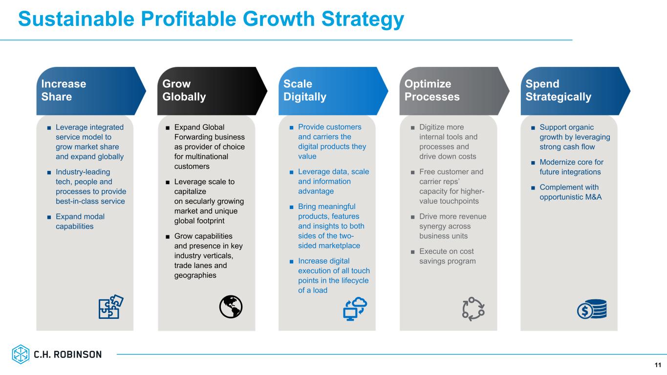All Other & Corporate Q2’23 Results 10 Robinson Fresh ■ Increased AGP driven by a 10.0%(2) increase in case volume and integrated supply chain solutions for foodservice and wholesale customers Managed Services ■ AGP growth driven by new customer business, as well as growth with existing customers ■ Total freight under management of $1.4B in Q2 Other Surface Transportation ■ 7.3% decrease in Europe truckload AGP 2Q23 2Q22 %▲ Robinson Fresh $37.9 $35.0 8.3% Managed Services $29.0 $27.6 4.8% Other Surface Transportation $18.9 $20.0 (5.7)% Total $85.7 $82.6 3.8% Adjusted Gross Profit (1) ($ in millions) 1. Adjusted gross profit and adjusted gross profit margin are non-GAAP financial measures. Adjusted gross profit is calculated as gross profit excluding amortization of internally developed software utilized to directly serve our customers and contracted carriers. 2. Growth rates are rounded to the nearest 0.5 percent.