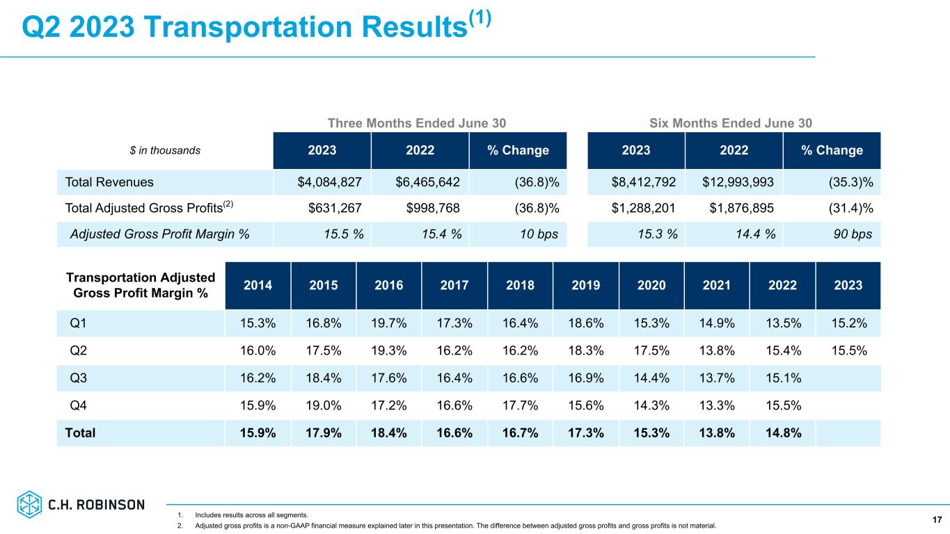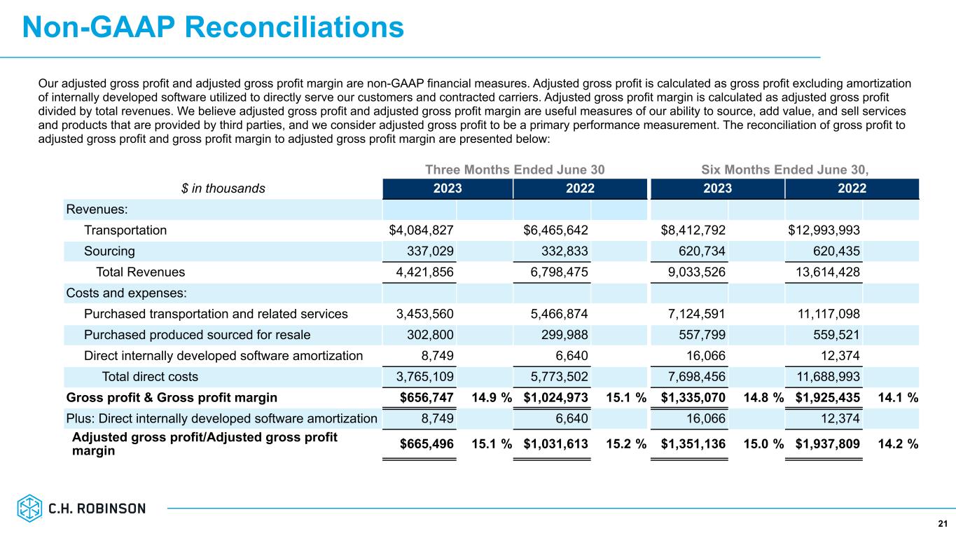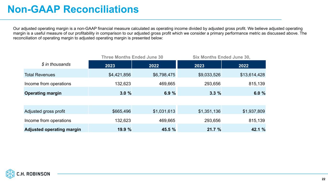 21 Our adjusted gross profit and adjusted gross profit margin are non-GAAP financial measures. Adjusted gross profit is calculated as gross profit excluding amortization of internally developed software utilized to directly serve our customers and contracted carriers. Adjusted gross profit margin is calculated as adjusted gross profit divided by total revenues. We believe adjusted gross profit and adjusted gross profit margin are useful measures of our ability to source, add value, and sell services and products that are provided by third parties, and we consider adjusted gross profit to be a primary performance measurement. The reconciliation of gross profit to adjusted gross profit and gross profit margin to adjusted gross profit margin are presented below: Three Months Ended June 30 Six Months Ended June 30, $ in thousands 2023 2022 2023 2022 Revenues: Transportation $4,084,827 $6,465,642 $8,412,792 $12,993,993 Sourcing 337,029 332,833 620,734 620,435 Total Revenues 4,421,856 6,798,475 9,033,526 13,614,428 Costs and expenses: Purchased transportation and related services 3,453,560 5,466,874 7,124,591 11,117,098 Purchased produced sourced for resale 302,800 299,988 557,799 559,521 Direct internally developed software amortization 8,749 6,640 16,066 12,374 Total direct costs 3,765,109 5,773,502 7,698,456 11,688,993 Gross profit & Gross profit margin $656,747 14.9 % $1,024,973 15.1 % $1,335,070 14.8 % $1,925,435 14.1 % Plus: Direct internally developed software amortization 8,749 6,640 16,066 12,374 Adjusted gross profit/Adjusted gross profit margin $665,496 15.1 % $1,031,613 15.2 % $1,351,136 15.0 % $1,937,809 14.2 % Non-GAAP Reconciliations