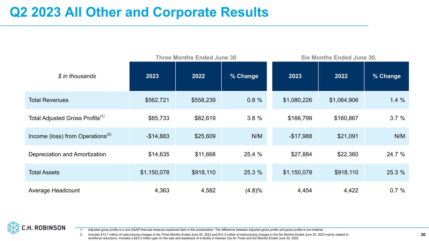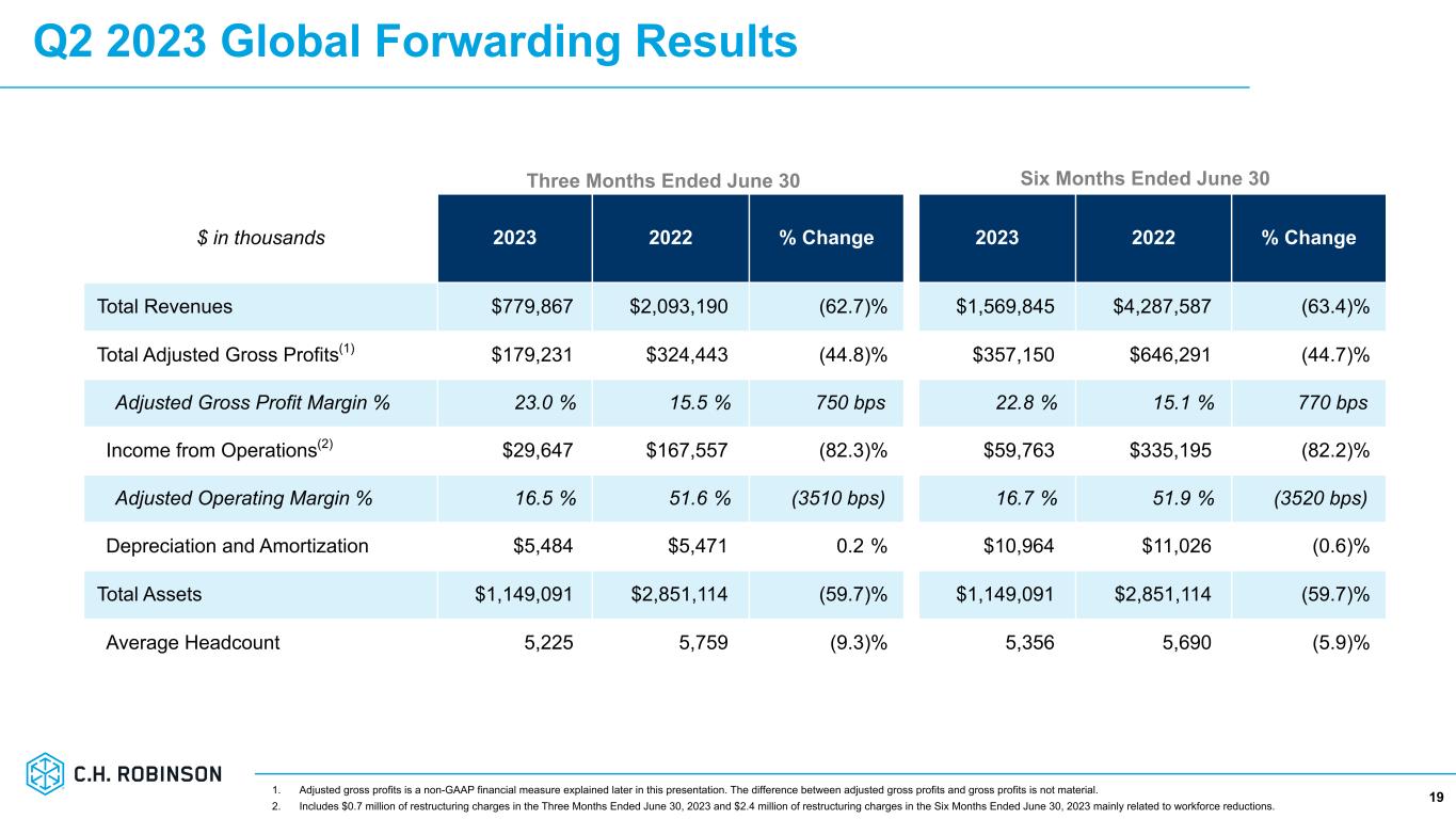 Q2 2023 Global Forwarding Results 191. Adjusted gross profits is a non-GAAP financial measure explained later in this presentation. The difference between adjusted gross profits and gross profits is not material. 2. Includes $0.7 million of restructuring charges in the Three Months Ended June 30, 2023 and $2.4 million of restructuring charges in the Six Months Ended June 30, 2023 mainly related to workforce reductions. Three Months Ended June 30 Six Months Ended June 30 $ in thousands 2023 2022 % Change 2023 2022 % Change Total Revenues $779,867 $2,093,190 (62.7) % $1,569,845 $4,287,587 (63.4) % Total Adjusted Gross Profits(1) $179,231 $324,443 (44.8) % $357,150 $646,291 (44.7) % Adjusted Gross Profit Margin % 23.0 % 15.5 % 750 bps 22.8 % 15.1 % 770 bps Income from Operations(2) $29,647 $167,557 (82.3) % $59,763 $335,195 (82.2) % Adjusted Operating Margin % 16.5 % 51.6 % (3510 bps) 16.7 % 51.9 % (3520 bps) Depreciation and Amortization $5,484 $5,471 0.2 % $10,964 $11,026 (0.6) % Total Assets $1,149,091 $2,851,114 (59.7) % $1,149,091 $2,851,114 (59.7) % Average Headcount 5,225 5,759 (9.3) % 5,356 5,690 (5.9) %