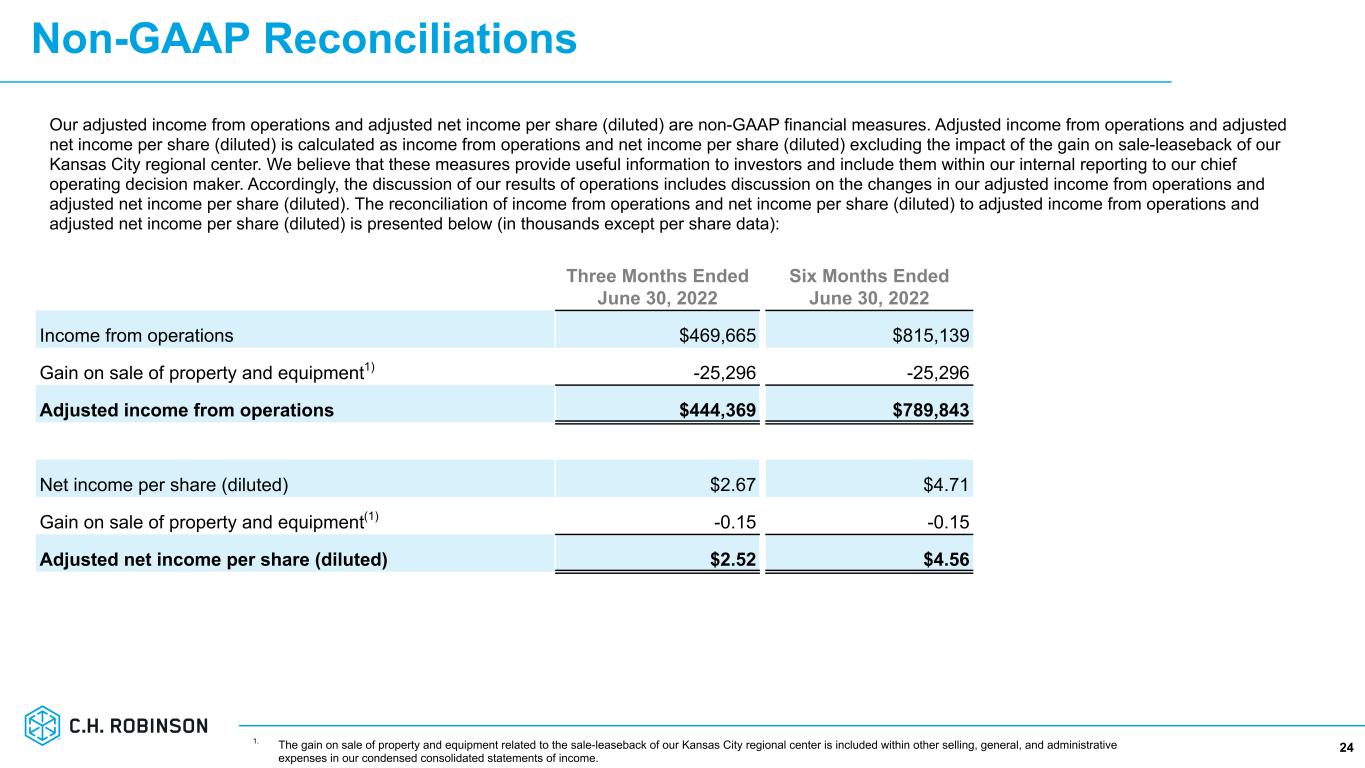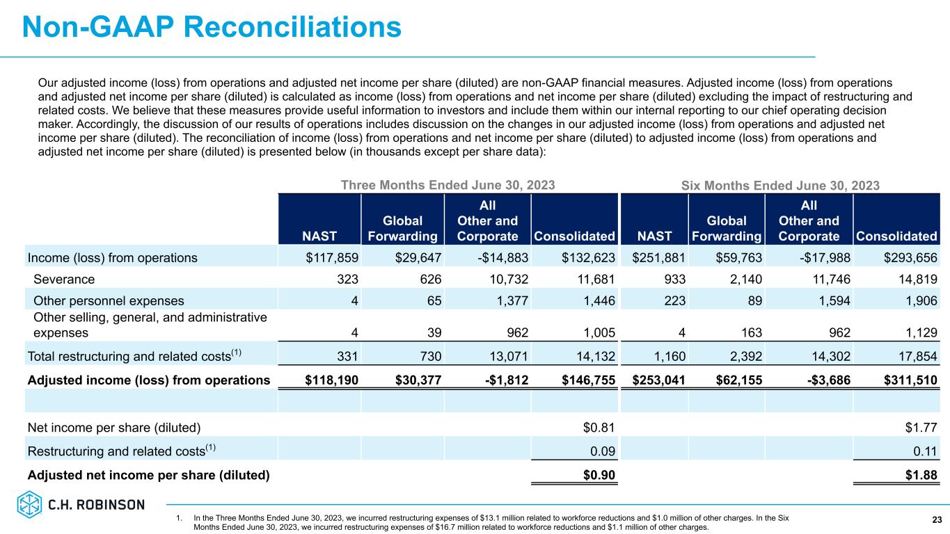 Non-GAAP Reconciliations 23 Our adjusted income (loss) from operations and adjusted net income per share (diluted) are non-GAAP financial measures. Adjusted income (loss) from operations and adjusted net income per share (diluted) is calculated as income (loss) from operations and net income per share (diluted) excluding the impact of restructuring and related costs. We believe that these measures provide useful information to investors and include them within our internal reporting to our chief operating decision maker. Accordingly, the discussion of our results of operations includes discussion on the changes in our adjusted income (loss) from operations and adjusted net income per share (diluted). The reconciliation of income (loss) from operations and net income per share (diluted) to adjusted income (loss) from operations and adjusted net income per share (diluted) is presented below (in thousands except per share data): Three Months Ended June 30, 2023 Six Months Ended June 30, 2023 NAST Global Forwarding All Other and Corporate Consolidated NAST Global Forwarding All Other and Corporate Consolidated Income (loss) from operations $117,859 $29,647 -$14,883 $132,623 $251,881 $59,763 -$17,988 $293,656 Severance 323 626 10,732 11,681 933 2,140 11,746 14,819 Other personnel expenses 4 65 1,377 1,446 223 89 1,594 1,906 Other selling, general, and administrative expenses 4 39 962 1,005 4 163 962 1,129 Total restructuring and related costs(1) 331 730 13,071 14,132 1,160 2,392 14,302 17,854 Adjusted income (loss) from operations $118,190 $30,377 -$1,812 $146,755 $253,041 $62,155 -$3,686 $311,510 Net income per share (diluted) $0.81 $1.77 Restructuring and related costs(1) 0.09 0.11 Adjusted net income per share (diluted) $0.90 $1.88 1. In the Three Months Ended June 30, 2023, we incurred restructuring expenses of $13.1 million related to workforce reductions and $1.0 million of other charges. In the Six Months Ended June 30, 2023, we incurred restructuring expenses of $16.7 million related to workforce reductions and $1.1 million of other charges.