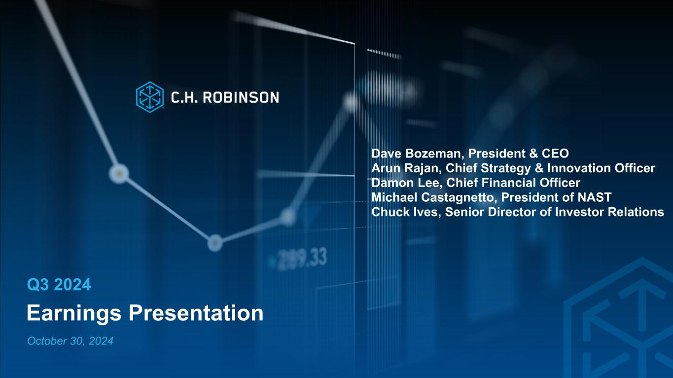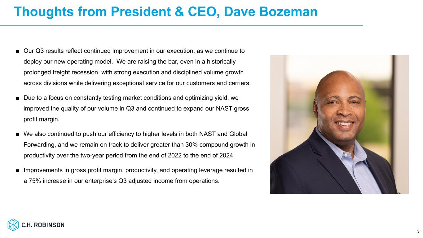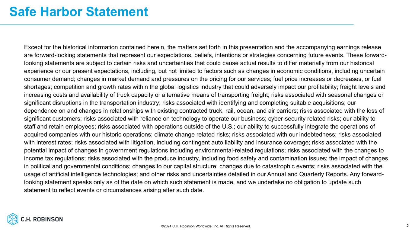 Safe Harbor Statement Except for the historical information contained herein, the matters set forth in this presentation and the accompanying earnings release are forward-looking statements that represent our expectations, beliefs, intentions or strategies concerning future events. These forward- looking statements are subject to certain risks and uncertainties that could cause actual results to differ materially from our historical experience or our present expectations, including, but not limited to factors such as changes in economic conditions, including uncertain consumer demand; changes in market demand and pressures on the pricing for our services; fuel price increases or decreases, or fuel shortages; competition and growth rates within the global logistics industry that could adversely impact our profitability; freight levels and increasing costs and availability of truck capacity or alternative means of transporting freight; risks associated with seasonal changes or significant disruptions in the transportation industry; risks associated with identifying and completing suitable acquisitions; our dependence on and changes in relationships with existing contracted truck, rail, ocean, and air carriers; risks associated with the loss of significant customers; risks associated with reliance on technology to operate our business; cyber-security related risks; our ability to staff and retain employees; risks associated with operations outside of the U.S.; our ability to successfully integrate the operations of acquired companies with our historic operations; climate change related risks; risks associated with our indebtedness; risks associated with interest rates; risks associated with litigation, including contingent auto liability and insurance coverage; risks associated with the potential impact of changes in government regulations including environmental-related regulations; risks associated with the changes to income tax regulations; risks associated with the produce industry, including food safety and contamination issues; the impact of changes in political and governmental conditions; changes to our capital structure; changes due to catastrophic events; risks associated with the usage of artificial intelligence technologies; and other risks and uncertainties detailed in our Annual and Quarterly Reports. Any forward- looking statement speaks only as of the date on which such statement is made, and we undertake no obligation to update such statement to reflect events or circumstances arising after such date. 2©2024 C.H. Robinson Worldwide, Inc. All Rights Reserved.