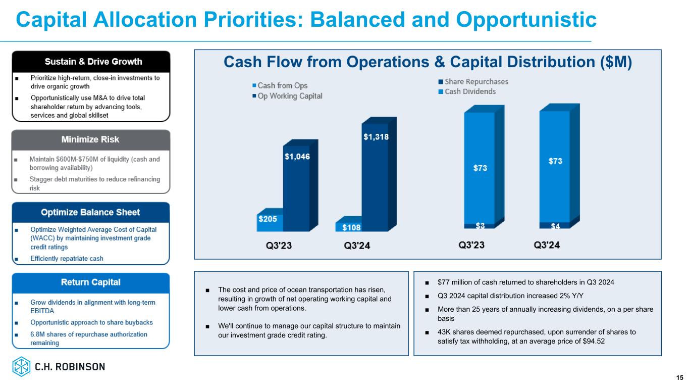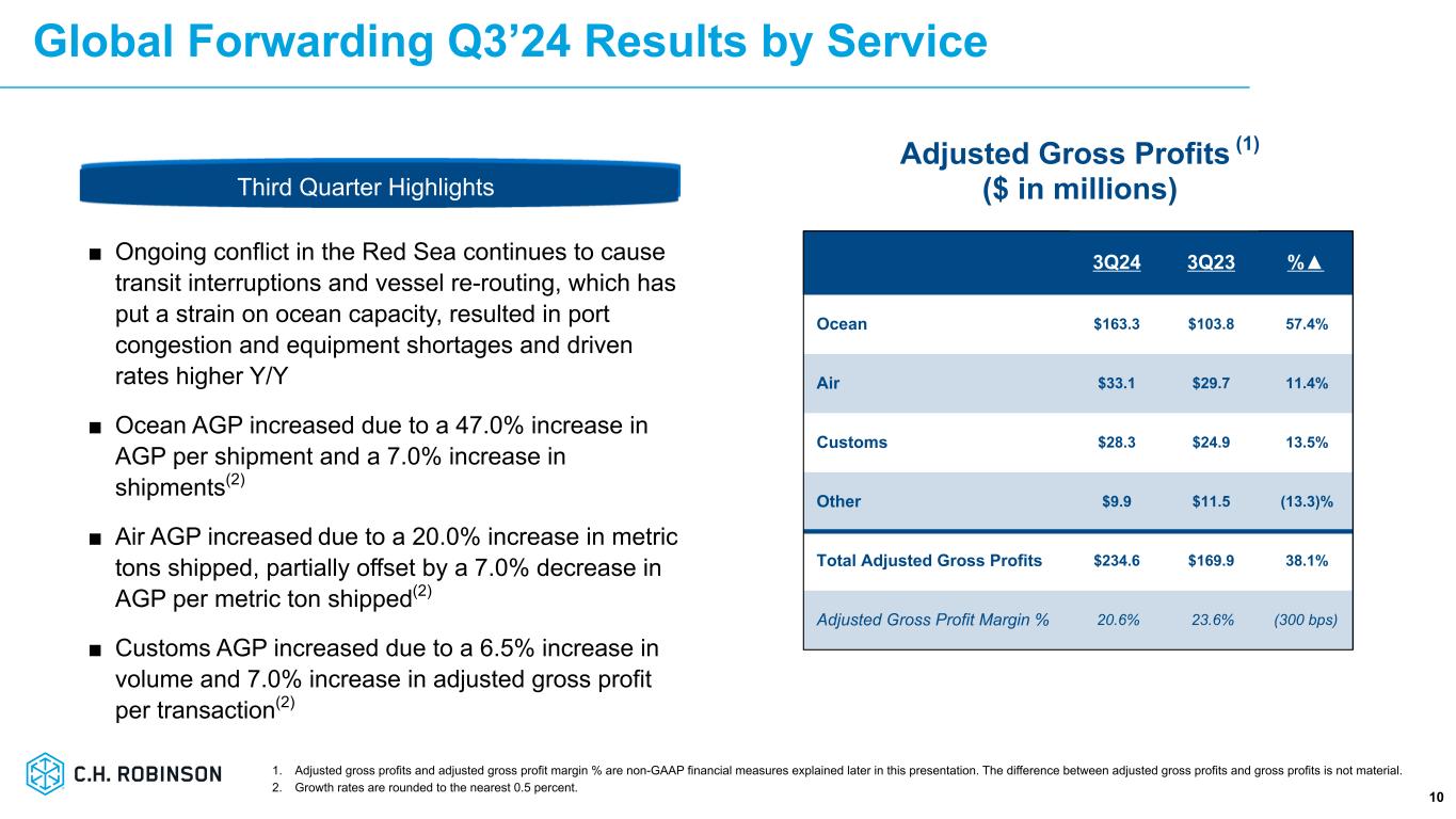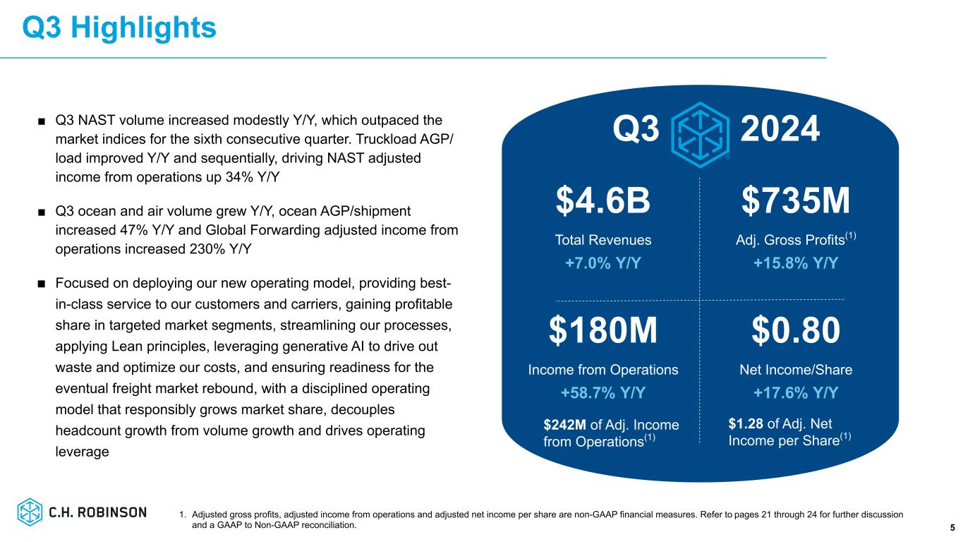 Safe Harbor Statement Except for the historical information contained herein, the matters set forth in this presentation and the accompanying earnings release are forward-looking statements that represent our expectations, beliefs, intentions or strategies concerning future events. These forward- looking statements are subject to certain risks and uncertainties that could cause actual results to differ materially from our historical experience or our present expectations, including, but not limited to factors such as changes in economic conditions, including uncertain consumer demand; changes in market demand and pressures on the pricing for our services; fuel price increases or decreases, or fuel shortages; competition and growth rates within the global logistics industry that could adversely impact our profitability; freight levels and increasing costs and availability of truck capacity or alternative means of transporting freight; risks associated with seasonal changes or significant disruptions in the transportation industry; risks associated with identifying and completing suitable acquisitions; our dependence on and changes in relationships with existing contracted truck, rail, ocean, and air carriers; risks associated with the loss of significant customers; risks associated with reliance on technology to operate our business; cyber-security related risks; our ability to staff and retain employees; risks associated with operations outside of the U.S.; our ability to successfully integrate the operations of acquired companies with our historic operations; climate change related risks; risks associated with our indebtedness; risks associated with interest rates; risks associated with litigation, including contingent auto liability and insurance coverage; risks associated with the potential impact of changes in government regulations including environmental-related regulations; risks associated with the changes to income tax regulations; risks associated with the produce industry, including food safety and contamination issues; the impact of changes in political and governmental conditions; changes to our capital structure; changes due to catastrophic events; risks associated with the usage of artificial intelligence technologies; and other risks and uncertainties detailed in our Annual and Quarterly Reports. Any forward- looking statement speaks only as of the date on which such statement is made, and we undertake no obligation to update such statement to reflect events or circumstances arising after such date. 2©2024 C.H. Robinson Worldwide, Inc. All Rights Reserved.