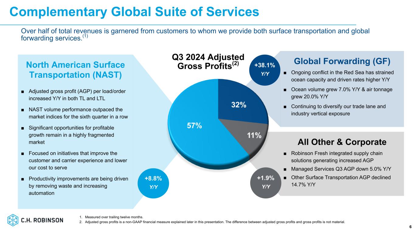 Q3 Highlights 5 ■ Q3 NAST volume increased modestly Y/Y, which outpaced the market indices for the sixth consecutive quarter. Truckload AGP/ load improved Y/Y and sequentially, driving NAST adjusted income from operations up 34% Y/Y ■ Q3 ocean and air volume grew Y/Y, ocean AGP/shipment increased 47% Y/Y and Global Forwarding adjusted income from operations increased 230% Y/Y ■ Focused on deploying our new operating model, providing best- in-class service to our customers and carriers, gaining profitable share in targeted market segments, streamlining our processes, applying Lean principles, leveraging generative AI to drive out waste and optimize our costs, and ensuring readiness for the eventual freight market rebound, with a disciplined operating model that responsibly grows market share, decouples headcount growth from volume growth and drives operating leverage $4.6B Total Revenues +7.0% Y/Y $735M Adj. Gross Profits(1) +15.8% Y/Y $180M Income from Operations +58.7% Y/Y $0.80 Net Income/Share +17.6% Y/Y Q3 2024 1. Adjusted gross profits, adjusted income from operations and adjusted net income per share are non-GAAP financial measures. Refer to pages 21 through 24 for further discussion and a GAAP to Non-GAAP reconciliation. $1.28 of Adj. Net Income per Share(1) $242M of Adj. Income from Operations(1)