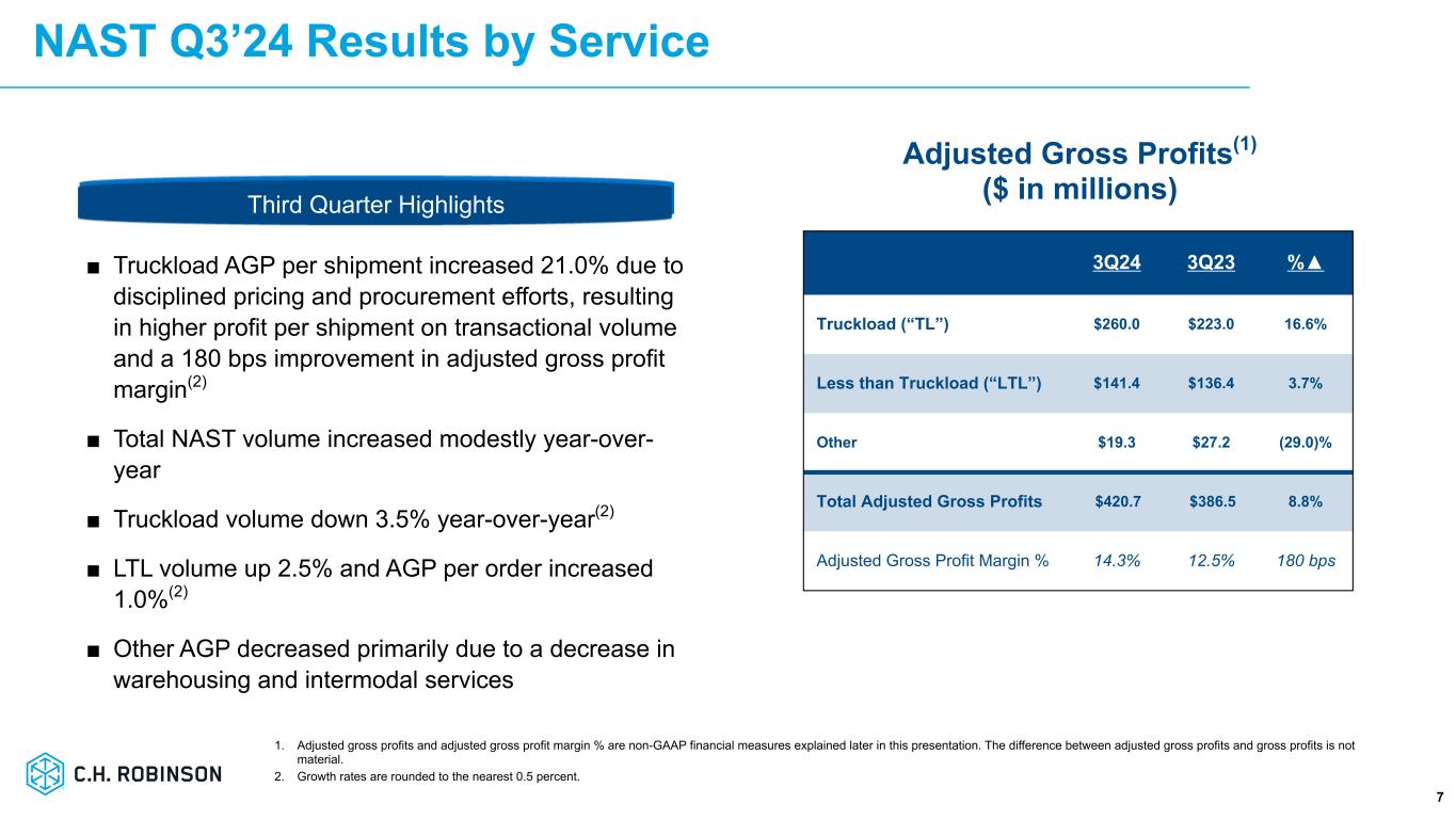 All Other & Corporate ■ Robinson Fresh integrated supply chain solutions generating increased AGP ■ Managed Services Q3 AGP down 5.0% Y/Y ■ Other Surface Transportation AGP declined 14.7% Y/Y Global Forwarding (GF) ■ Ongoing conflict in the Red Sea has strained ocean capacity and driven rates higher Y/Y ■ Ocean volume grew 7.0% Y/Y & air tonnage grew 20.0% Y/Y ■ Continuing to diversify our trade lane and industry vertical exposure North American Surface Transportation (NAST) ■ Adjusted gross profit (AGP) per load/order increased Y/Y in both TL and LTL ■ NAST volume performance outpaced the market indices for the sixth quarter in a row ■ Significant opportunities for profitable growth remain in a highly fragmented market ■ Focused on initiatives that improve the customer and carrier experience and lower our cost to serve ■ Productivity improvements are being driven by removing waste and increasing automation Complementary Global Suite of Services 6 Q3 2024 Adjusted Gross Profits(2) +8.8% Y/Y +1.9% Y/Y +38.1% Y/Y 1. Measured over trailing twelve months. 2. Adjusted gross profits is a non-GAAP financial measure explained later in this presentation. The difference between adjusted gross profits and gross profits is not material. Over half of total revenues is garnered from customers to whom we provide both surface transportation and global forwarding services.(1)