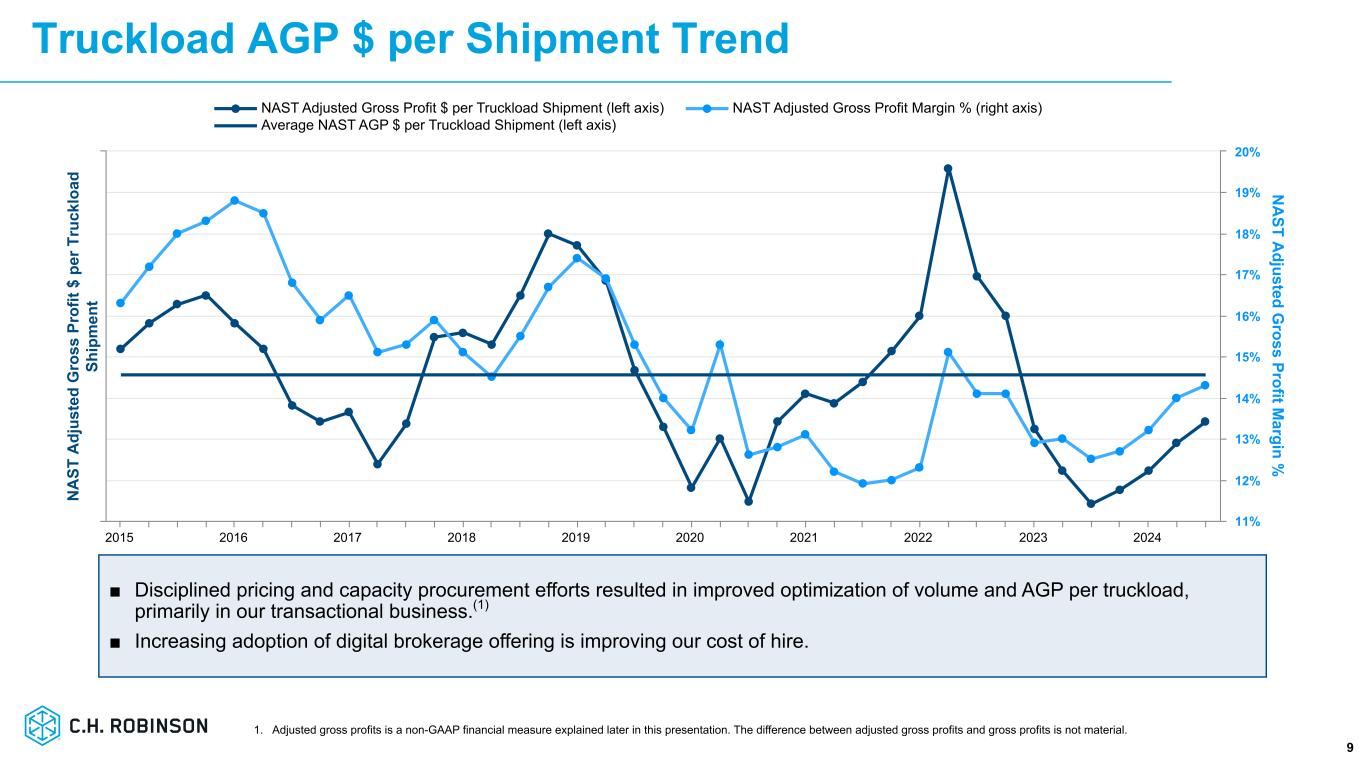 Truckload Price and Cost Change (1)(2)(3) 8 Truckload Q3 Volume(2)(4) -3.5 % Price/Mile(1)(2)(3) +2.5 % Cost/Mile(1)(2)(3) -0.5 % Adjusted Gross Profit(4) +16.6 % 1. Price and cost change represents YoY change for North America truckload shipments across all segments. 2. Growth rates are rounded to the nearest 0.5 percent. 3. Pricing and cost measures exclude fuel surcharges and costs. 4. Truckload volume and adjusted gross profit growth represents YoY change for NAST truckload. ■ 70% / 30% truckload contractual / transactional volume mix in Q3 ■ Average routing guide depth of 1.2 in Managed Services business vs. 1.2 in Q3 last year Yo Y % C ha ng e in P ric e an d C os t p er M ile YoY Price Change YoY Cost Change 2016 2017 2018 2019 2020 2021 2022 2023 2024 -30% -20% -10% 0% 10% 20% 30% 40% 50%