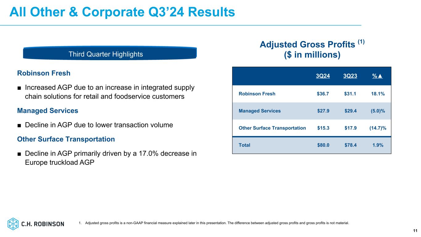 Global Forwarding Q3’24 Results by Service 10 3Q24 3Q23 %▲ Ocean $163.3 $103.8 57.4% Air $33.1 $29.7 11.4% Customs $28.3 $24.9 13.5% Other $9.9 $11.5 (13.3)% Total Adjusted Gross Profits $234.6 $169.9 38.1% Adjusted Gross Profit Margin % 20.6% 23.6% (300 bps) Adjusted Gross Profits (1) ($ in millions) ■ Ongoing conflict in the Red Sea continues to cause transit interruptions and vessel re-routing, which has put a strain on ocean capacity, resulted in port congestion and equipment shortages and driven rates higher Y/Y ■ Ocean AGP increased due to a 47.0% increase in AGP per shipment and a 7.0% increase in shipments(2) ■ Air AGP increased due to a 20.0% increase in metric tons shipped, partially offset by a 7.0% decrease in AGP per metric ton shipped(2) ■ Customs AGP increased due to a 6.5% increase in volume and 7.0% increase in adjusted gross profit per transaction(2) 1. Adjusted gross profits and adjusted gross profit margin % are non-GAAP financial measures explained later in this presentation. The difference between adjusted gross profits and gross profits is not material. 2. Growth rates are rounded to the nearest 0.5 percent. Third Quarter Highlights