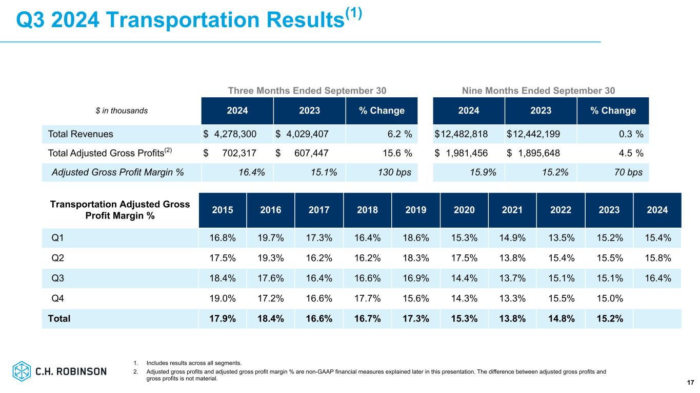 21 Our adjusted gross profit and adjusted gross profit margin are non-GAAP financial measures. Adjusted gross profit is calculated as gross profit excluding amortization of internally developed software utilized to directly serve our customers and contracted carriers. Adjusted gross profit margin is calculated as adjusted gross profit divided by total revenues. We believe adjusted gross profit and adjusted gross profit margin are useful measures of our ability to source, add value, and sell services and products that are provided by third parties, and we consider adjusted gross profit to be a primary performance measurement. The reconciliation of gross profit to adjusted gross profit and gross profit margin to adjusted gross profit margin are presented below: Three Months Ended September 30 Nine Months Ended September 30, $ in thousands 2024 2023 2024 2023 Revenues: Transportation $ 4,278,300 $ 4,029,407 $ 12,482,818 $ 12,442,199 Sourcing 366,341 311,623 1,057,482 932,357 Total Revenues $ 4,644,641 $ 4,341,030 $ 13,540,300 $ 13,374,556 Costs and expenses: Purchased transportation and related services 3,575,983 3,421,960 10,501,362 10,546,551 Purchased produced sourced for resale 333,405 284,221 958,547 842,020 Direct internally developed software amortization 11,441 8,233 32,546 24,299 Total direct costs $ 3,920,829 $ 3,714,414 $ 11,492,455 $ 11,412,870 Gross profit & Gross profit margin $ 723,812 15.6% $ 626,616 14.4% $ 2,047,845 15.1% $ 1,961,686 14.7% Plus: Direct internally developed software amortization 11,441 8,233 32,546 24,299 Adjusted gross profit/Adjusted gross profit margin $ 735,253 15.8% $ 634,849 14.6% $ 2,080,391 15.4% $ 1,985,985 14.8% Non-GAAP Reconciliations