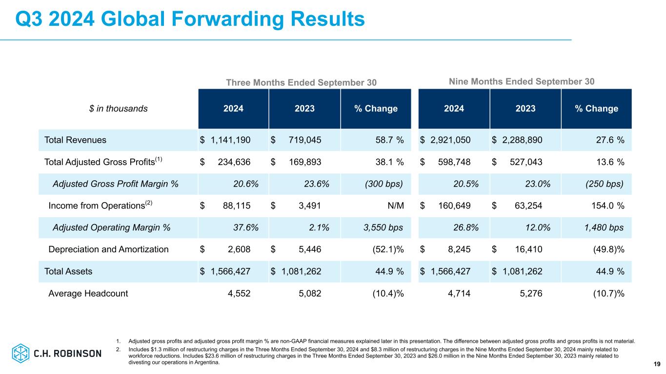 Non-GAAP Reconciliations 23 Our adjusted income (loss) from operations, adjusted operating margin - excluding restructuring and loss on divestiture, adjusted net income and adjusted net income per share (diluted) are non-GAAP financial measures. These non-GAAP measures are calculated excluding the impact of restructuring, losses from divestitures, and foreign currency losses from our Argentina operations. We believe that these measures provide useful information to investors and include them within our internal reporting to our chief operating decision maker. Accordingly, the discussion of our results of operations includes discussion on the changes in our adjusted income (loss) from operations, adjusted operating margin - excluding restructuring and loss on divestiture, adjusted net income and adjusted net income per share (diluted). The reconciliation of these non-GAAP measures are presented below (in thousands except per share data): Three Months Ended September 30, 2024 Nine Months Ended September 30, 2024 NAST Global Forwarding All Other and Corporate Consolidated NAST Global Forwarding All Other and Corporate Consolidated Income (loss) from operations $ 148,767 $ 88,115 $ (56,763) $ 180,119 $ 398,764 $ 160,649 $ (74,071) $ 485,342 Severance and other personnel expenses 1,238 461 1,221 2,920 9,022 5,855 5,430 20,307 Other selling, general, and administrative expenses 560 855 57,130 58,545 6,214 2,448 60,630 69,292 Total adjustments to income (loss) from operations(1)(2) 1,798 1,316 58,351 61,465 15,236 8,303 66,060 89,599 Adjusted income from operations $ 150,565 $ 89,431 $ 1,588 $ 241,584 $ 414,000 $ 168,952 $ (8,011) $ 574,941 Adjusted gross profit $ 420,664 $ 234,636 $ 79,953 $ 735,253 $ 1,237,431 $ 598,748 $ 244,212 $ 2,080,391 Adjusted income from operations 150,565 89,431 1,588 241,584 414,000 168,952 (8,011) 574,941 Adjusted operating margin - excluding restructuring and loss on divestiture 35.8% 38.1% 2.0% 32.9% 33.5% 28.2% N/M 27.6% $ in 000's per share $ in 000's per share Net income and per share (diluted) $ 97,229 $ 0.80 $ 316,384 $ 2.63 Restructuring and related costs, pre-tax 4,429 0.04 32,563 0.28 Loss on divestiture, pre-tax 57,036 0.47 57,036 0.47 Tax effect of adjustments (3,176) (0.03) (9,922) (0.08) Adjusted net income and per share (diluted) $ 155,518 $ 1.28 $ 396,061 $ 3.30 1. The Three Months Ended September 30, 2024 includes restructuring expenses of $2.9 million related to workforce reductions and $58.5 million of other charges, which includes a $57.0 million loss on the planned divestiture of our Europe Surface Transportation business. 2. The Nine Months Ended September 30, 2024 includes restructuring expenses of $20.3 million related to workforce reductions and $69.3 million of other charges, which includes a $57.0 million loss on the planned divestiture of our Europe Surface Transportation business, an impairment of internally developed software, and charges related to reducing our facilities footprint.