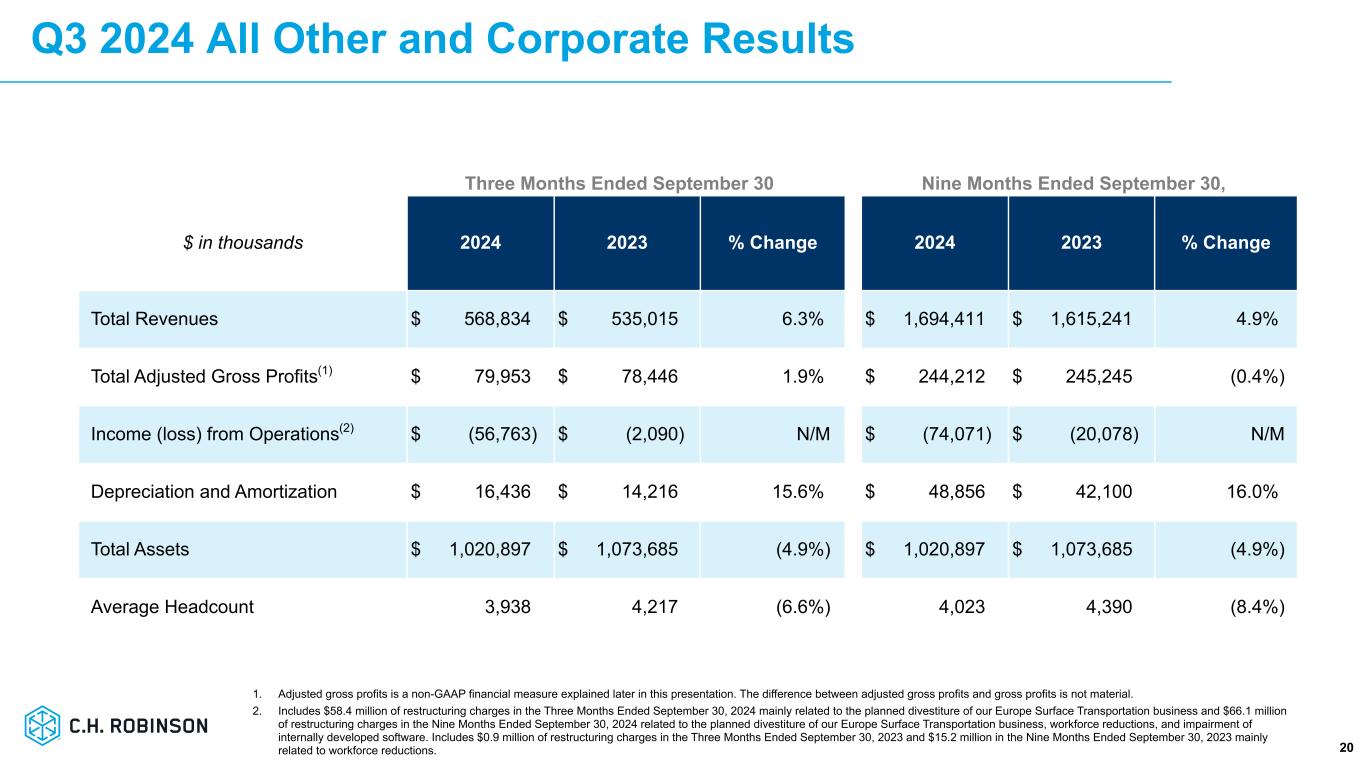 Non-GAAP Reconciliations 22 Our adjusted operating margin is a non-GAAP financial measure calculated as operating income divided by adjusted gross profit. Our adjusted operating margin - excluding restructuring and loss on divestiture is a similar non-GAAP financial measure to adjusted operating margin, but also excludes the impact of restructuring and loss on divestiture. We believe adjusted operating margin and adjusted operating margin - excluding restructuring and loss on divestiture are useful measures of our profitability in comparison to our adjusted gross profit, which we consider a primary performance metric as discussed above. The comparisons of operating margin to adjusted operating margin and adjusted operating margin - excluding restructuring and loss on divestiture are presented below: Three Months Ended September 30 Nine Months Ended September 30, $ in thousands 2024 2023 2024 2023 Total Revenues $ 4,644,641 $ 4,341,030 $ 13,540,300 $ 13,374,556 Income from operations 180,119 113,522 485,342 407,178 Operating margin 3.9% 2.6% 3.6% 3.0% Adjusted gross profit $ 735,253 $ 634,849 $ 2,080,391 $ 1,985,985 Income from operations 180,119 113,522 485,342 407,178 Adjusted operating margin 24.5% 17.9% 23.3% 20.5% Adjusted gross profit $ 735,253 $ 634,849 $ 2,080,391 $ 1,985,985 Adjusted income from operations(1) 241,584 137,985 574,941 449,495 Adjusted operating margin - excluding restructuring and loss on divestiture 32.9% 21.7% 27.6% 22.6% 1. In the Three Months Ended September 30, 2024, we incurred restructuring expenses of $2.9 million related to workforce reductions and $58.5 million of other charges, which includes a $57.0 million loss on the planned divestiture of our Europe Surface Transportation business. In the Nine Months Ended September 30, 2024 we incurred restructuring expenses of $20.3 million related to workforce reductions and $69.3 million of other charges, which includes a $57.0 million loss on the planned divestiture of our Europe Surface Transportation business, an impairment of internally developed software, and charges related to reducing our facilities footprint. In the Three Months Ended September 30, 2023, we incurred restructuring expenses of $3.0 million related to workforce reductions and $21.4 million of other charges, primarily related to the divestiture of our operations in Argentina. In the Nine Months Ended September 30, 2023, we incurred restructuring expenses of $19.7 million related to workforce reductions and $22.6 million of other charges, primarily related to the divestiture of our operations in Argentina.