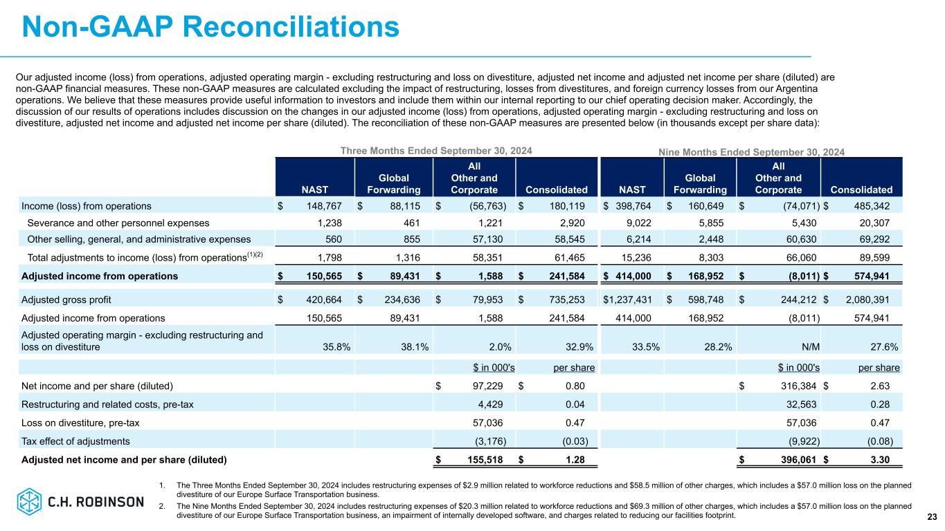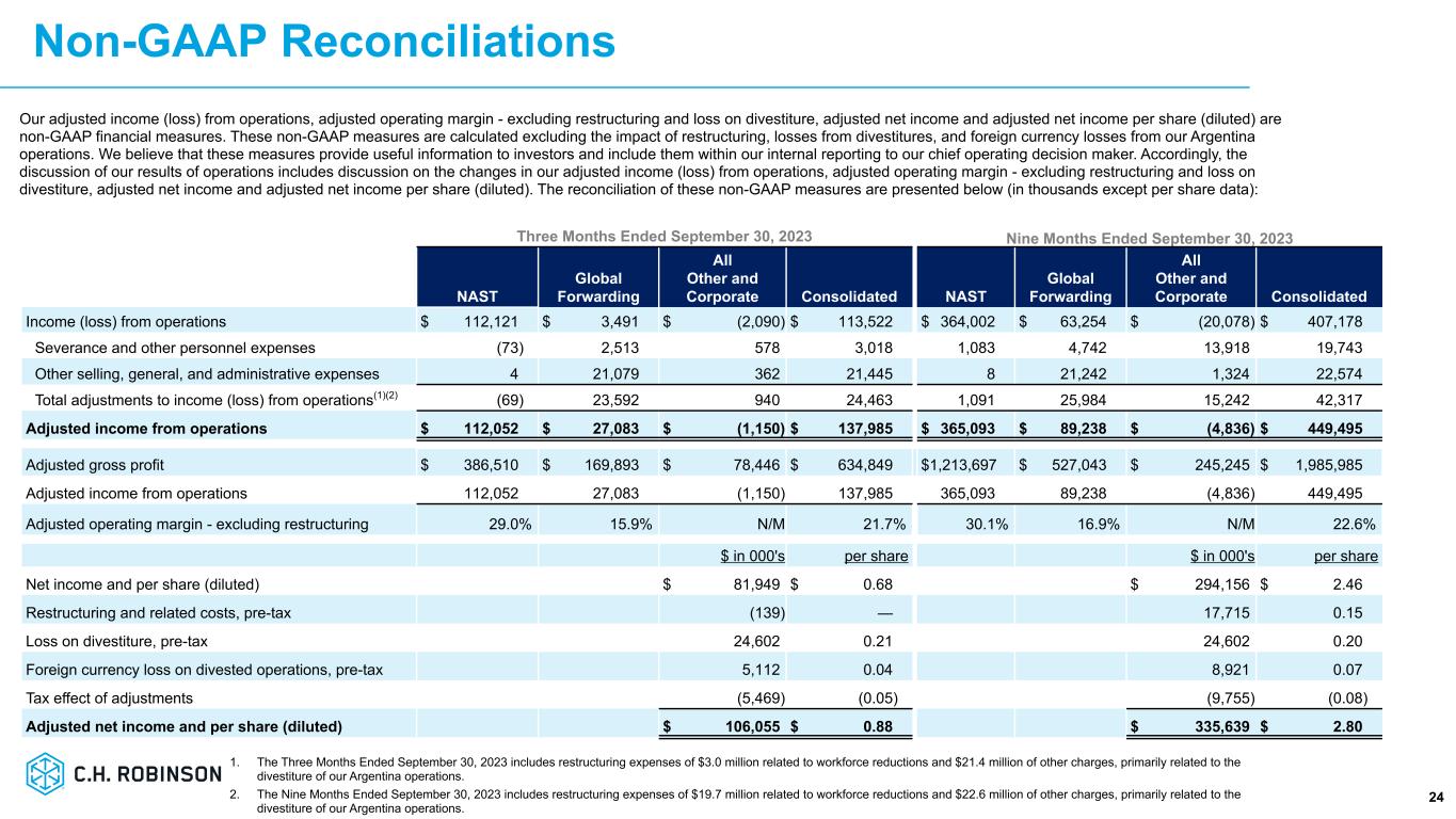 Non-GAAP Reconciliations 24 Our adjusted income (loss) from operations, adjusted operating margin - excluding restructuring and loss on divestiture, adjusted net income and adjusted net income per share (diluted) are non-GAAP financial measures. These non-GAAP measures are calculated excluding the impact of restructuring, losses from divestitures, and foreign currency losses from our Argentina operations. We believe that these measures provide useful information to investors and include them within our internal reporting to our chief operating decision maker. Accordingly, the discussion of our results of operations includes discussion on the changes in our adjusted income (loss) from operations, adjusted operating margin - excluding restructuring and loss on divestiture, adjusted net income and adjusted net income per share (diluted). The reconciliation of these non-GAAP measures are presented below (in thousands except per share data): Three Months Ended September 30, 2023 Nine Months Ended September 30, 2023 NAST Global Forwarding All Other and Corporate Consolidated NAST Global Forwarding All Other and Corporate Consolidated Income (loss) from operations $ 112,121 $ 3,491 $ (2,090) $ 113,522 $ 364,002 $ 63,254 $ (20,078) $ 407,178 Severance and other personnel expenses (73) 2,513 578 3,018 1,083 4,742 13,918 19,743 Other selling, general, and administrative expenses 4 21,079 362 21,445 8 21,242 1,324 22,574 Total adjustments to income (loss) from operations(1)(2) (69) 23,592 940 24,463 1,091 25,984 15,242 42,317 Adjusted income from operations $ 112,052 $ 27,083 $ (1,150) $ 137,985 $ 365,093 $ 89,238 $ (4,836) $ 449,495 Adjusted gross profit $ 386,510 $ 169,893 $ 78,446 $ 634,849 $ 1,213,697 $ 527,043 $ 245,245 $ 1,985,985 Adjusted income from operations 112,052 27,083 (1,150) 137,985 365,093 89,238 (4,836) 449,495 Adjusted operating margin - excluding restructuring 29.0% 15.9% N/M 21.7% 30.1% 16.9% N/M 22.6% $ in 000's per share $ in 000's per share Net income and per share (diluted) $ 81,949 $ 0.68 $ 294,156 $ 2.46 Restructuring and related costs, pre-tax (139) — 17,715 0.15 Loss on divestiture, pre-tax 24,602 0.21 24,602 0.20 Foreign currency loss on divested operations, pre-tax 5,112 0.04 8,921 0.07 Tax effect of adjustments (5,469) (0.05) (9,755) (0.08) Adjusted net income and per share (diluted) $ 106,055 $ 0.88 $ 335,639 $ 2.80 1. The Three Months Ended September 30, 2023 includes restructuring expenses of $3.0 million related to workforce reductions and $21.4 million of other charges, primarily related to the divestiture of our Argentina operations. 2. The Nine Months Ended September 30, 2023 includes restructuring expenses of $19.7 million related to workforce reductions and $22.6 million of other charges, primarily related to the divestiture of our Argentina operations.