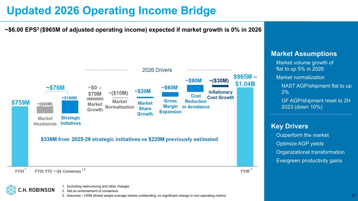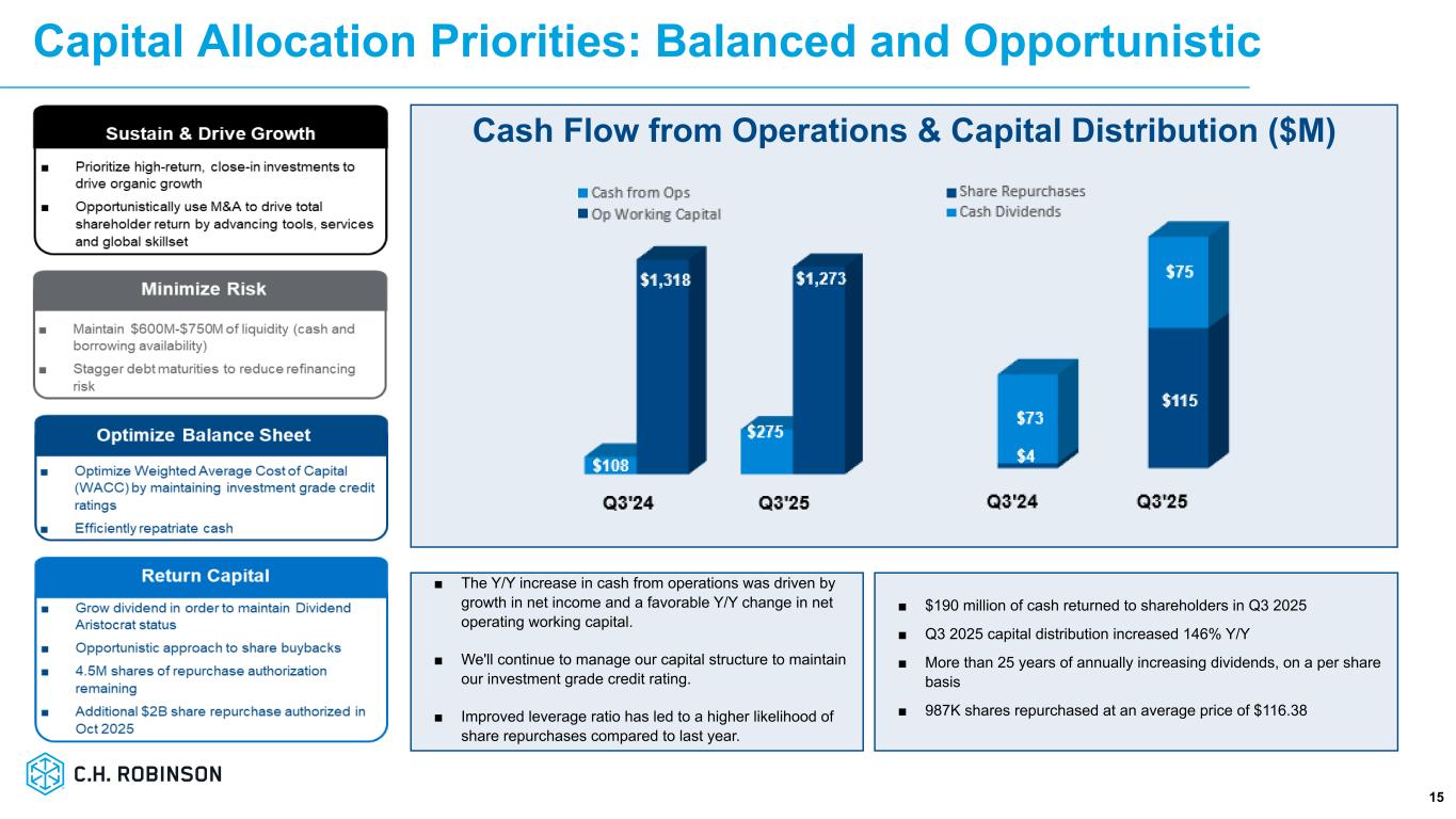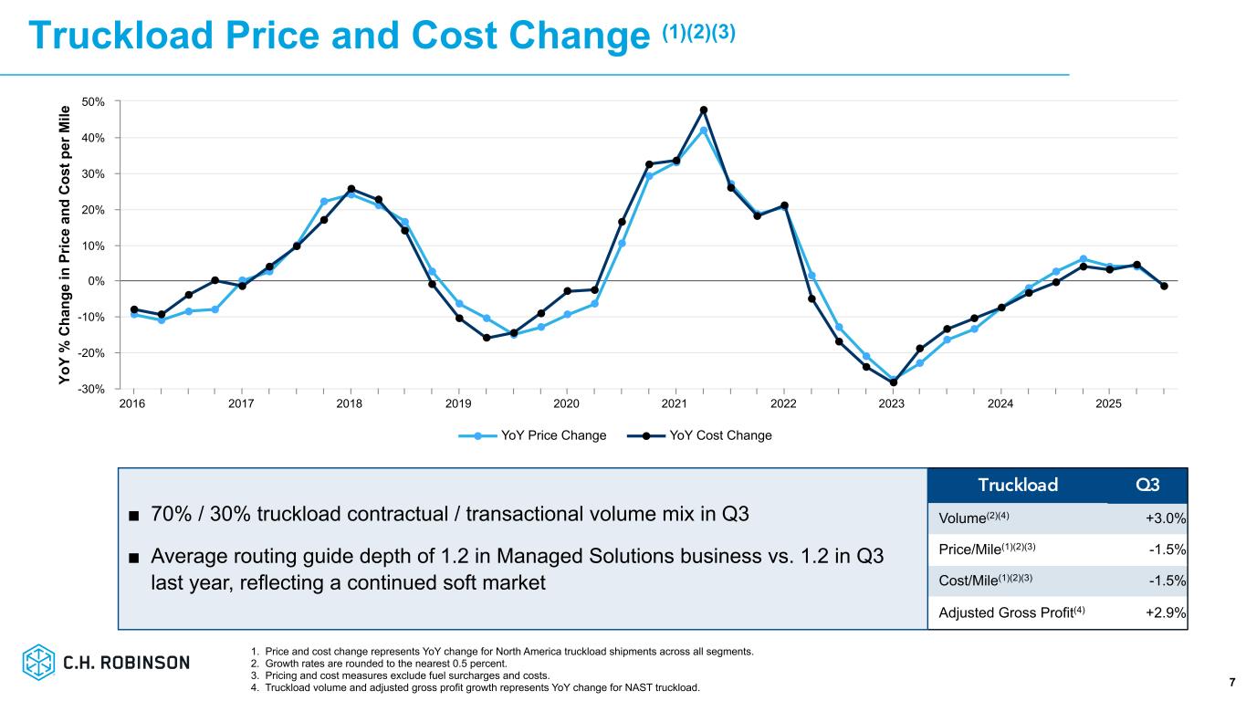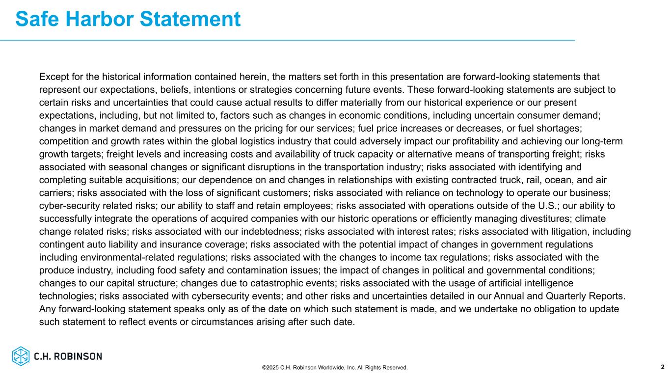 Safe Harbor Statement Except for the historical information contained herein, the matters set forth in this presentation are forward-looking statements that represent our expectations, beliefs, intentions or strategies concerning future events. These forward-looking statements are subject to certain risks and uncertainties that could cause actual results to differ materially from our historical experience or our present expectations, including, but not limited to, factors such as changes in economic conditions, including uncertain consumer demand; changes in market demand and pressures on the pricing for our services; fuel price increases or decreases, or fuel shortages; competition and growth rates within the global logistics industry that could adversely impact our profitability and achieving our long-term growth targets; freight levels and increasing costs and availability of truck capacity or alternative means of transporting freight; risks associated with seasonal changes or significant disruptions in the transportation industry; risks associated with identifying and completing suitable acquisitions; our dependence on and changes in relationships with existing contracted truck, rail, ocean, and air carriers; risks associated with the loss of significant customers; risks associated with reliance on technology to operate our business; cyber-security related risks; our ability to staff and retain employees; risks associated with operations outside of the U.S.; our ability to successfully integrate the operations of acquired companies with our historic operations or efficiently managing divestitures; climate change related risks; risks associated with our indebtedness; risks associated with interest rates; risks associated with litigation, including contingent auto liability and insurance coverage; risks associated with the potential impact of changes in government regulations including environmental-related regulations; risks associated with the changes to income tax regulations; risks associated with the produce industry, including food safety and contamination issues; the impact of changes in political and governmental conditions; changes to our capital structure; changes due to catastrophic events; risks associated with the usage of artificial intelligence technologies; risks associated with cybersecurity events; and other risks and uncertainties detailed in our Annual and Quarterly Reports. Any forward-looking statement speaks only as of the date on which such statement is made, and we undertake no obligation to update such statement to reflect events or circumstances arising after such date. 2©2025 C.H. Robinson Worldwide, Inc. All Rights Reserved.