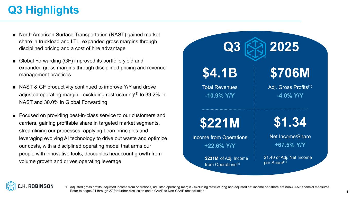 Thoughts from President & CEO, Dave Bozeman 3 ■ Q3 results provide another proof point of the disciplined execution of our strategy. ■ In NAST, we grew our combined truckload and LTL volume by approximately 3.0% year-over-year and demonstrably grew market share vs. a 7.2% decline in the Cass Freight Shipment Index. This was accomplished while expanding gross margins for the 8th consecutive quarter and further increasing productivity and operating leverage while growing volume. ■ In Global Forwarding, we expanded gross margins by 380 basis points year-over- year through improved revenue management discipline. We also continued to improve our productivity, which has now increased by more than 55% in Global Forwarding since the end of 2022. This improvement in our operating leverage enabled us to achieve our 30% mid-cycle adjusted operating margin target in Q3, despite difficult market conditions. ■ With seven consecutive quarters of consistent outperformance through the disciplined execution of the strategy that we shared at our 2024 Investor Day, there is no doubt in our minds that we are on the right path to deliver sustainable outperformance.