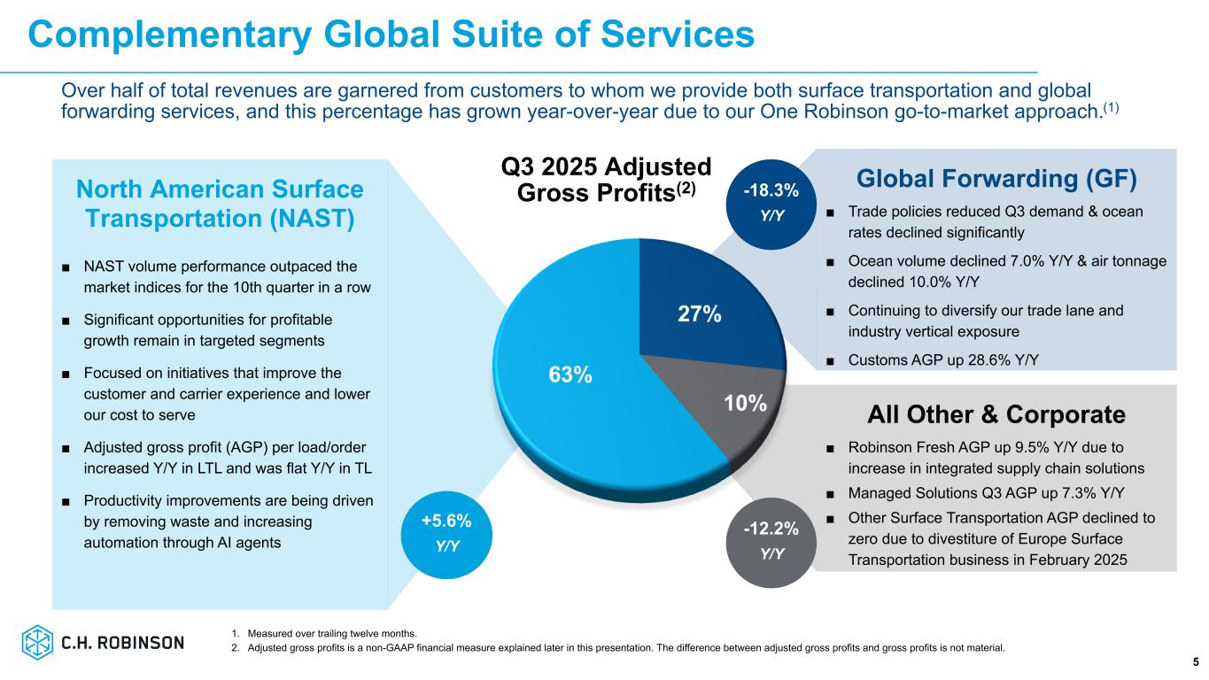 Q3 Highlights 4 ■ North American Surface Transportation (NAST) gained market share in truckload and LTL, expanded gross margins through disciplined pricing and a cost of hire advantage ■ Global Forwarding (GF) improved its portfolio yield and expanded gross margins through disciplined pricing and revenue management practices ■ NAST & GF productivity continued to improve Y/Y and drove adjusted operating margin - excluding restructuring(1) to 39.2% in NAST and 30.0% in Global Forwarding ■ Focused on providing best-in-class service to our customers and carriers, gaining profitable share in targeted market segments, streamlining our processes, applying Lean principles and leveraging evolving AI technology to drive out waste and optimize our costs, with a disciplined operating model that arms our people with innovative tools, decouples headcount growth from volume growth and drives operating leverage $4.1B Total Revenues -10.9% Y/Y $706M Adj. Gross Profits(1) -4.0% Y/Y $221M Income from Operations +22.6% Y/Y $1.34 Net Income/Share +67.5% Y/Y Q3 2025 1. Adjusted gross profits, adjusted income from operations, adjusted operating margin - excluding restructuring and adjusted net income per share are non-GAAP financial measures. Refer to pages 24 through 27 for further discussion and a GAAP to Non-GAAP reconciliation. $231M of Adj. Income from Operations(1) $1.40 of Adj. Net Income per Share(1)