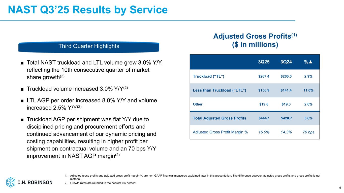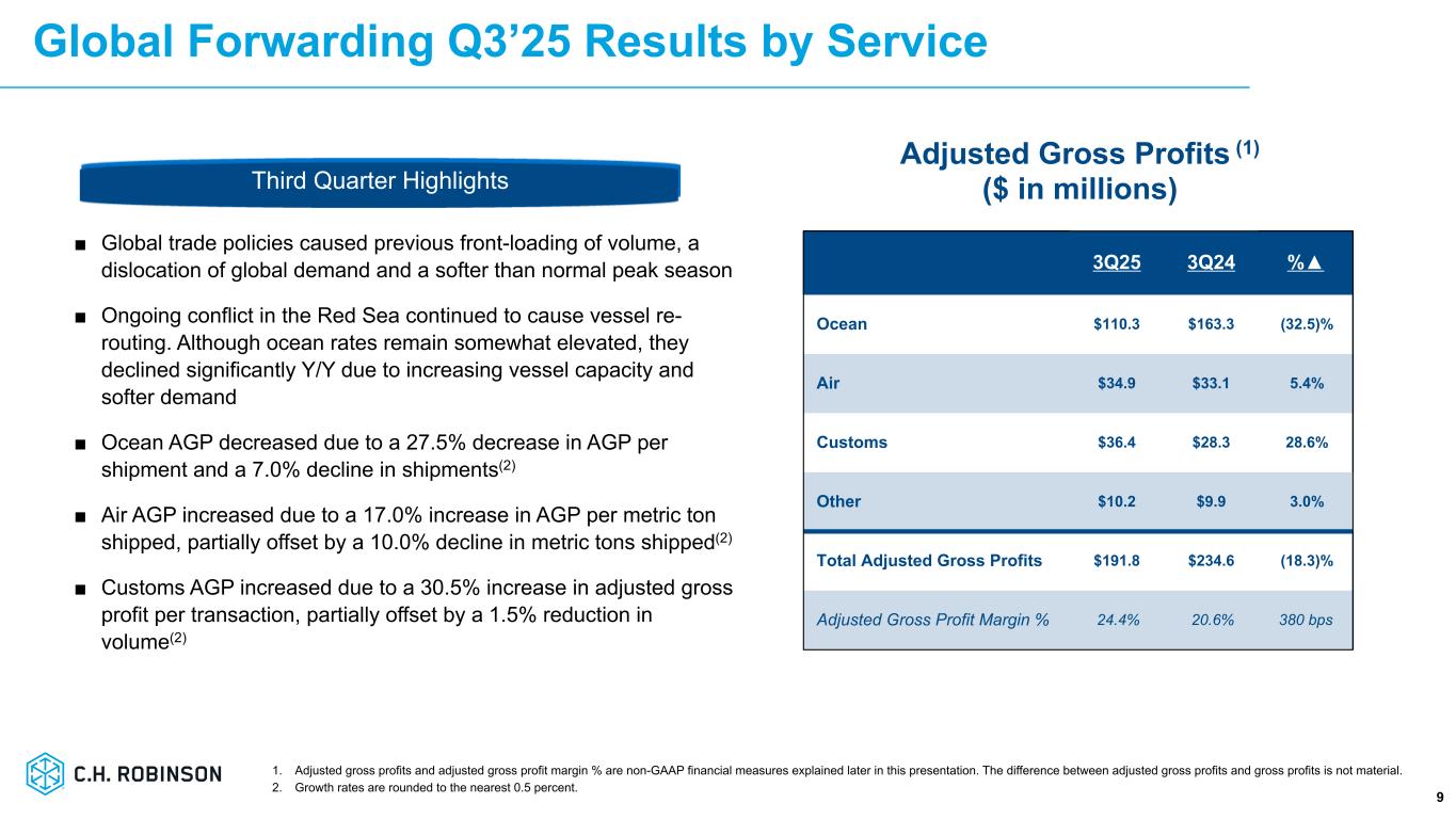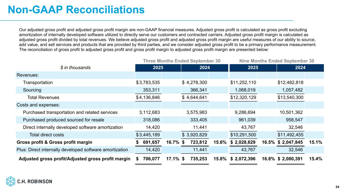 24 Our adjusted gross profit and adjusted gross profit margin are non-GAAP financial measures. Adjusted gross profit is calculated as gross profit excluding amortization of internally developed software utilized to directly serve our customers and contracted carriers. Adjusted gross profit margin is calculated as adjusted gross profit divided by total revenues. We believe adjusted gross profit and adjusted gross profit margin are useful measures of our ability to source, add value, and sell services and products that are provided by third parties, and we consider adjusted gross profit to be a primary performance measurement. The reconciliation of gross profit to adjusted gross profit and gross profit margin to adjusted gross profit margin are presented below: Three Months Ended September 30 Nine Months Ended September 30 $ in thousands 2025 2024 2025 2024 Revenues: Transportation $ 3,783,535 $ 4,278,300 $ 11,252,110 $ 12,482,818 Sourcing 353,311 366,341 1,068,019 1,057,482 Total Revenues $ 4,136,846 $ 4,644,641 $ 12,320,129 $ 13,540,300 Costs and expenses: Purchased transportation and related services 3,112,683 3,575,983 9,286,694 10,501,362 Purchased produced sourced for resale 318,086 333,405 961,039 958,547 Direct internally developed software amortization 14,420 11,441 43,767 32,546 Total direct costs $ 3,445,189 $ 3,920,829 $ 10,291,500 $ 11,492,455 Gross profit & Gross profit margin $ 691,657 16.7% $ 723,812 15.6% $ 2,028,629 16.5% $ 2,047,845 15.1% Plus: Direct internally developed software amortization 14,420 11,441 43,767 32,546 Adjusted gross profit/Adjusted gross profit margin $ 706,077 17.1% $ 735,253 15.8% $ 2,072,396 16.8% $ 2,080,391 15.4% Non-GAAP Reconciliations