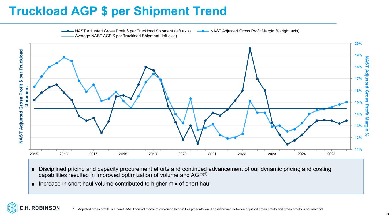 Truckload Price and Cost Change (1)(2)(3) 7 Truckload Q3 Volume(2)(4) +3.0 % Price/Mile(1)(2)(3) -1.5 % Cost/Mile(1)(2)(3) -1.5 % Adjusted Gross Profit(4) +2.9 % 1. Price and cost change represents YoY change for North America truckload shipments across all segments. 2. Growth rates are rounded to the nearest 0.5 percent. 3. Pricing and cost measures exclude fuel surcharges and costs. 4. Truckload volume and adjusted gross profit growth represents YoY change for NAST truckload. ■ 70% / 30% truckload contractual / transactional volume mix in Q3 ■ Average routing guide depth of 1.2 in Managed Solutions business vs. 1.2 in Q3 last year, reflecting a continued soft market Yo Y % C ha ng e in P ric e an d C os t p er M ile YoY Price Change YoY Cost Change 2016 2017 2018 2019 2020 2021 2022 2023 2024 2025 -30% -20% -10% 0% 10% 20% 30% 40% 50%