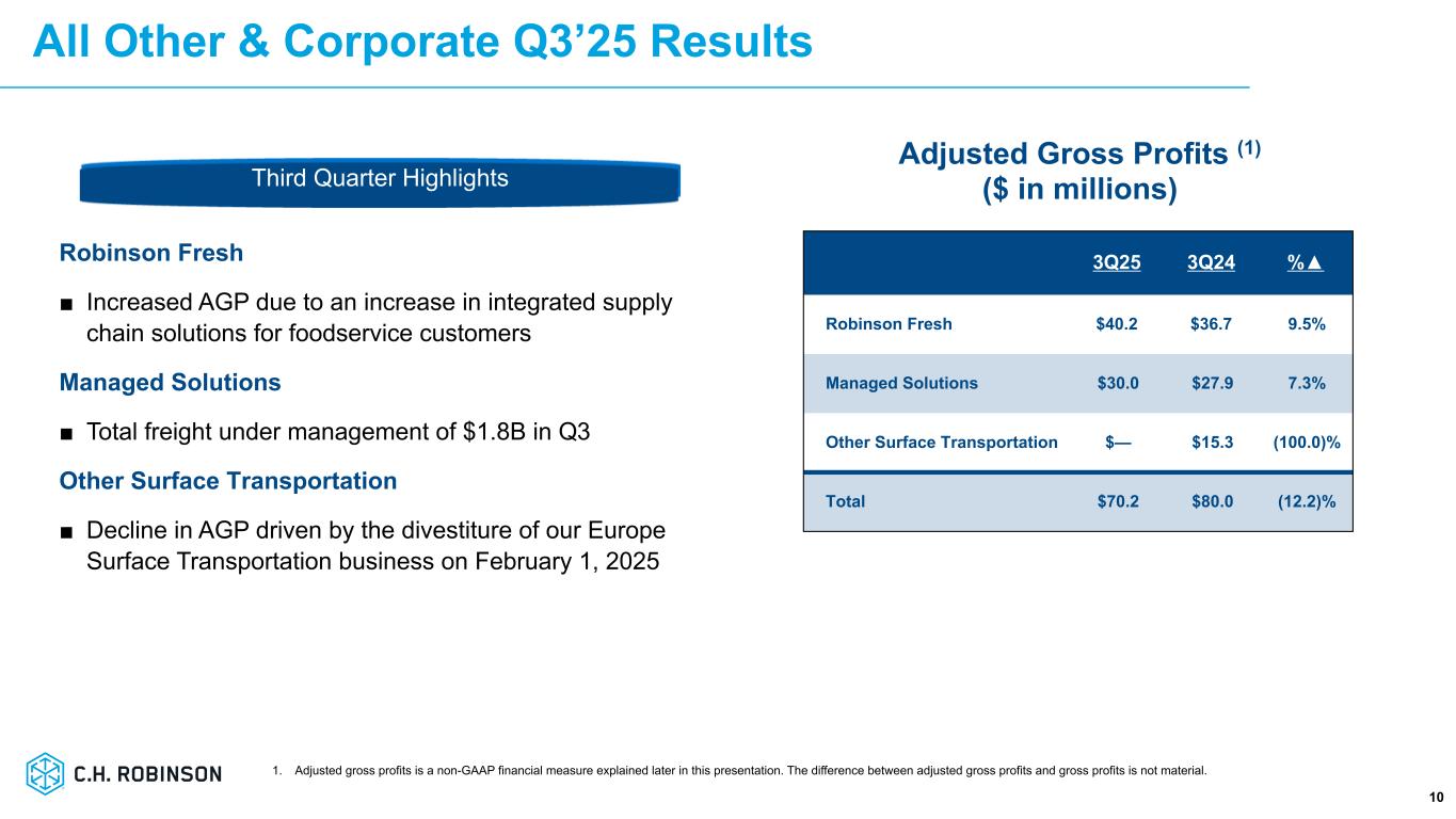 Global Forwarding Q3’25 Results by Service 9 3Q25 3Q24 %▲ Ocean $110.3 $163.3 (32.5)% Air $34.9 $33.1 5.4% Customs $36.4 $28.3 28.6% Other $10.2 $9.9 3.0% Total Adjusted Gross Profits $191.8 $234.6 (18.3)% Adjusted Gross Profit Margin % 24.4% 20.6% 380 bps Adjusted Gross Profits (1) ($ in millions) ■ Global trade policies caused previous front-loading of volume, a dislocation of global demand and a softer than normal peak season ■ Ongoing conflict in the Red Sea continued to cause vessel re- routing. Although ocean rates remain somewhat elevated, they declined significantly Y/Y due to increasing vessel capacity and softer demand ■ Ocean AGP decreased due to a 27.5% decrease in AGP per shipment and a 7.0% decline in shipments(2) ■ Air AGP increased due to a 17.0% increase in AGP per metric ton shipped, partially offset by a 10.0% decline in metric tons shipped(2) ■ Customs AGP increased due to a 30.5% increase in adjusted gross profit per transaction, partially offset by a 1.5% reduction in volume(2) 1. Adjusted gross profits and adjusted gross profit margin % are non-GAAP financial measures explained later in this presentation. The difference between adjusted gross profits and gross profits is not material. 2. Growth rates are rounded to the nearest 0.5 percent. Third Quarter Highlights