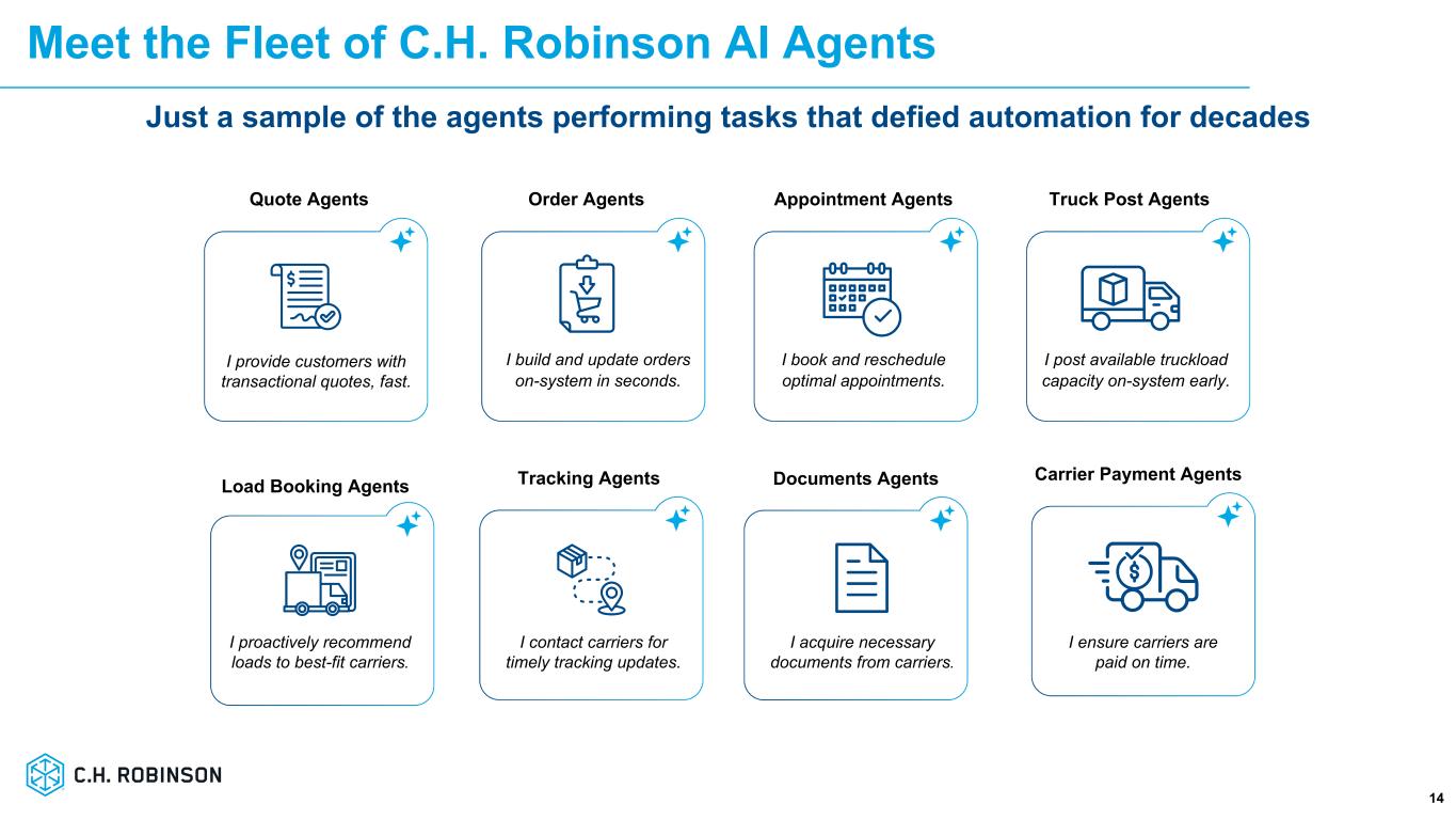 I provide customers with transactional quotes, fast. Quote Agents I build and update orders on-system in seconds. Order Agents I contact carriers for timely tracking updates. Tracking Agents I book and reschedule optimal appointments. Appointment Agents I post available truckload capacity on-system early. Truck Post Agents I proactively recommend loads to best-fit carriers. Load Booking Agents I acquire necessary documents from carriers. Documents Agents I ensure carriers are paid on time. Carrier Payment Agents Meet the Fleet of C.H. Robinson AI Agents 14 Just a sample of the agents performing tasks that defied automation for decades